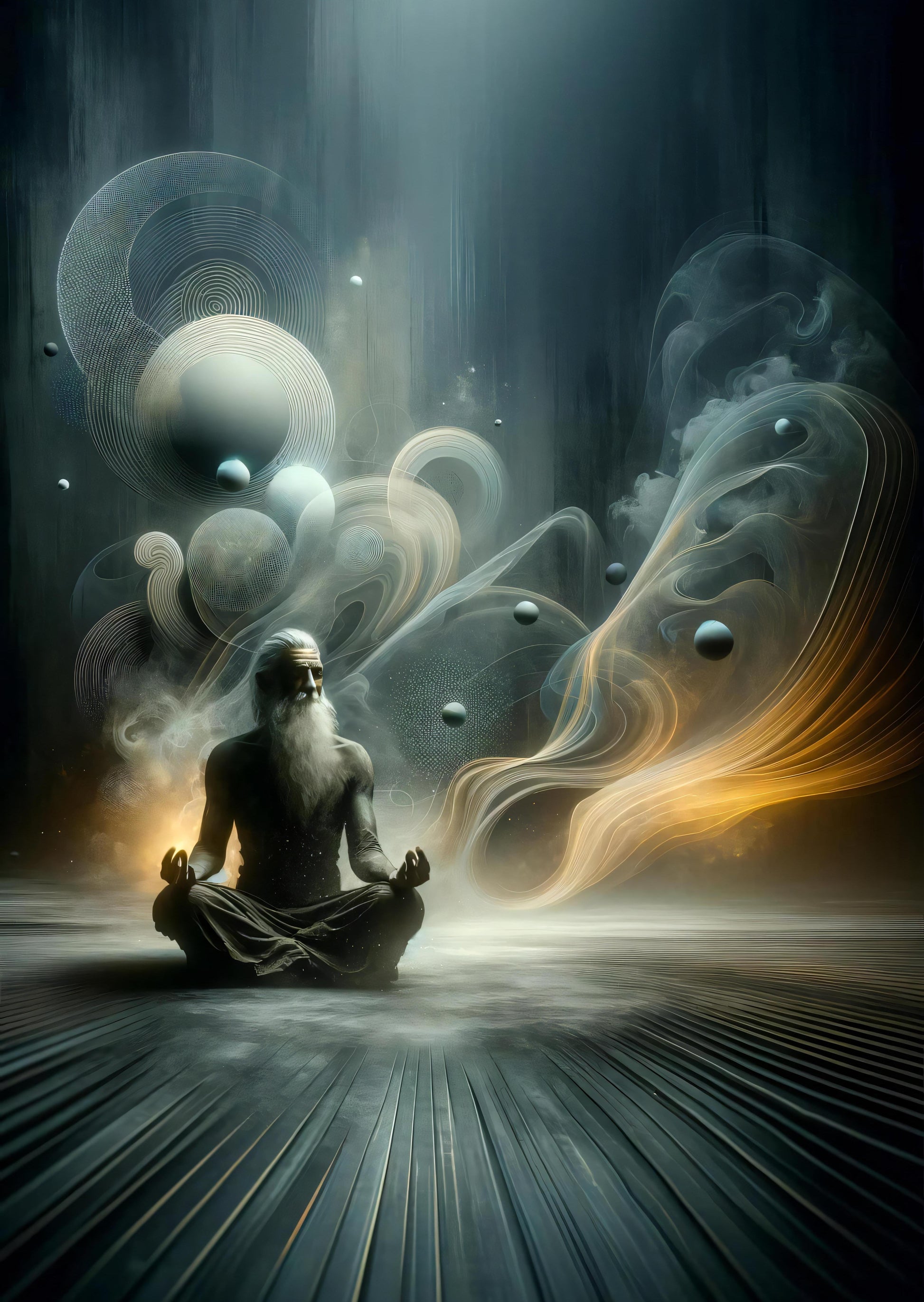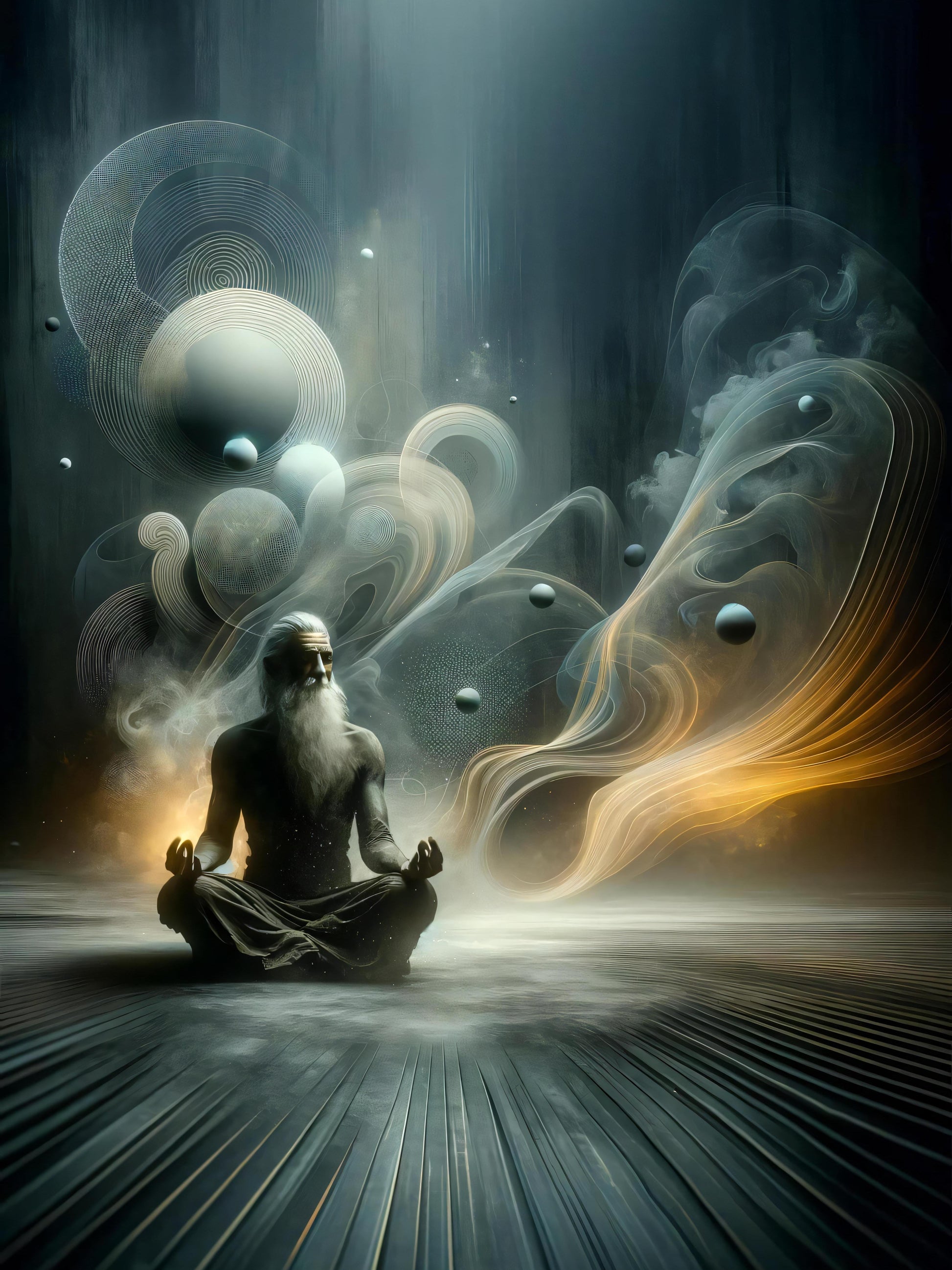 Delve into the depths of the subconscious with this captivating visualization of meditation and mindfulness In this image we observe a figure immersed in the act of meditation as ethereal forms swirl around conjuring concepts of thought flow and the mind's boundless realms The subject seated in a contemplative posture amidst a backdrop shrouded by mystery and atmospheric elements offers a glimpse into the psychological exploration of inner space and mental clarity Witness the dance between cognitive processes and enlightened revelation in a scene that both illuminates and challenges our perception of mental practices.