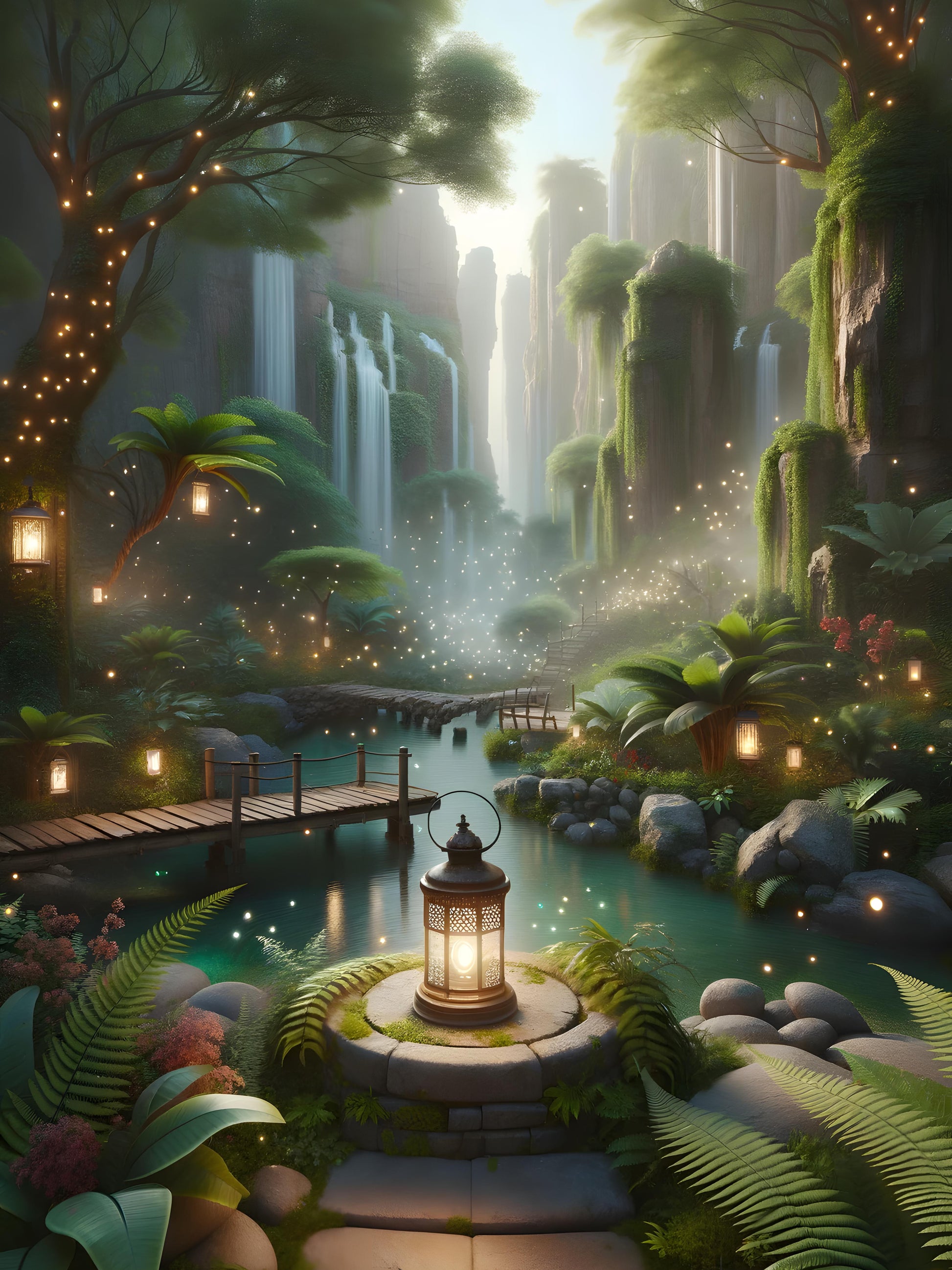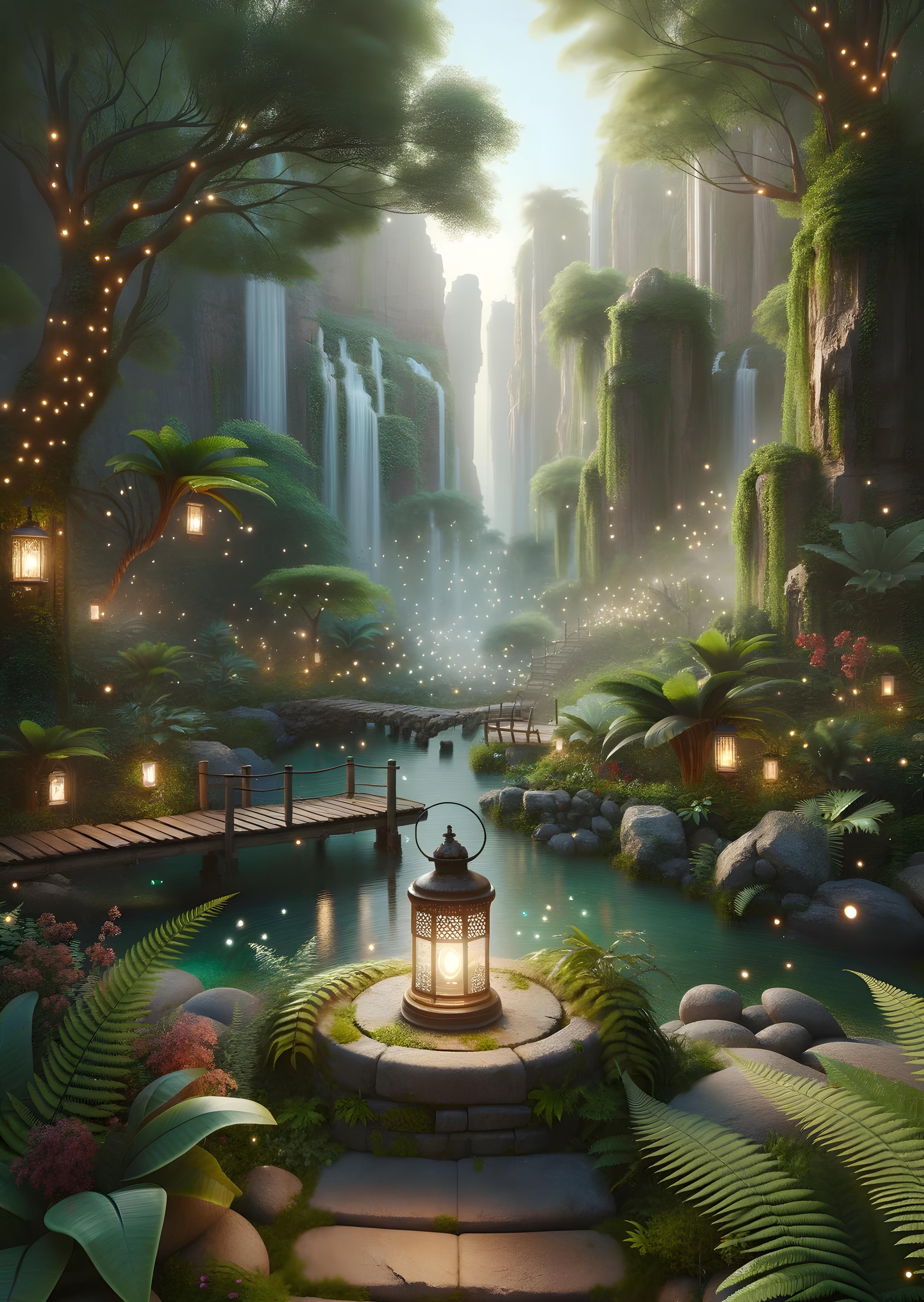 In a hidden glade, illuminated by the soft glow of lanterns, a secluded paradise exists where waterfalls cascade into a crystal clear stream. Lush greenery envelopes the space, creating a natural amphitheater that amplifies the soothing sounds of falling water. Fireflies dance amidst the foliage, their bioluminescent lights mingling with the twinkling orbs strung amongst the boughs. A wooden bridge invites visitors to cross into this dreamscape, leading to stone steps that meander into the heart of the grove. The scene is a testament to the breathtaking beauty that thrives in seclusion, untouched by the outside world, exuding an aura of peace and captivating allure.