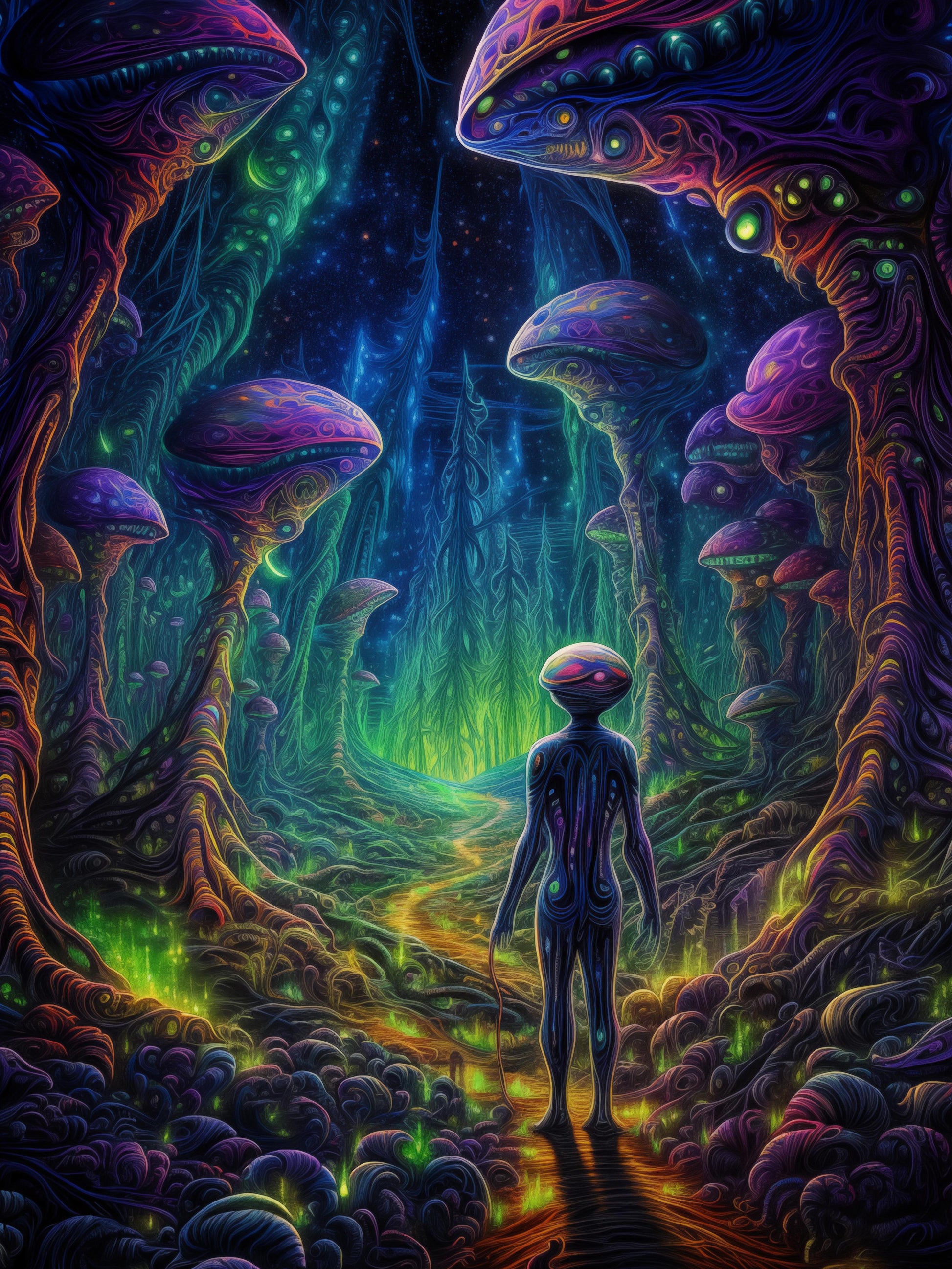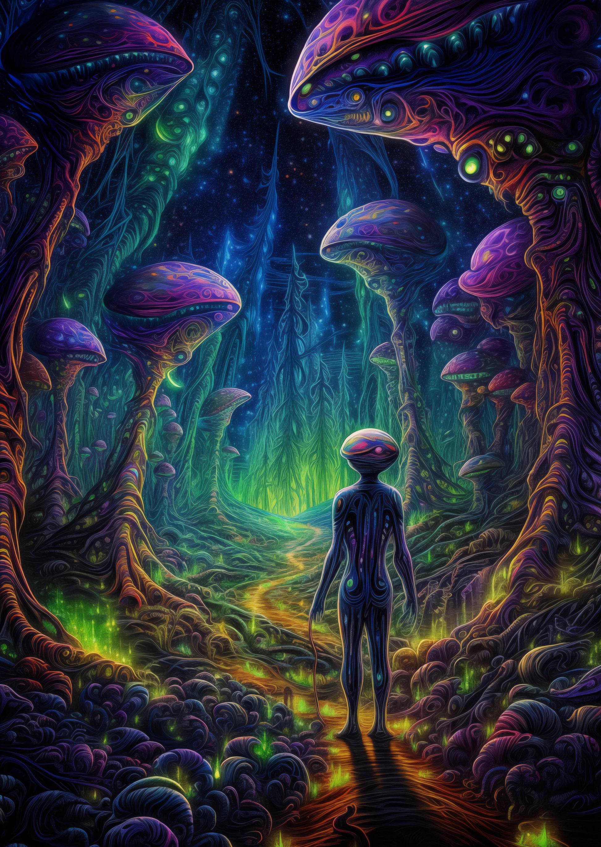In a vibrant alien forest illuminated by an astral glow, a lone figure with an otherworldly appearance looks towards a path that leads into the unknown depths of a luminous woodland. Towering around the figure, immense mushrooms with intricate patterns pulse with an inner light, suggesting a living landscape that hums with unseen energy. The creature's sleek form mirrors the delicate balance between the fantastical flora and the cosmic backdrop, hinting at a connection between the being and its mesmerizing surroundings. This colorful, dreamlike world invites the imagination to ponder the stories and secrets that lie beyond the threshold of our own reality.