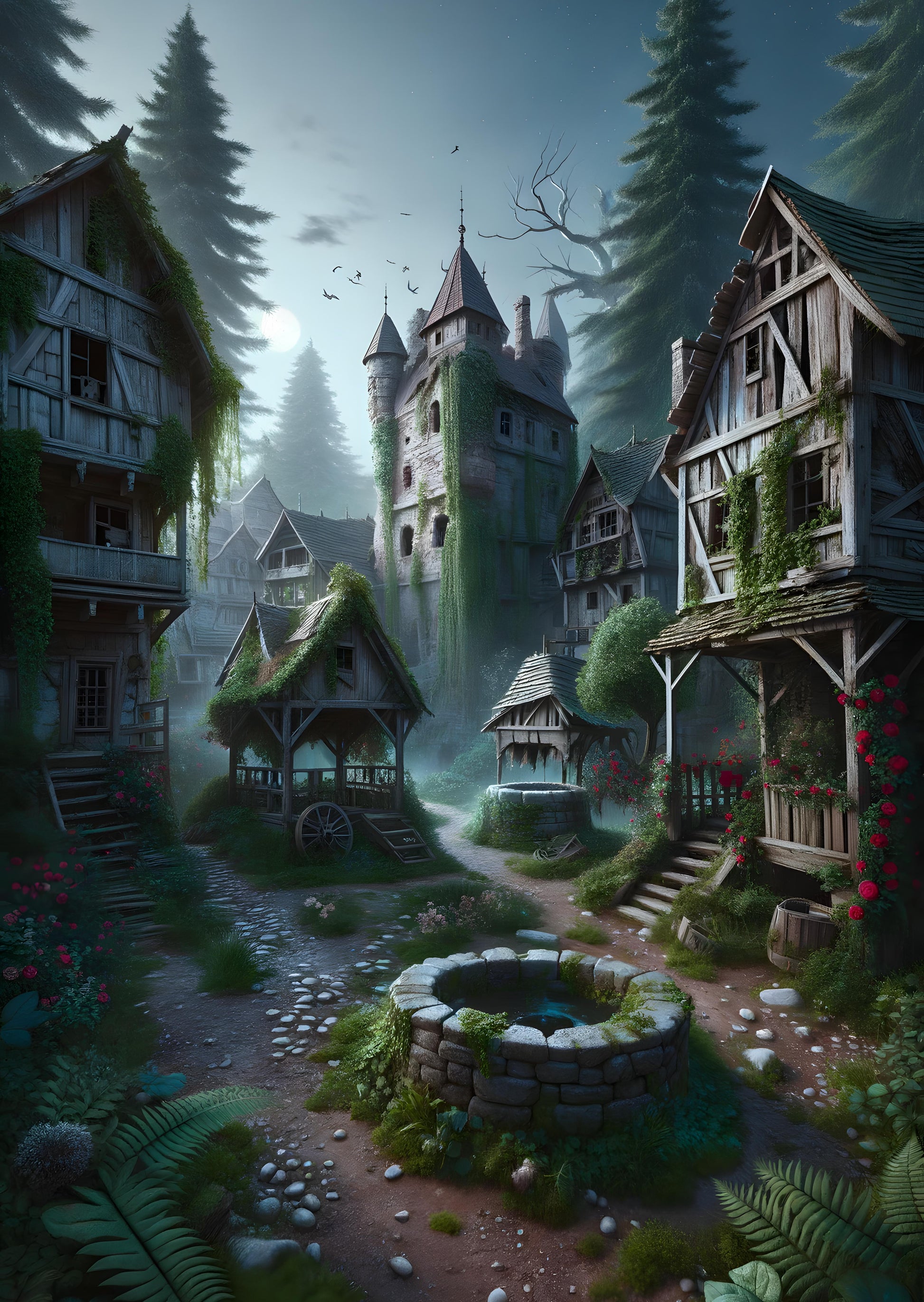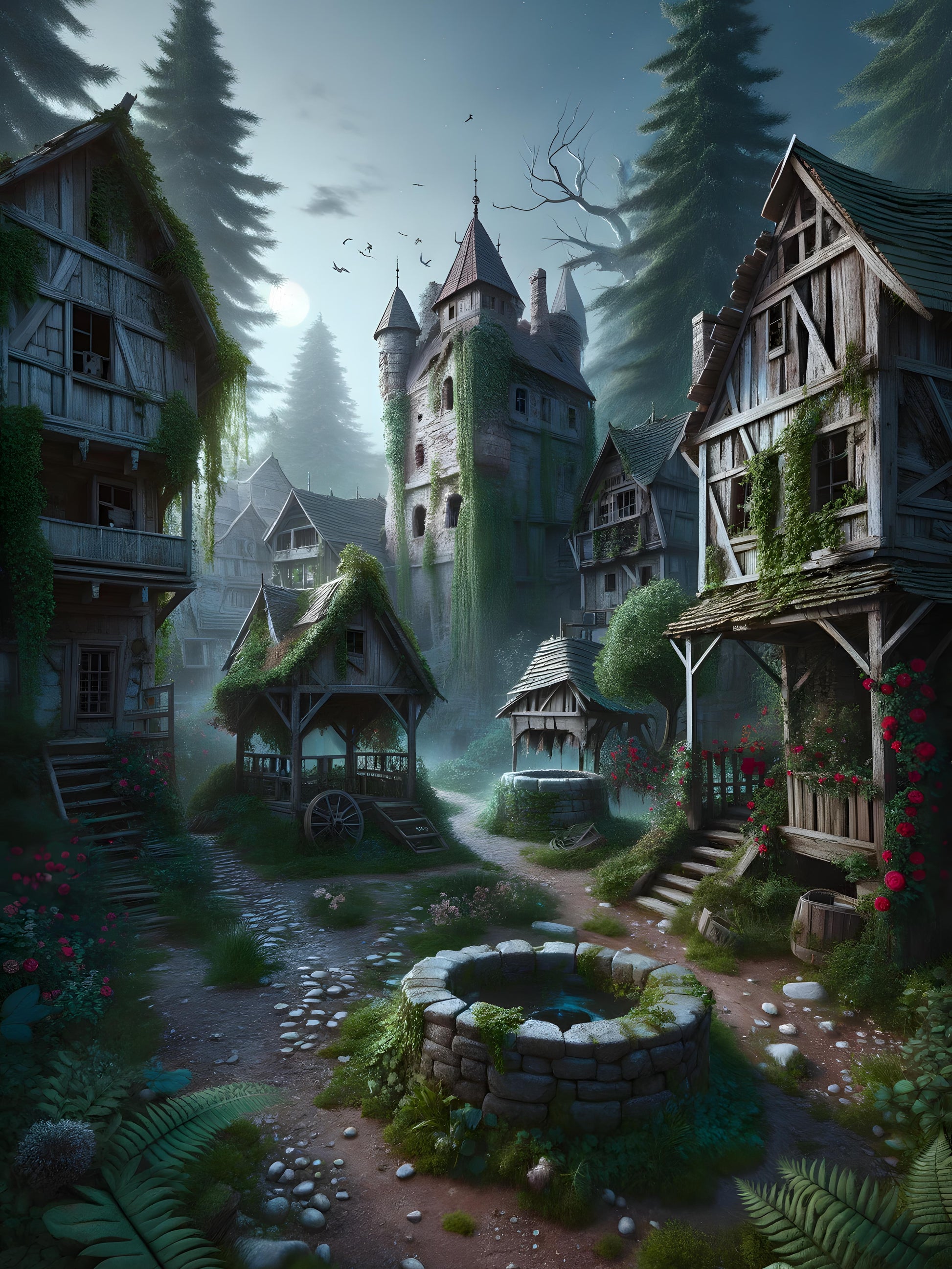 In a mystical village veiled by the early morning mist, quaint homes and lush greenery evoke a sense of adventure. An ancient well, the village's lifeline, promises wishes to those who believe. A towering castle, draped in ivy whispers of bygone eras and secret tales, standing as a vigilant guardian over the peaceful hamlet. Birds glide gracefully overhead, heralding the dawn of a new day. The scene is a captivating blend of mankind's creation and nature's artistry, inviting onlookers to explore its hidden depths and the narratives entwined within its stones.