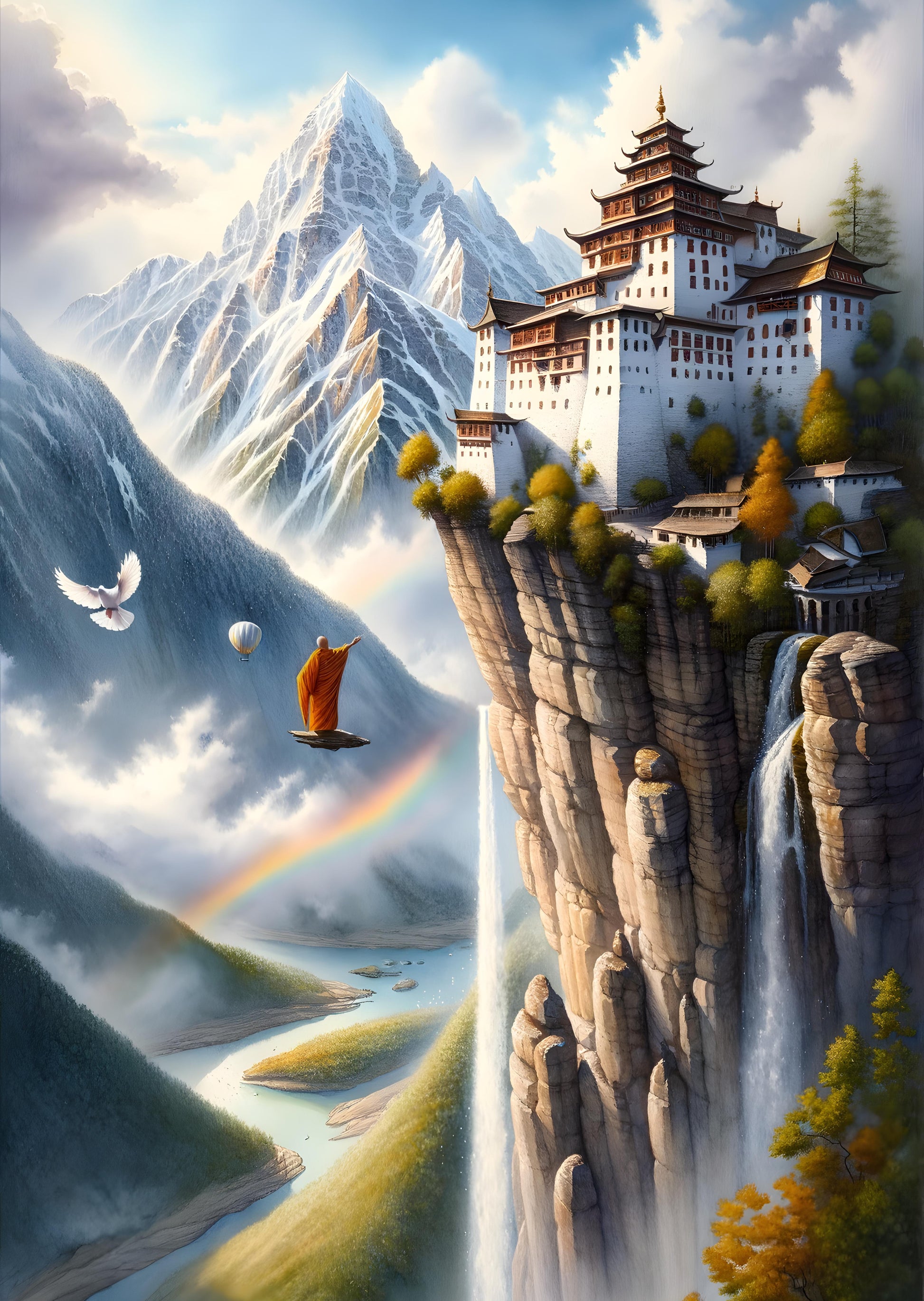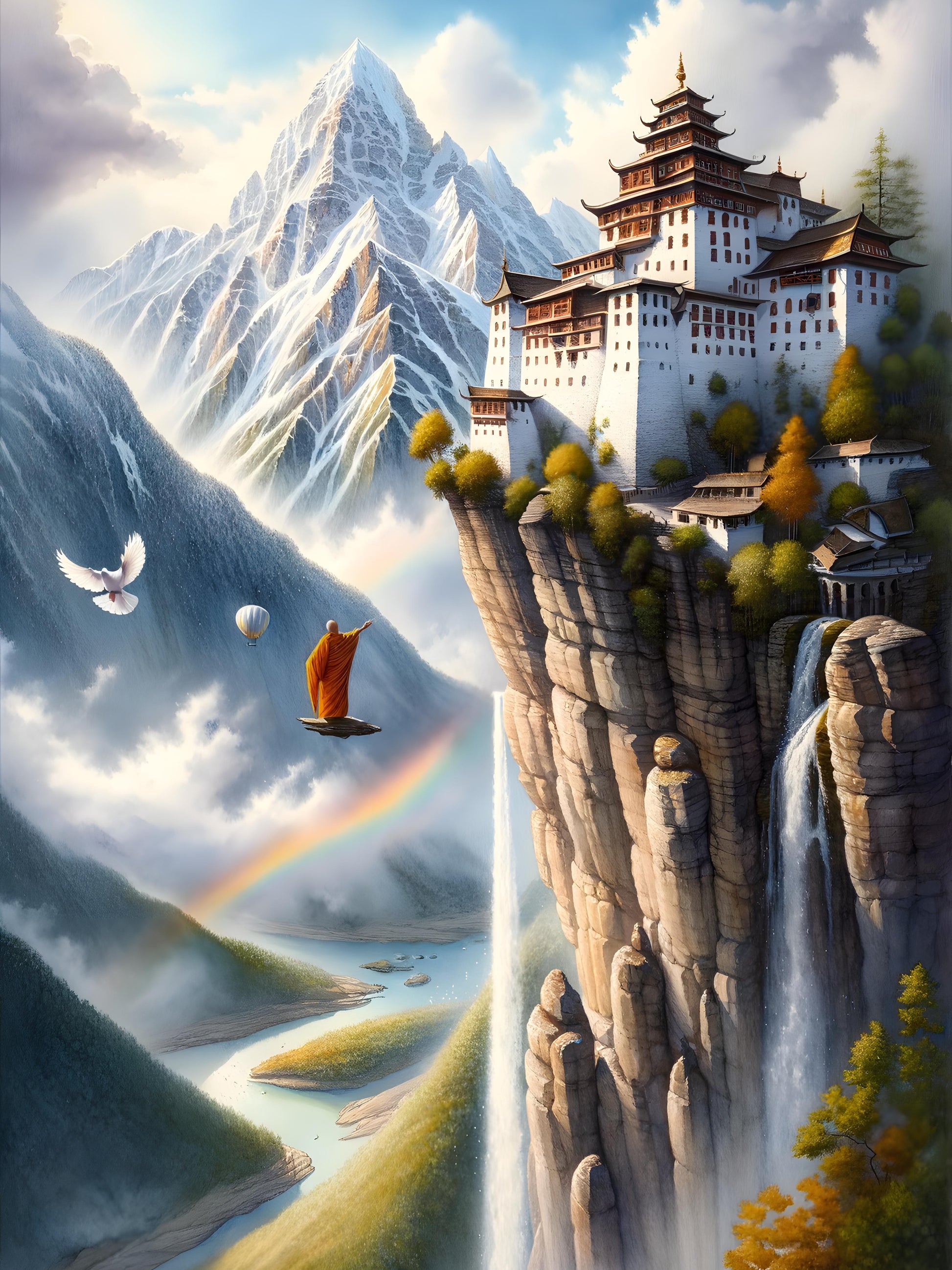 Perched atop a colossal cliff, the intricate fortress watches over a land where giants would roam. Crisp water cascades down mightily, giving life to a vivid rainbow that bridges the earth and the heavens. In this realm, birds share the skies with floating balloons, and even monks find themselves aloft on magical leaves, seeking out the wisdom of the clouds. This mystical landscape stands as a hidden jewel, nestled within the arms of the rugged mountains, a testament to a world where nature and humanity have been crafted into a breathtaking tapestry of wonder. Here, every dawn is a tapestry of light, greeting the seekers of peace and adventure alike.
