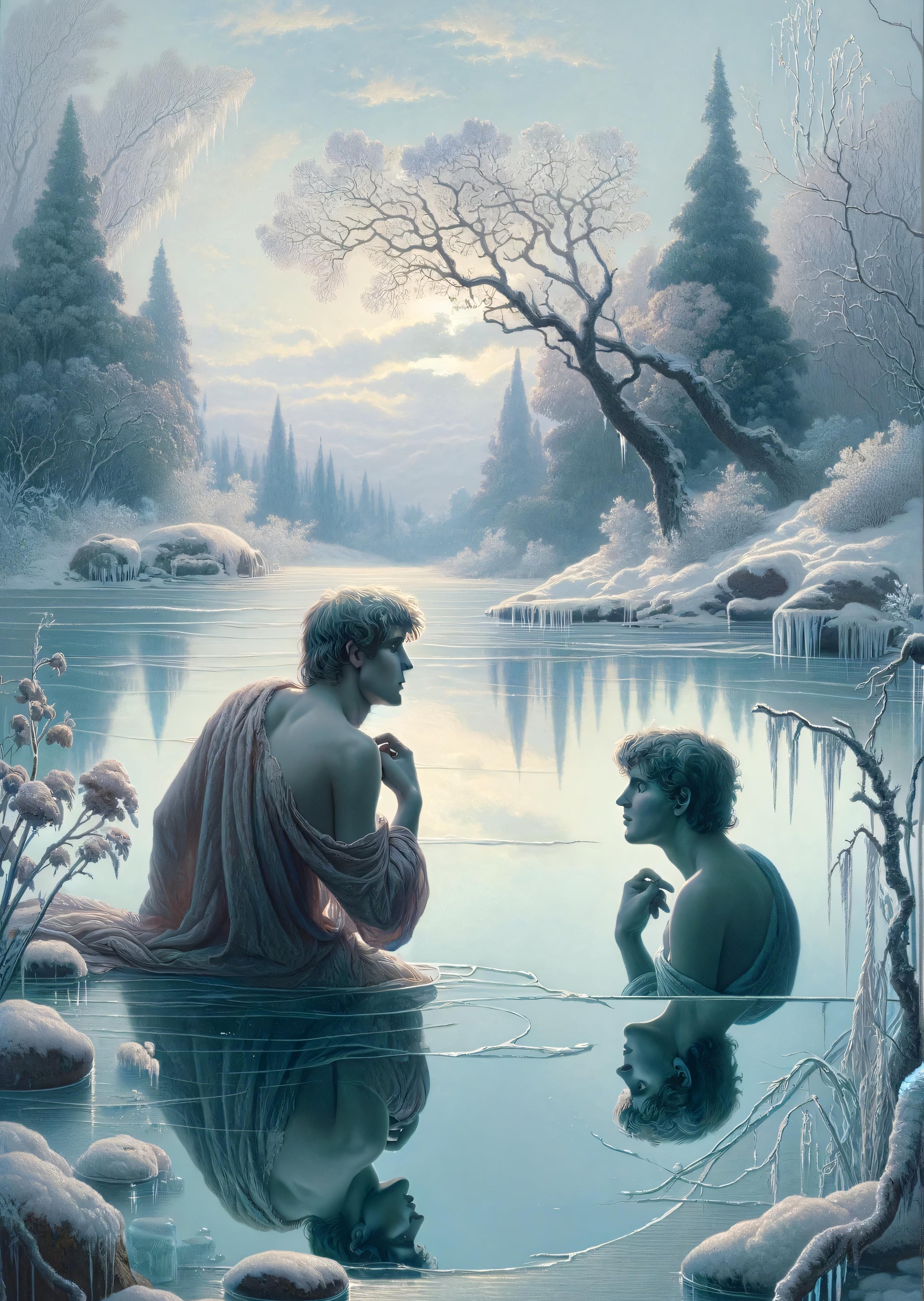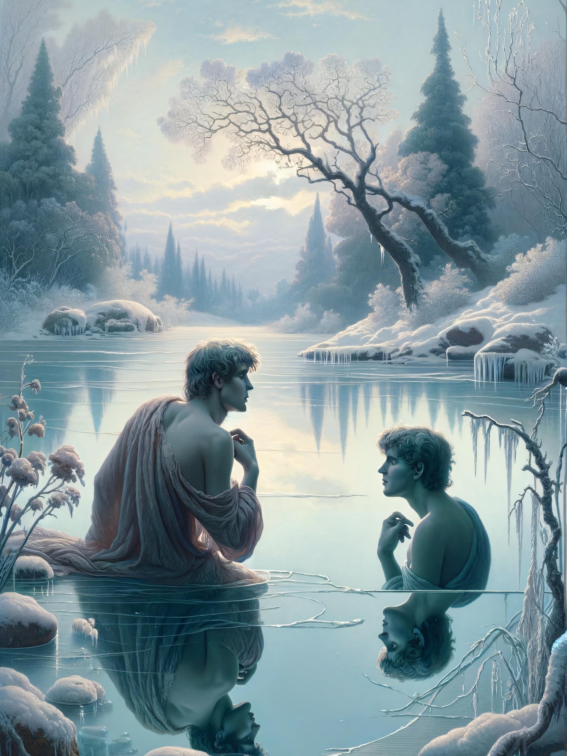 Behold Narcissus, the god of self-love and vanity, in repose by a tranquil, frozen lake amidst the serene embrace of winter's touch. The air is still, the world hushed, as if nature holds its breath in awe of his beauty. Delicate frost dresses the slumbering landscape, whispering tales of a curse born from unrequited love and the peril of a heart that could not see beyond the mirror's edge. Here, Narcissus gazes eternally, captivated by his own reflection, a testament to the ancient warning of hubris. His tale, woven through the threads of time, reminds us to tread softly on the ice of vanity, lest we too fall into the frigid waters of self-obsession.