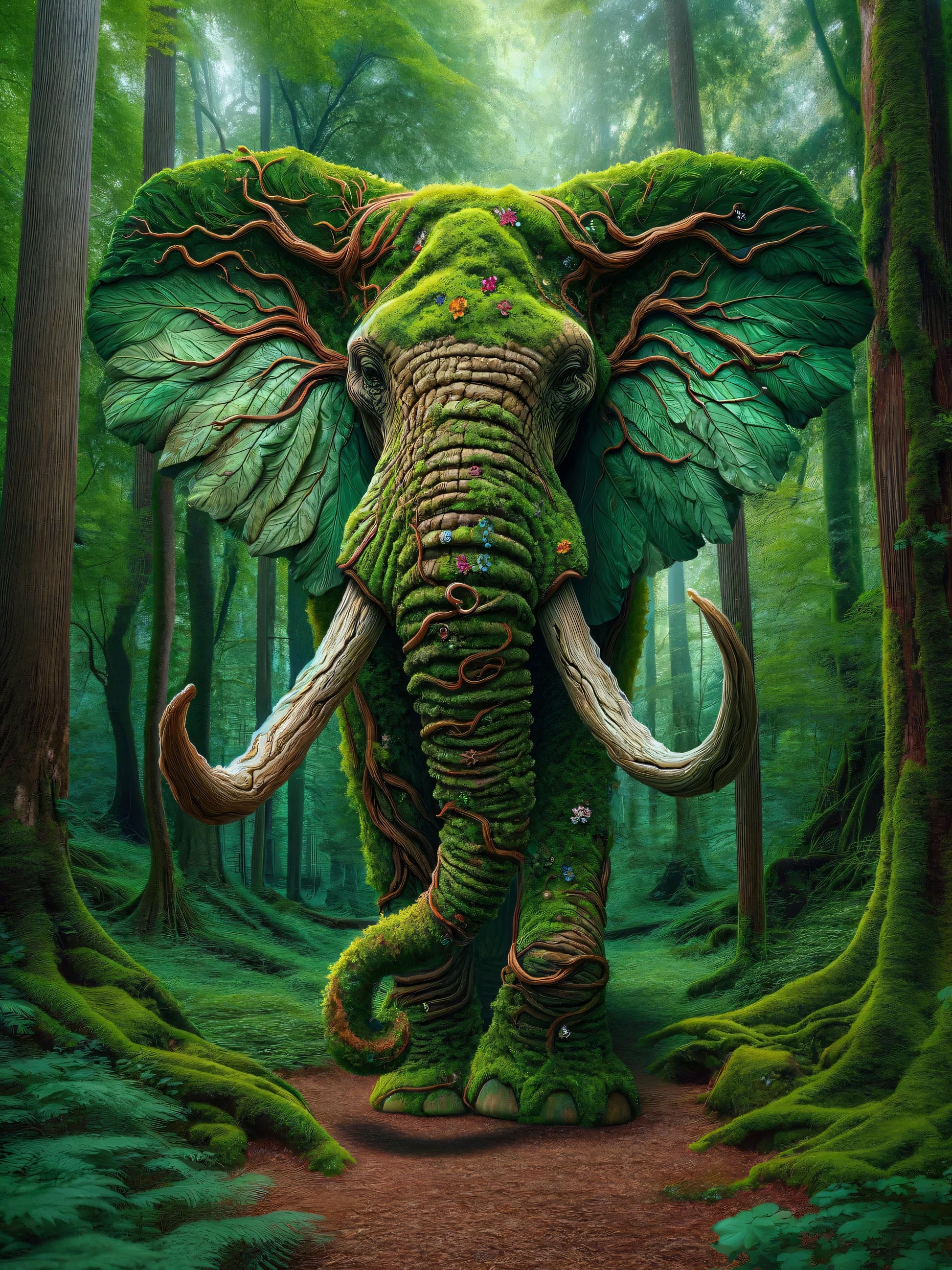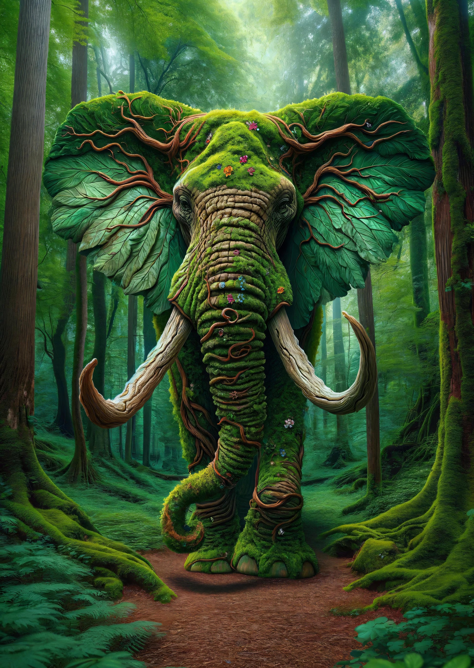 In a lush forest stood a guardian whose skin was bark and moss, ears broad like canopies, sheltering life beneath. Its eyes told of ancient wisdom and connection to the earth. Flowers bloomed where it rested, and critters called it home, reminding us that life flourishes when we nurture it. The guardian stood not just as an elephant or a tree, but as a symbol of how all things are intertwined: flora, fauna, and the breath of the forest itself. It teaches us that the vital threads of life are woven together, and we must protect and respect the balance.