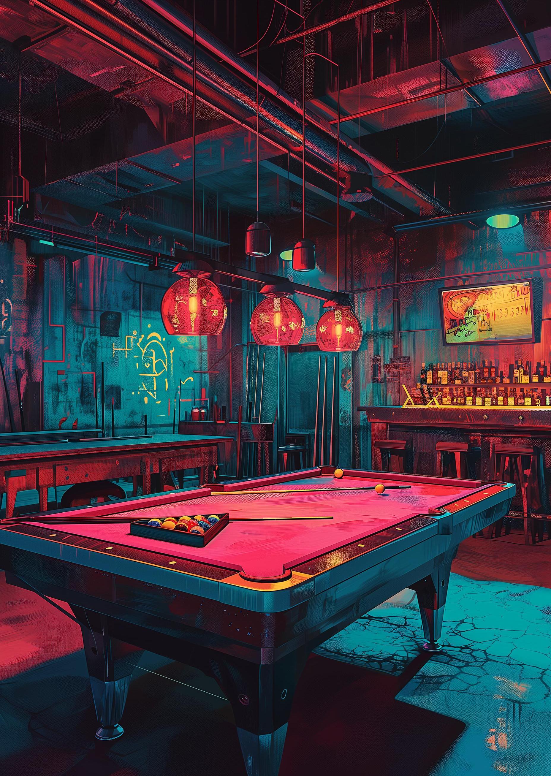 In the glow of red lights, the pool hall buzzed with excitement. Players leaned over the sleek table, eyes locked on the colorful balls. Every shot was a silent battle, with opponents' cues sliding, aiming for the perfect hit. The clack of balls striking each other filled the room, each collision raising the stakes. This wasn't just a game; it was a showdown where skill and nerves were tested. Onlookers held their breath, waiting to see who would conquer the table, sinking the final ball and claiming victory in this electric atmosphere. The tension was thick, each player vying to be the champion of the night.