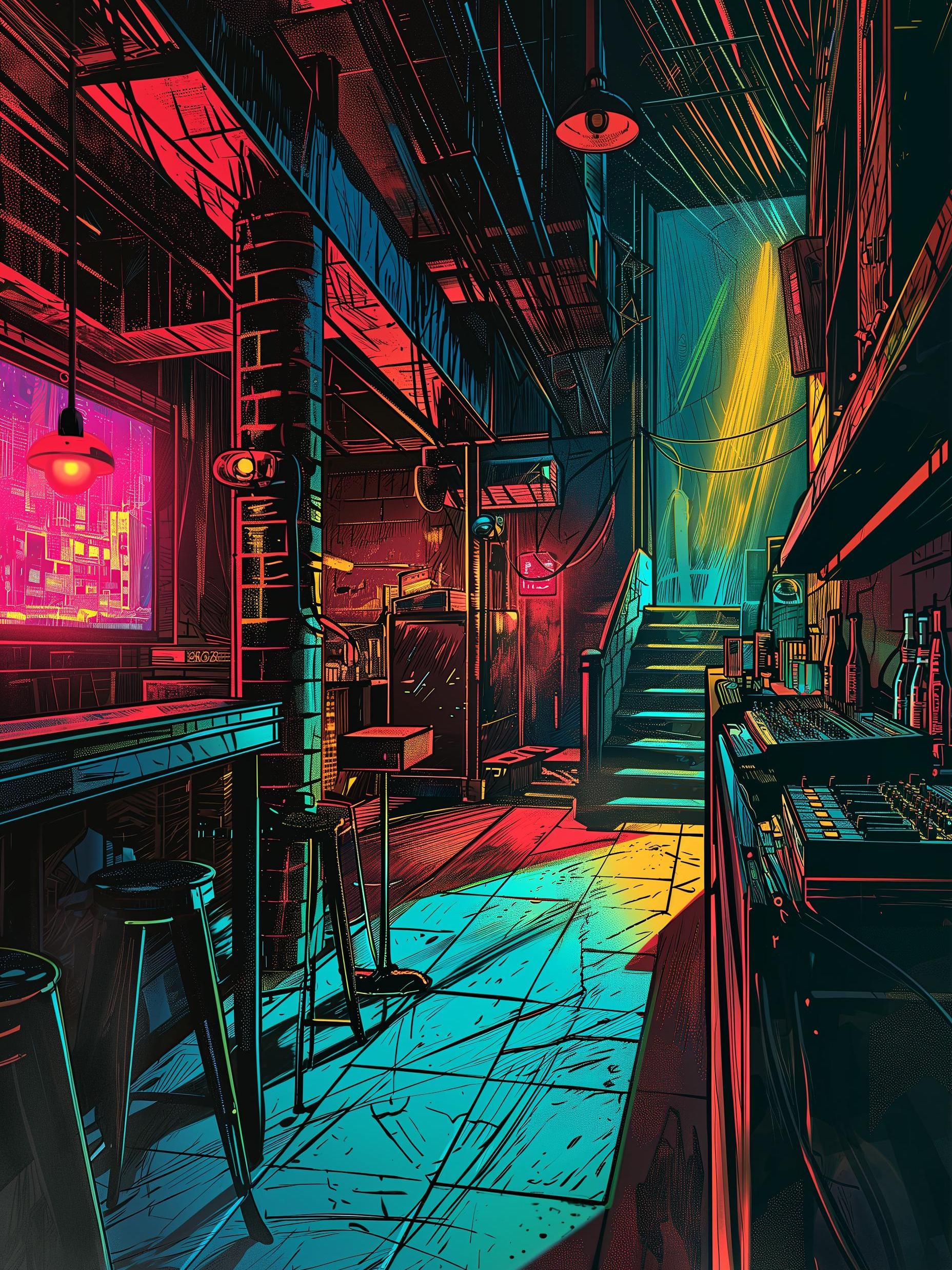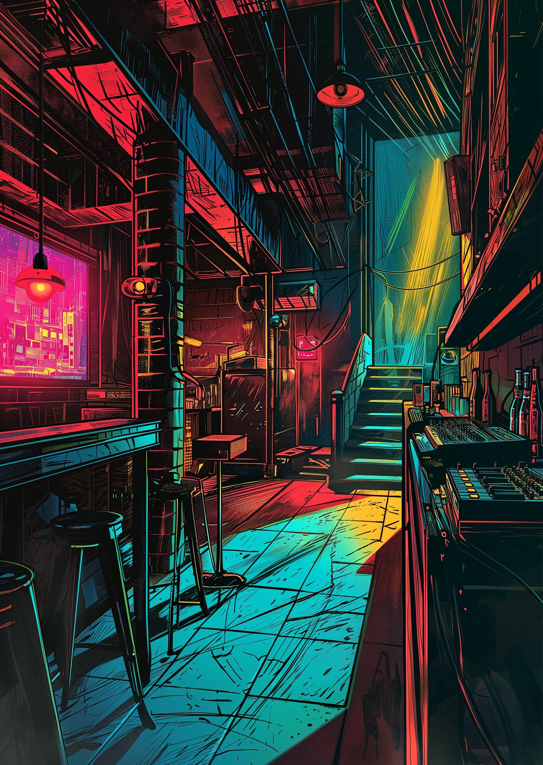 In a vibrant city corner, a quiet bar bathed in neon light stood as a haven for the night owls. The cool glow seeped through its windows, casting a spell over the empty streets. Inside, a single barkeeper hummed a tune, cleaning glasses that sparkled under the vivid lamps. Each chair and table, touched by splashes of color, held stories of countless souls seeking a momentary escape. The space, alive with shades and lines, whispered of secret meetings and shared laughter, a vivid tapestry of urban life painted in electric hues. It was an unspoken artwork, a canvas of light and shadow where every visitor unknowingly added their stroke.