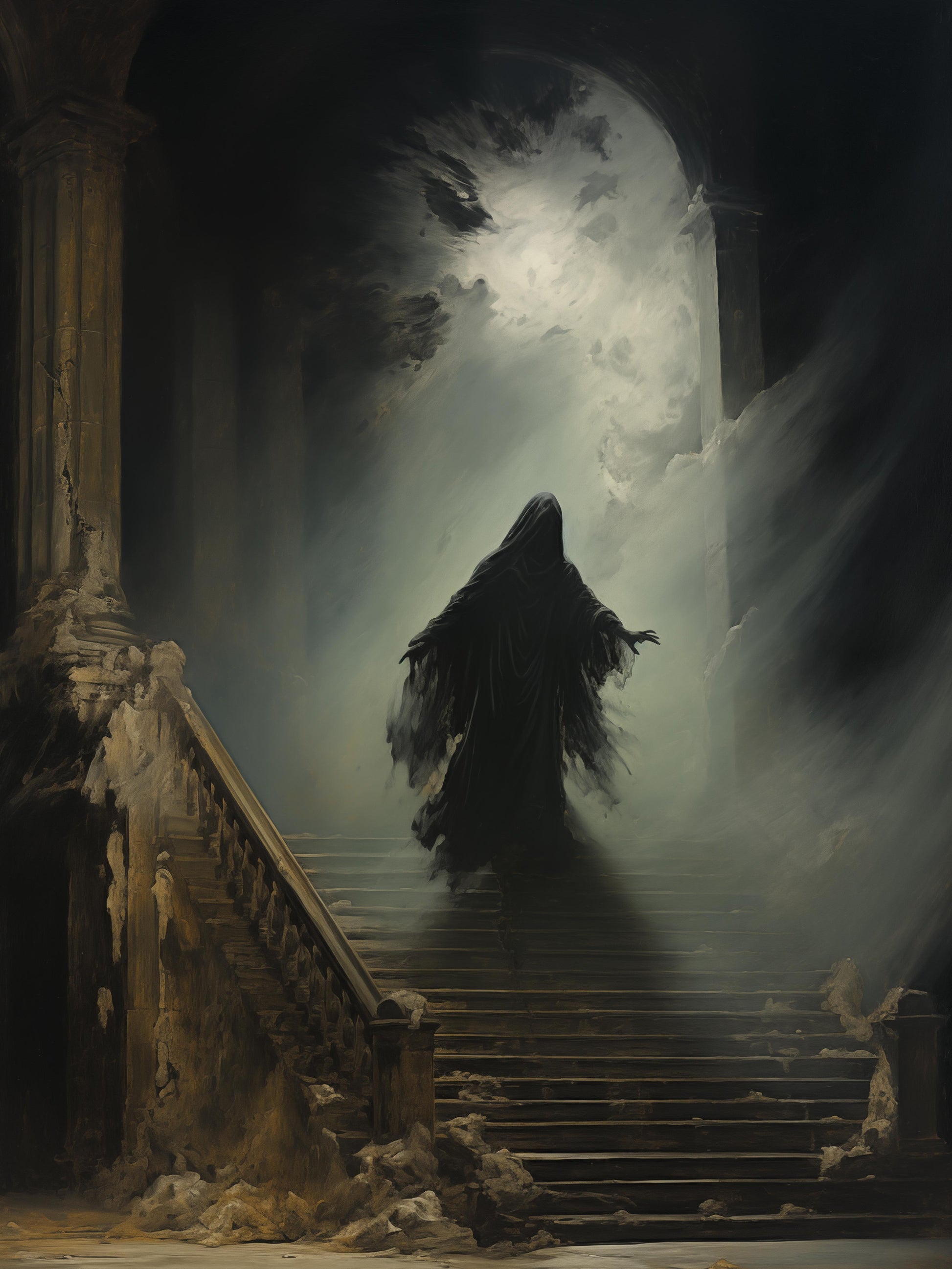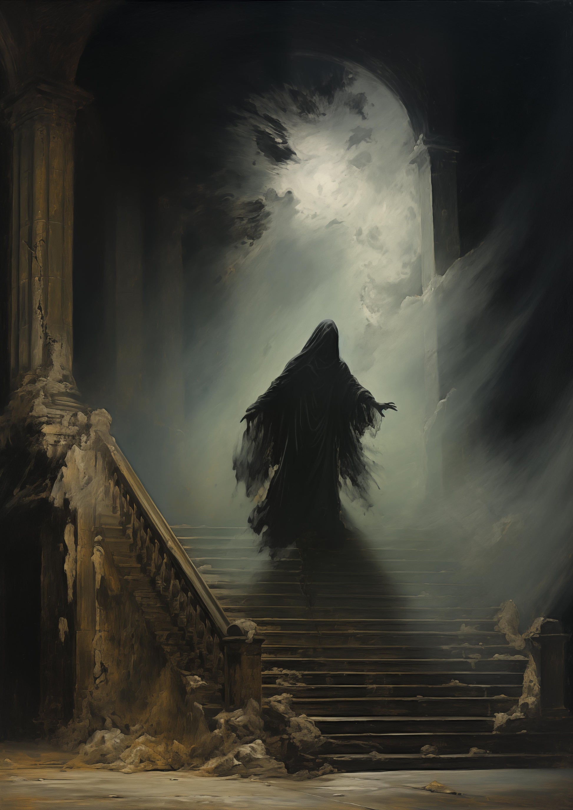 In an ancient, decaying temple, a cloaked figure stands at the foot of a grand staircase. Moonlight filters through a gaping hole in the ceiling, casting an ethereal glow upon the scene. The columns, once proud and steadfast, show signs of neglect. Rubble lies scattered at the base of the stairs—a testament to the passage of time. The figure reaches out towards the light, as if beckoning an unseen force or perhaps appealing to the skies above for answers. This haunting image exudes a sense of foreboding and mystery, telling a tale of both lofty aspiration and the inevitable decay of time.