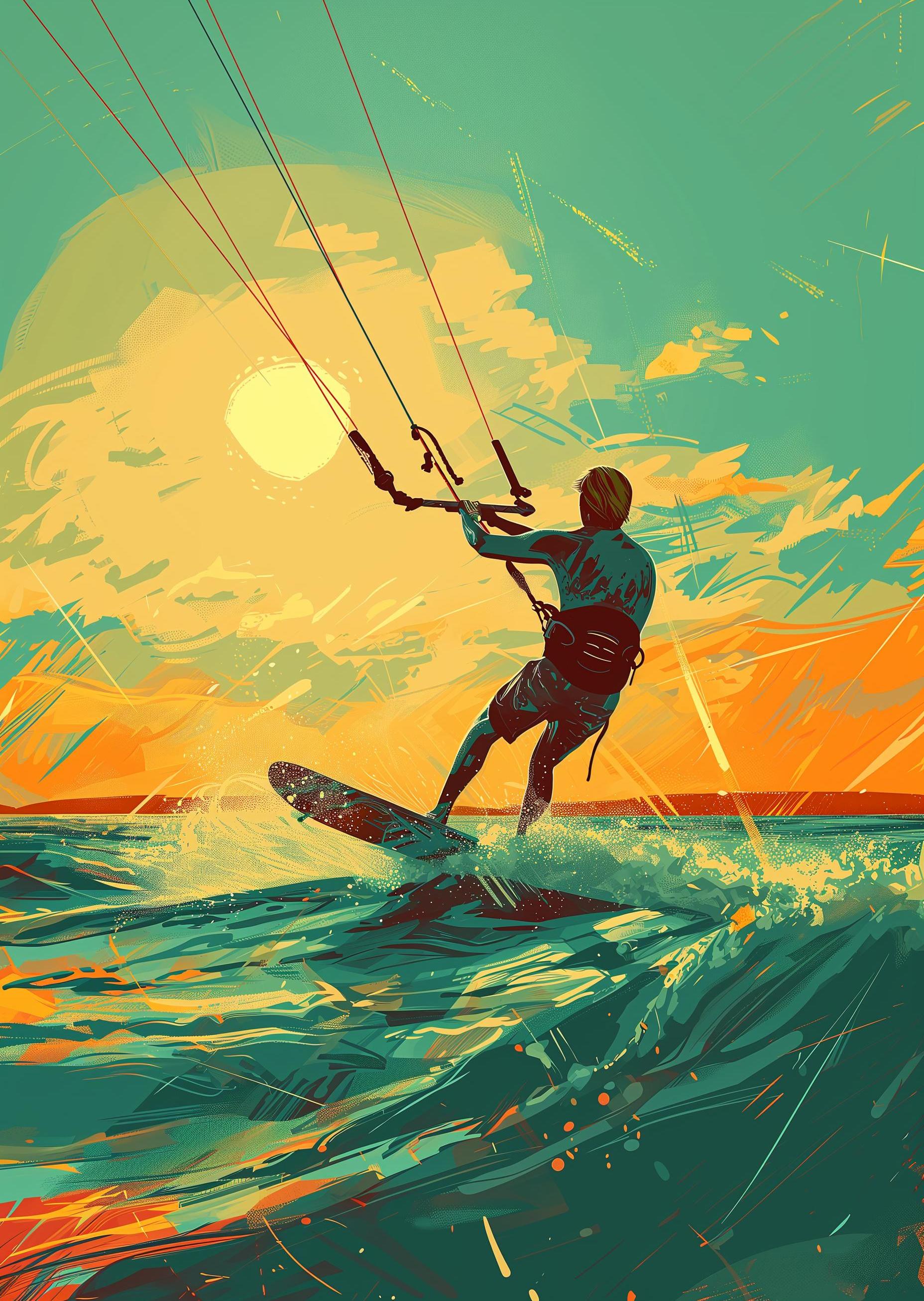 In the orange glow of sunset, a kite surfer races with the wind. Waves crash around, challenging balance and skill. The surfer grips the control bar, muscles tense against the pull of the kite. It's a dance with nature, a test of wills against the sea's restless energy. Each gust is a chance for a thrilling leap, the surfer soaring above the water before landing with a splash. This sport combines the rush of surfing with the flight of paragliding. The tension is clear, the excitement sky-high as the surfer masters the elements.