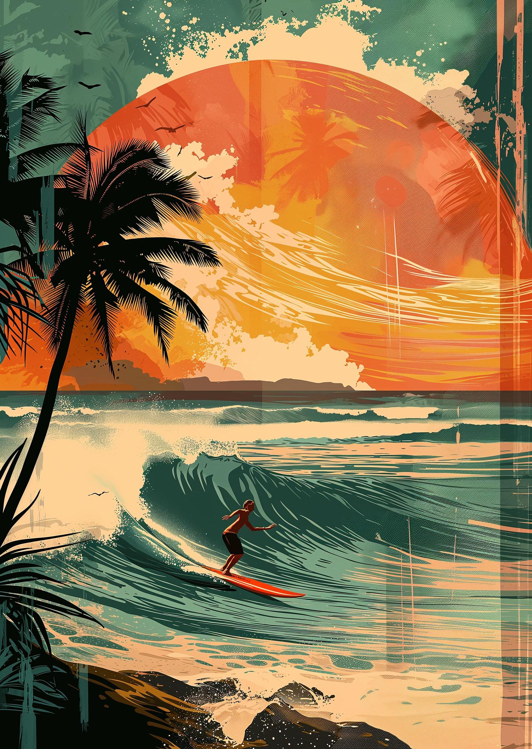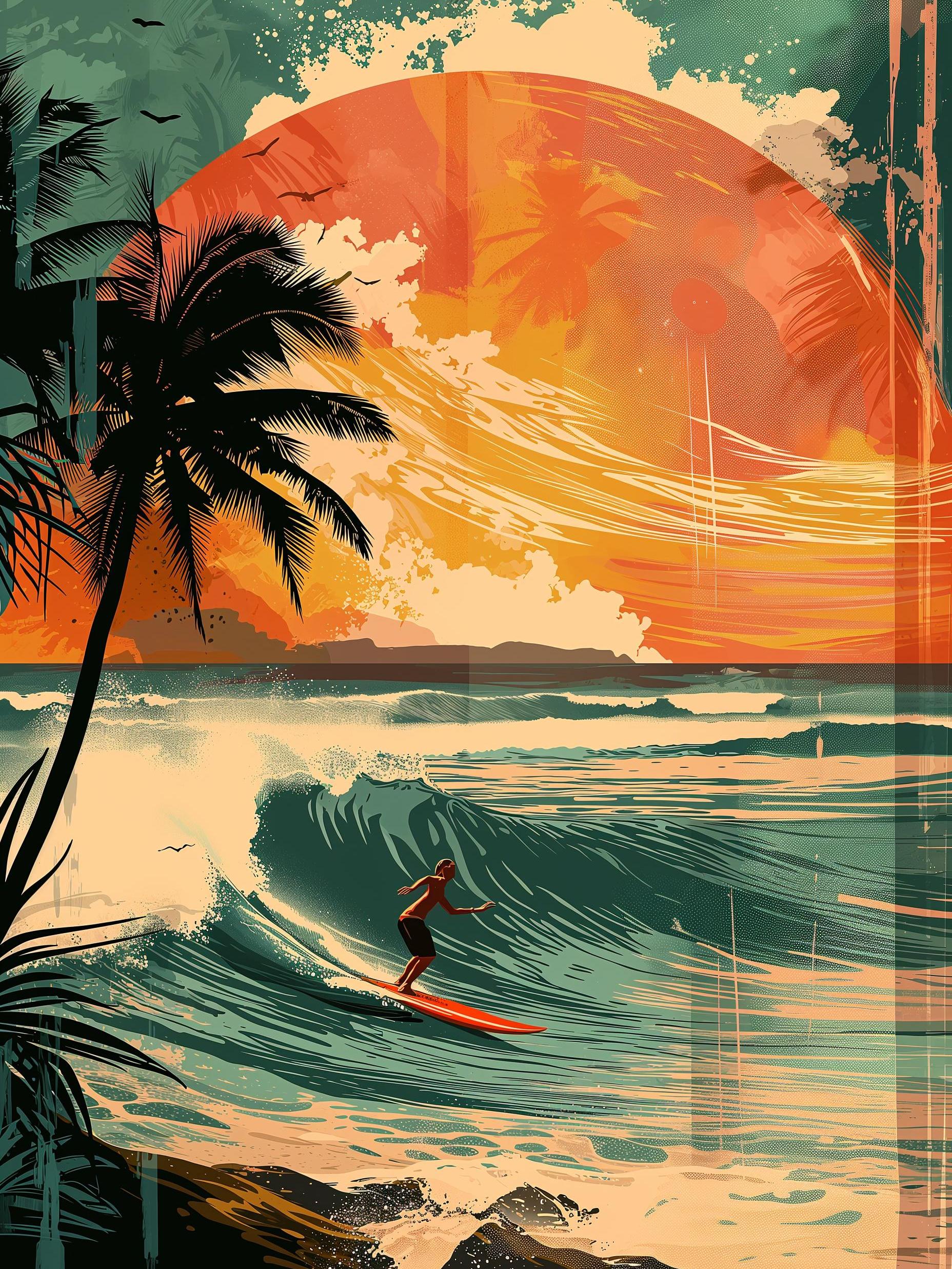 On a warm, sunny beach, waves danced to the rhythm of the wind. Among them, a brave soul with a board plunged into the saltwater stage. Each wave was a challenge, a soaring mountain of liquid blue. The surfer, with a heart full of fire, rode the waves like a fearless bird under the glowing sky. The sun dipped lower, casting the sea in liquid gold. With every twist and turn, the surfer found joy in the dance with the ocean, a true display of courage and play. The day closed with a perfect ride, leaving onlookers in awe. The surfer's dance with the waves was a beautiful sport expression.