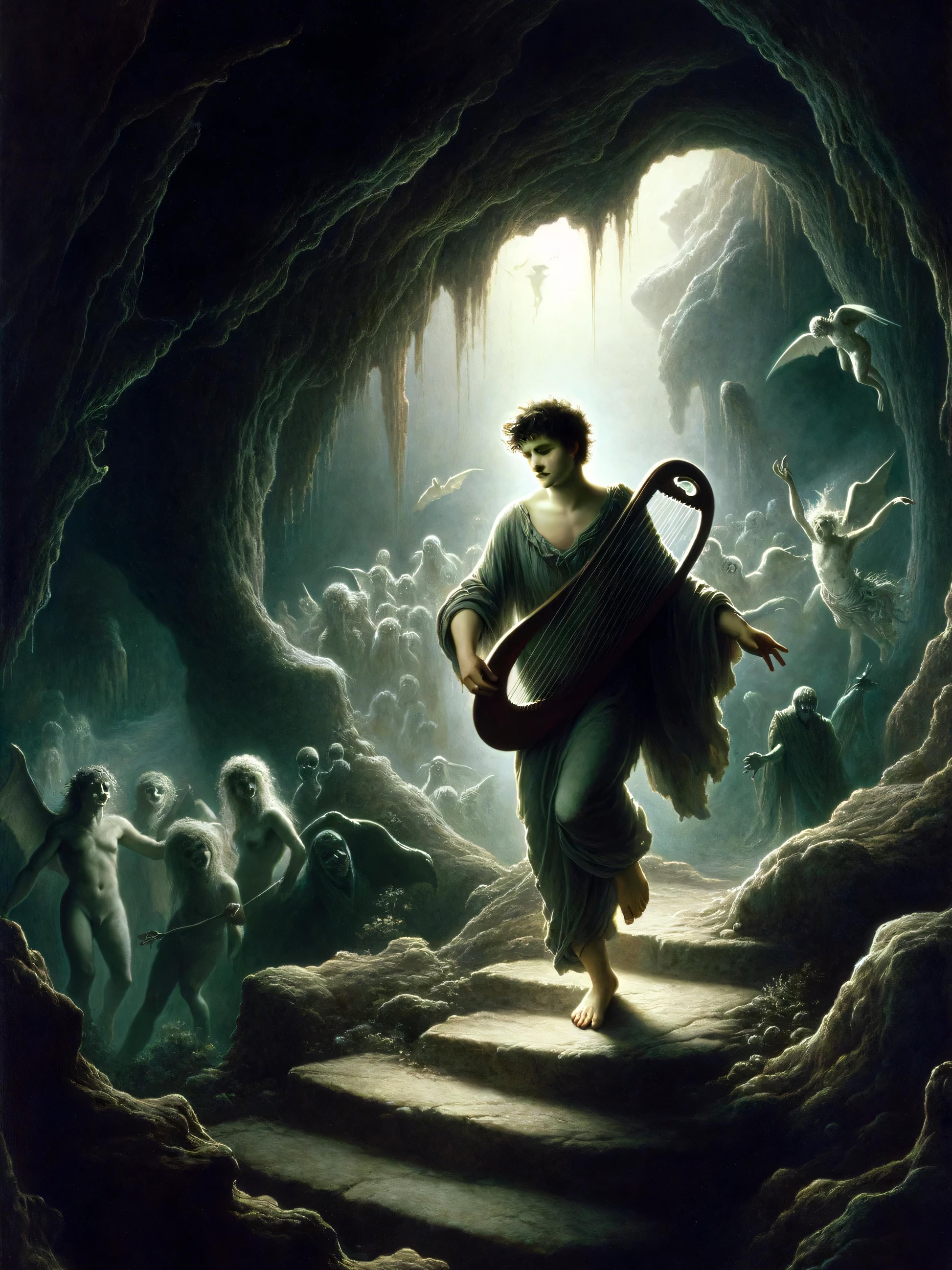 In the ethereal haze of an otherworldly cavern Orpheus strides forward the embodiment of sorrow and hope entwined Guided by his lyre's enchanting tones he seeks to restore love's grip keenly aware of Hades' sly whispers Orpheus son of Apollo and the muse Calliope wields music as a bridge across realms In this odyssey his tune dares to bend the will of gods and stir the shades of the underworld at his feet Flooding the abyss with light and shadow his journey is one of mythic questing against despair's clutches A tale spun from ancient threads this vision of Orpheus' descent into the depths invites us on a passage rife with longing and the power of art to challenge fate itself.