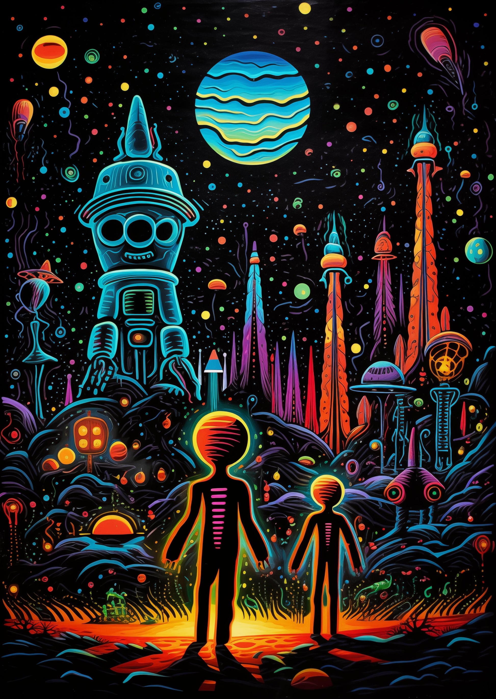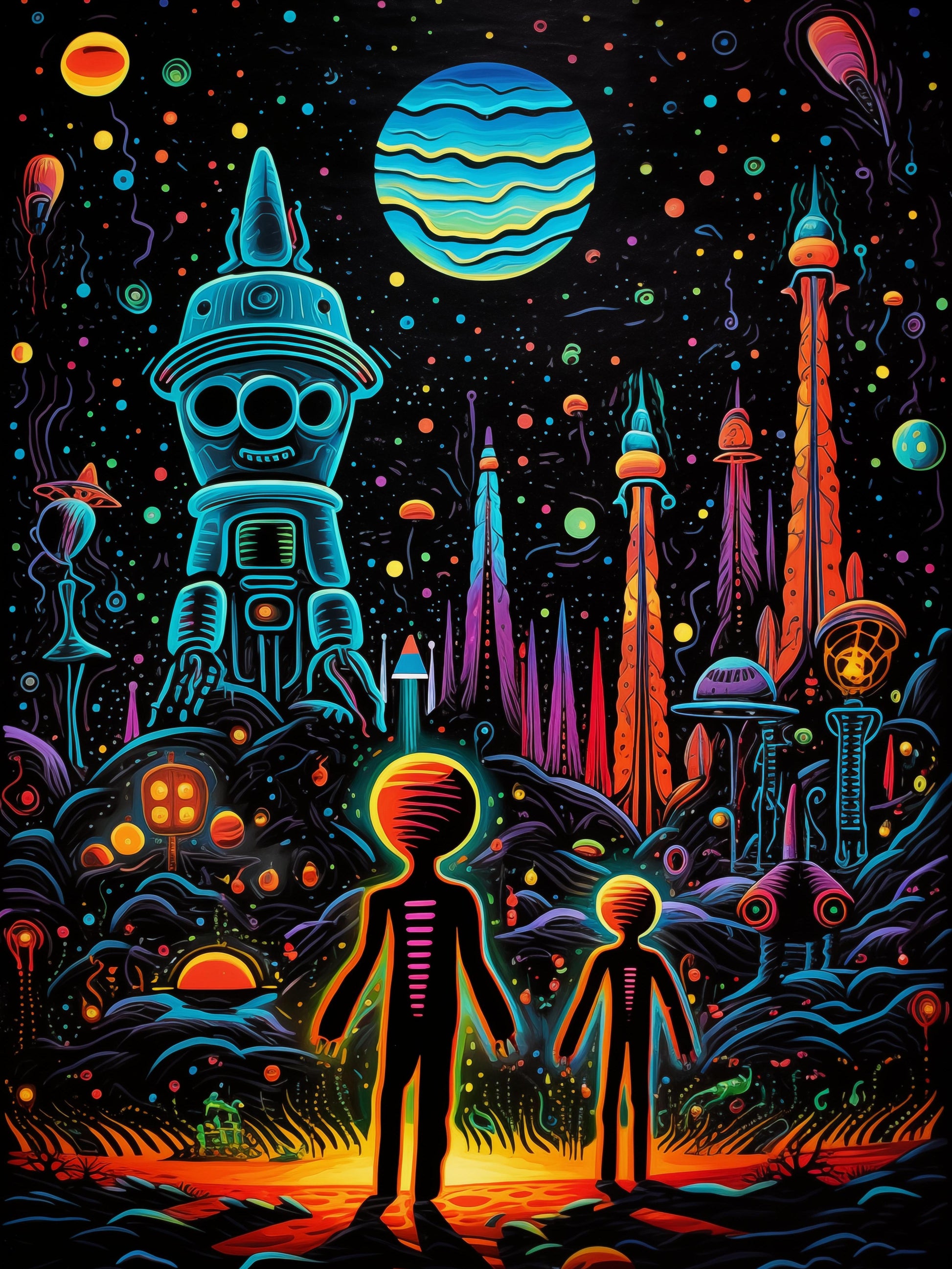 In a vibrant cosmos painted with a kaleidoscope of colors, two silhouetted figures stand amidst an otherworldly landscape. Beneath a sky adorned with planetary bodies and luminescent orbs, they gaze upon a phantasmagoric scene. Towering structures punctuate the horizon like beacons of alien architecture, glowing with an otherworldly aura. At the center, a whimsical robot stands guard, seeming to welcome the pair into this fantastical realm. The larger orb, striped with aqua and cerulean, casts a hypnotic glow, illuminating the dreamscape and inviting the wanderers to explore the infinite wonders of this celestial domain.