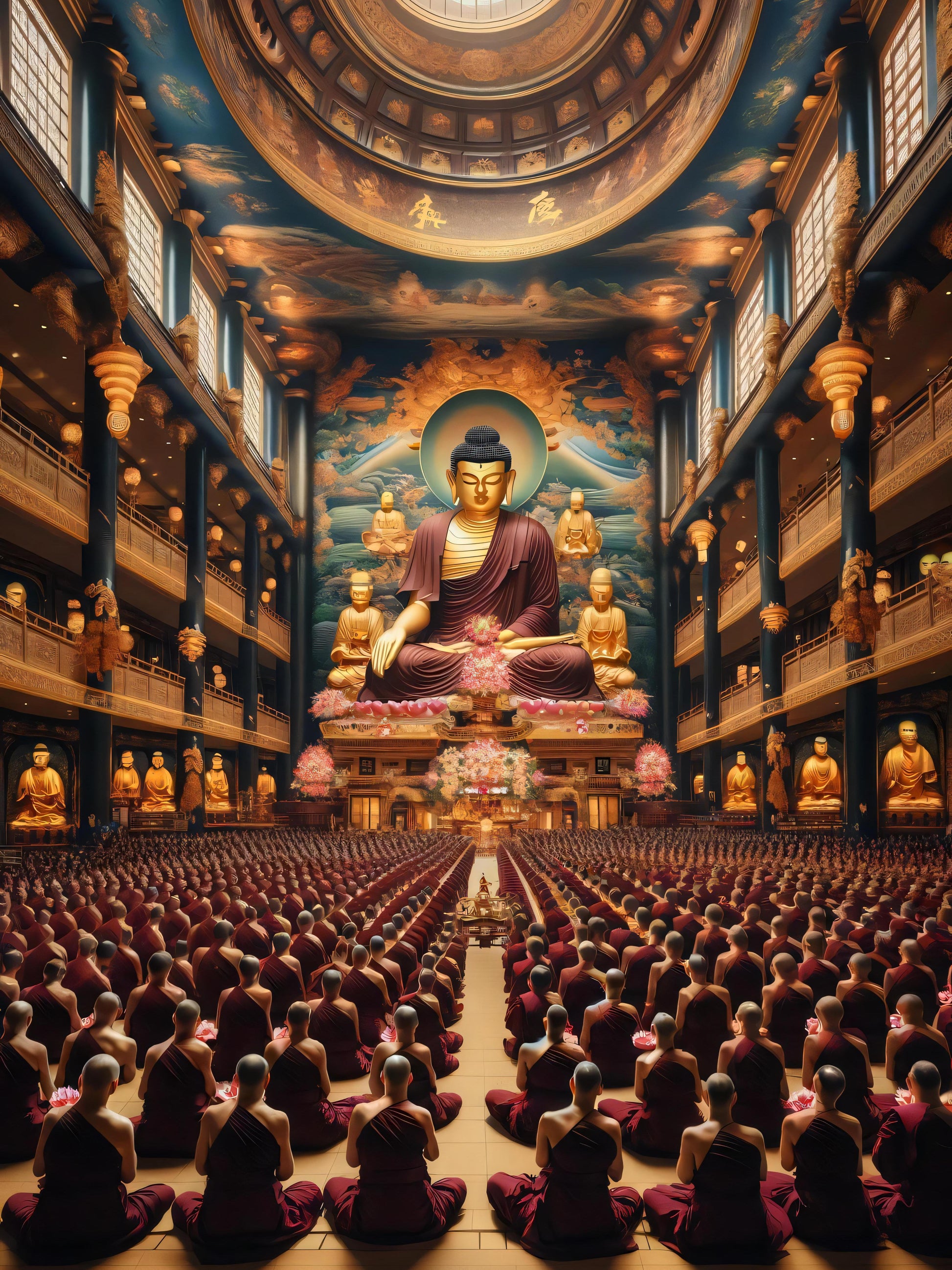Discover a world of deep spiritual insight within this inspiring image depicting a grand hall filled with numerous Buddhist monks in meditation. Situated at the focal point is a colossal golden statue of Buddha, exuding an aura of profound peace and wisdom. Surrounding this central figure are rows of smaller Buddha statues, each contributing to the atmosphere of veneration and reverence. Above, a radiant dome ceiling adorned with intricate murals bathes the space in a warm, welcoming glow, while the blossoming flowers add a touch of nature's fleeting beauty. This arresting visual captures the essence of Buddhist practice and the collective pursuit of enlightenment.