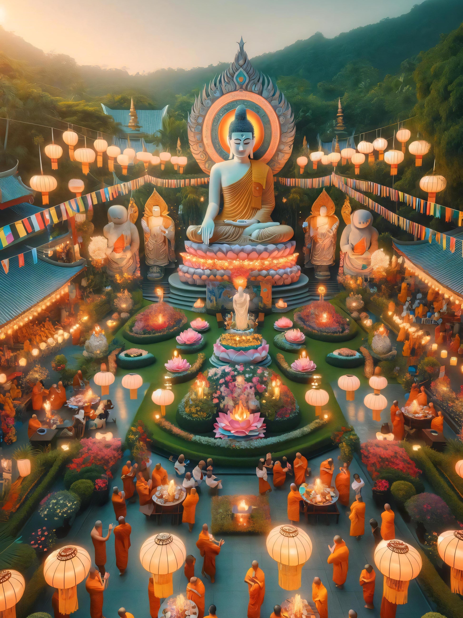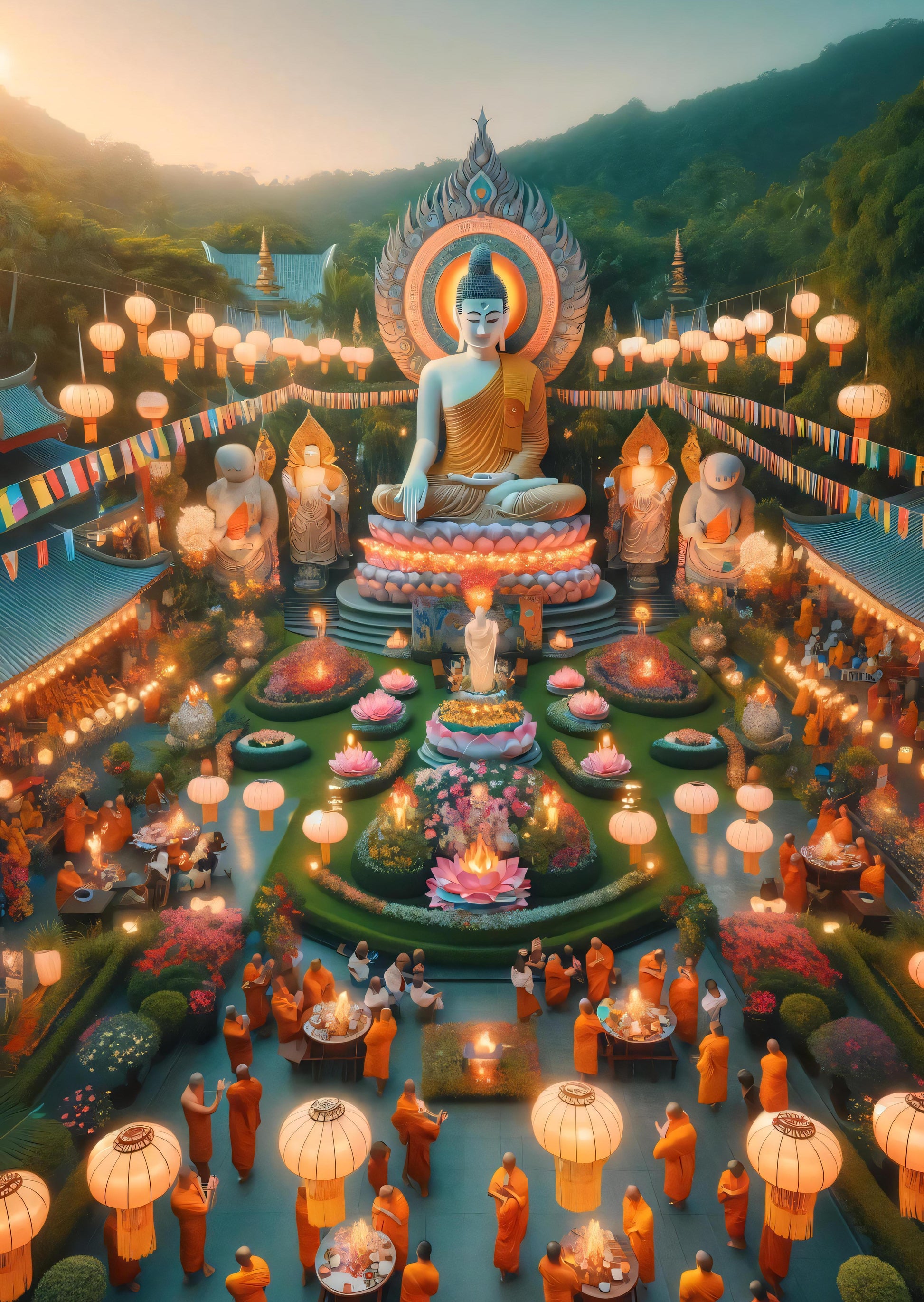 In a place aglow with lanterns and flowers, people in orange robes gather to share light and peace. At the heart, a grand statue sits calm and still, reminding those around of inner peace. The soft glow of lanterns carries the hope and wishes of the gathering into the evening sky. This is a place where the bustle of life pauses, and for a precious moment, everyone connects with something greater than themselves—a reminder that quiet moments of reflection are as vital as the air we breathe.