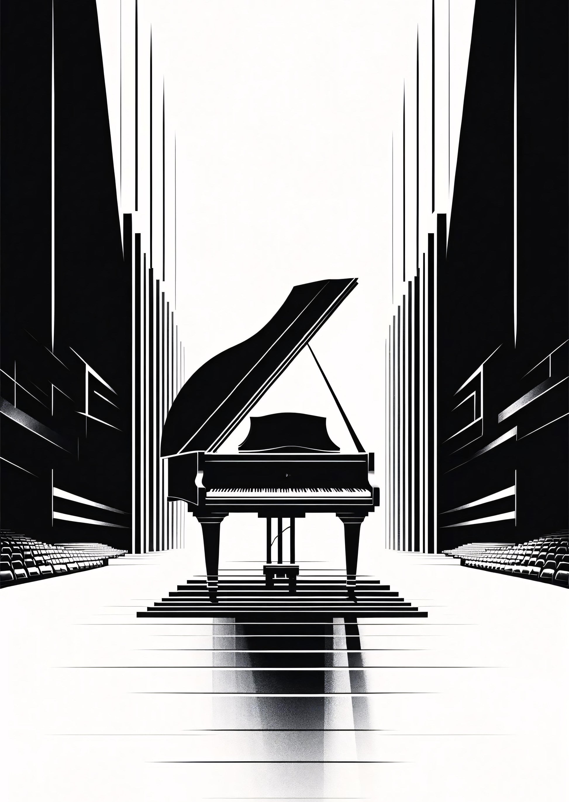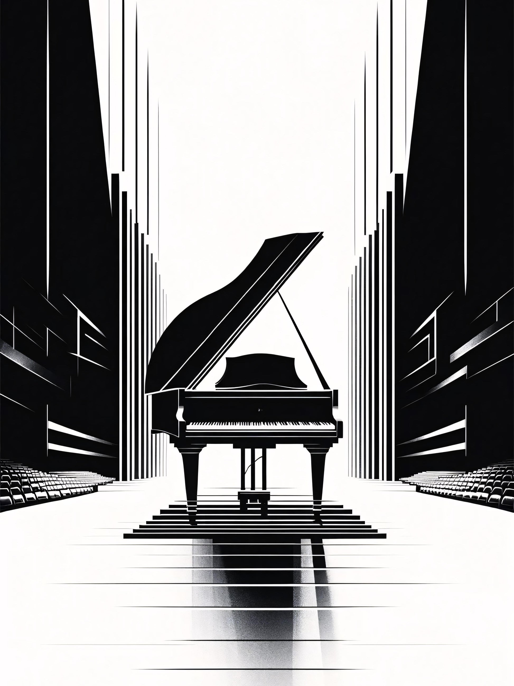 In a place where shadows and light dance, there stands a lone piano. Its black and white keys mirror the stark world around it. Rows of empty seats face the stage, waiting for a melody that could fill the silence. This image tells a story of contrast and potential, where music's invisible power lies dormant, ready to stir souls and touch hearts. The piano, like a quiet dreamer amongst giants, holds the capacity to turn emptiness into a space alive with notes and rhythms. It's a reminder that within simplicity, there is depth, and even in the absence of a player, the possibility of beauty is ever-present.