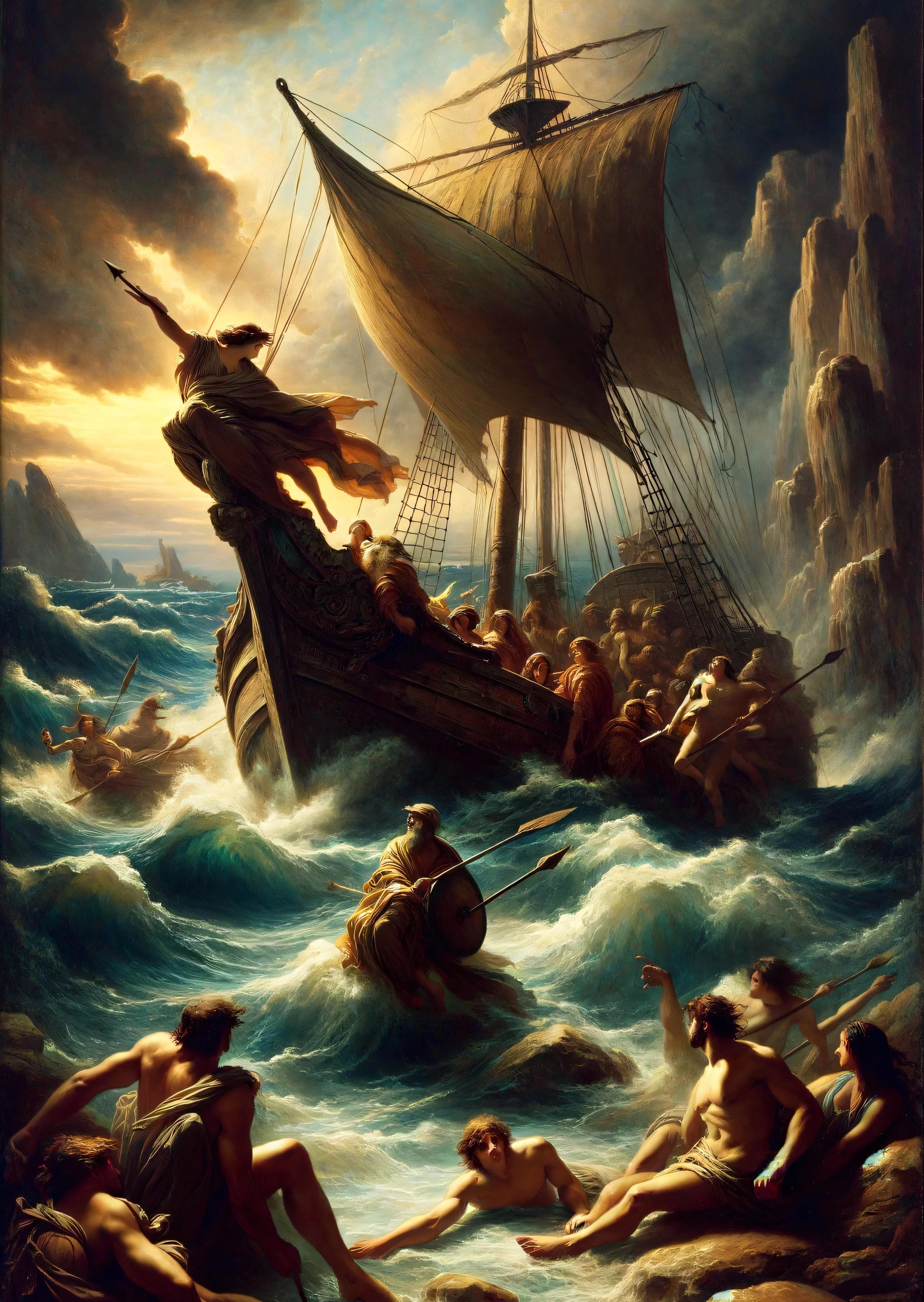 Behold an epic voyage guided by the divine: this majestic image depicts the enchanting presence of a Greek god as they usher a ship through tempestuous seas, a testament to humanity's quest for navigation under celestial watch. Their identity a mystery among the pantheon of Greek gods, yet their influence eternal as the tales of old. The ship's crew wrestles with the ocean's fury, a dramatic scene lit by a waning sun piercing through the clouds, signifying the balance of hope against despair. This painting captures the grandeur of myth intertwined with the struggles of mortals, forever a narrative etched into the annals of time.