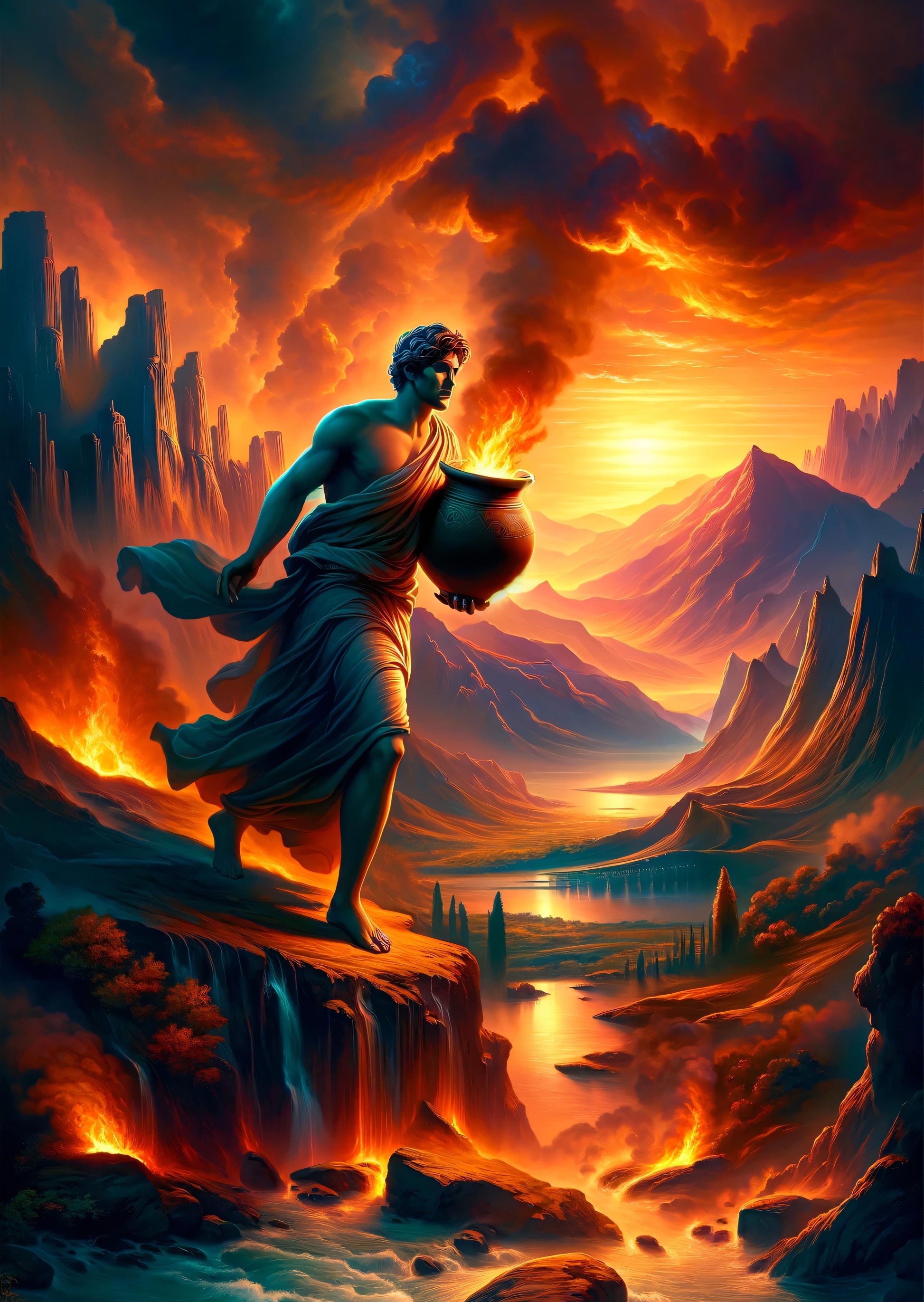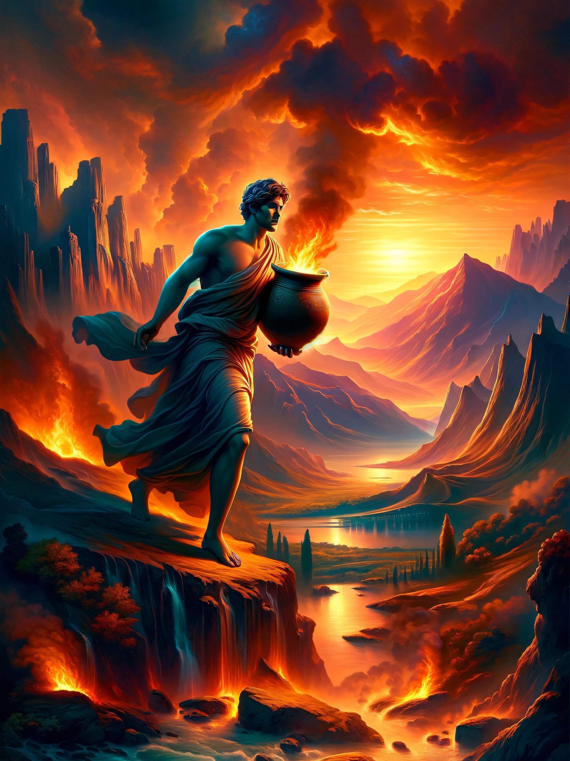 Behold Prometheus, the Titan god of fire and mankind's fabled benefactor, illuminated in the breathtaking glow of dusk Here, he strides through a mythic landscape, his gaze stern and determined as he defies the gods of Olympus by bearing the flame that signifies knowledge and enlightenment to humanity With the fire gently cradled in a vessel, Prometheus heralds an era of progress and technology This revered figure, who sculpted humans from clay, embodies the eternal spirit of curiosity and the relentless pursuit of wisdom Amidst towering cliffs and cascading falls under the watchful skies, his silhouette casts the light of hope and innovation over the world.