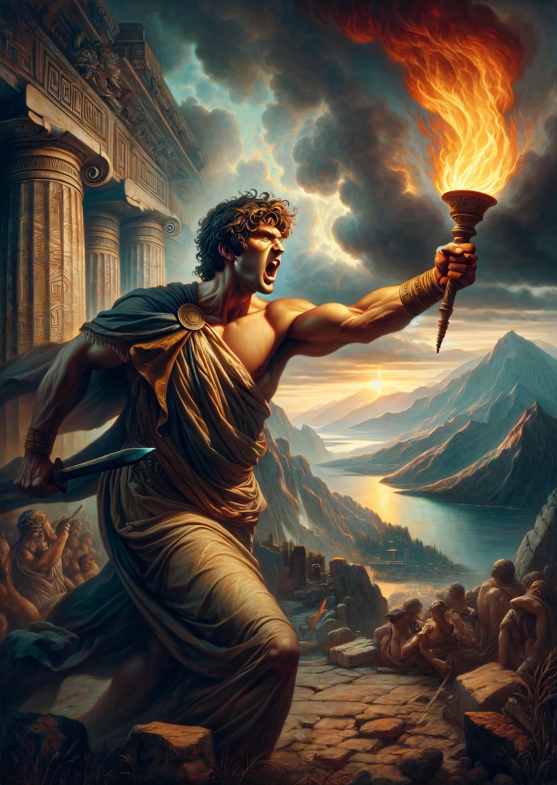 Behold Prometheus, the Titan god of forethought and crafty counsel, who defied the Olympians by gifting humanity the sacred flame of knowledge. His boundless courage gleams as intensely as the blaze he brandishes, illuminating the path to civilization. Amid the grandeur of ancient temples and the majesty of mountainous landscapes, Prometheus stands as an eternal symbol of enlightenment and rebellion against divine tyranny, his legacy etched into the annals of myth as the father of human progress.