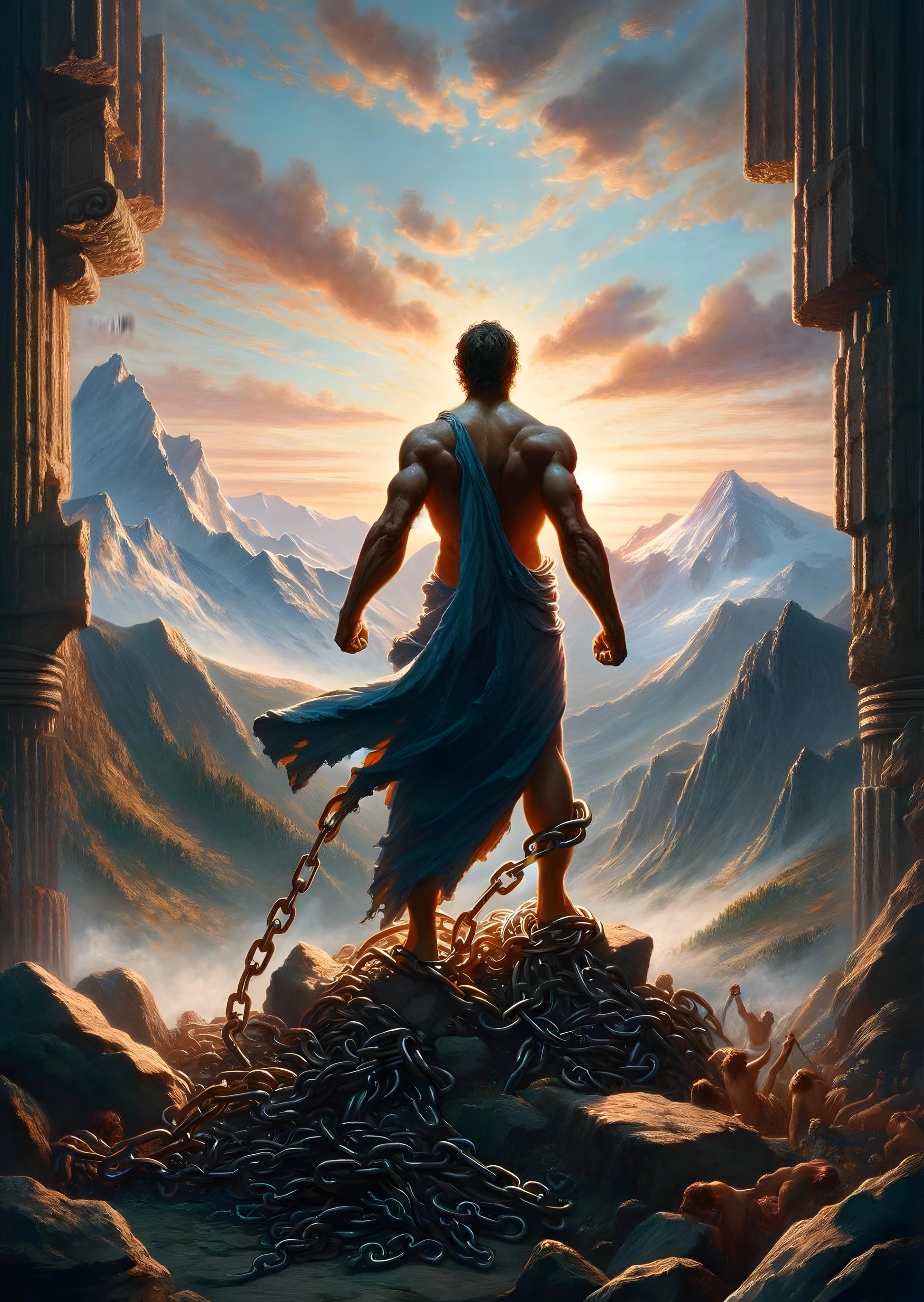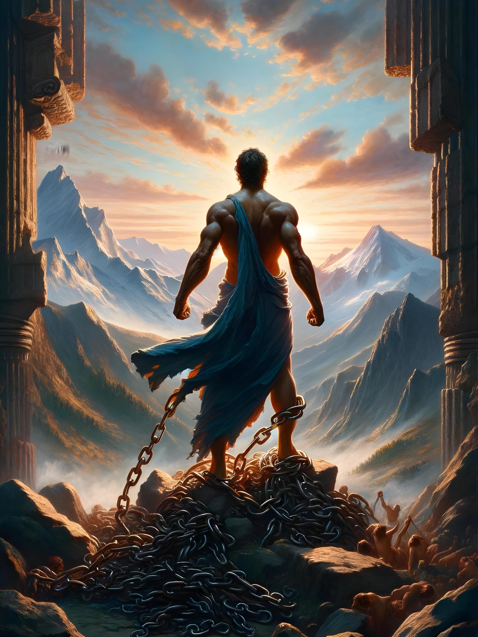 Behold the mighty titan Prometheus, defier of the gods and giver of fire to mankind His unyielding spirit is immortalized amidst the grandeur of mountain peaks and the breaking dawn With chains that once bound him scattered at his feet, he stands as a testament to resilience, courage, and the human spirit May his legend inspire mortals to reach beyond their grasp and aspire to the divine.