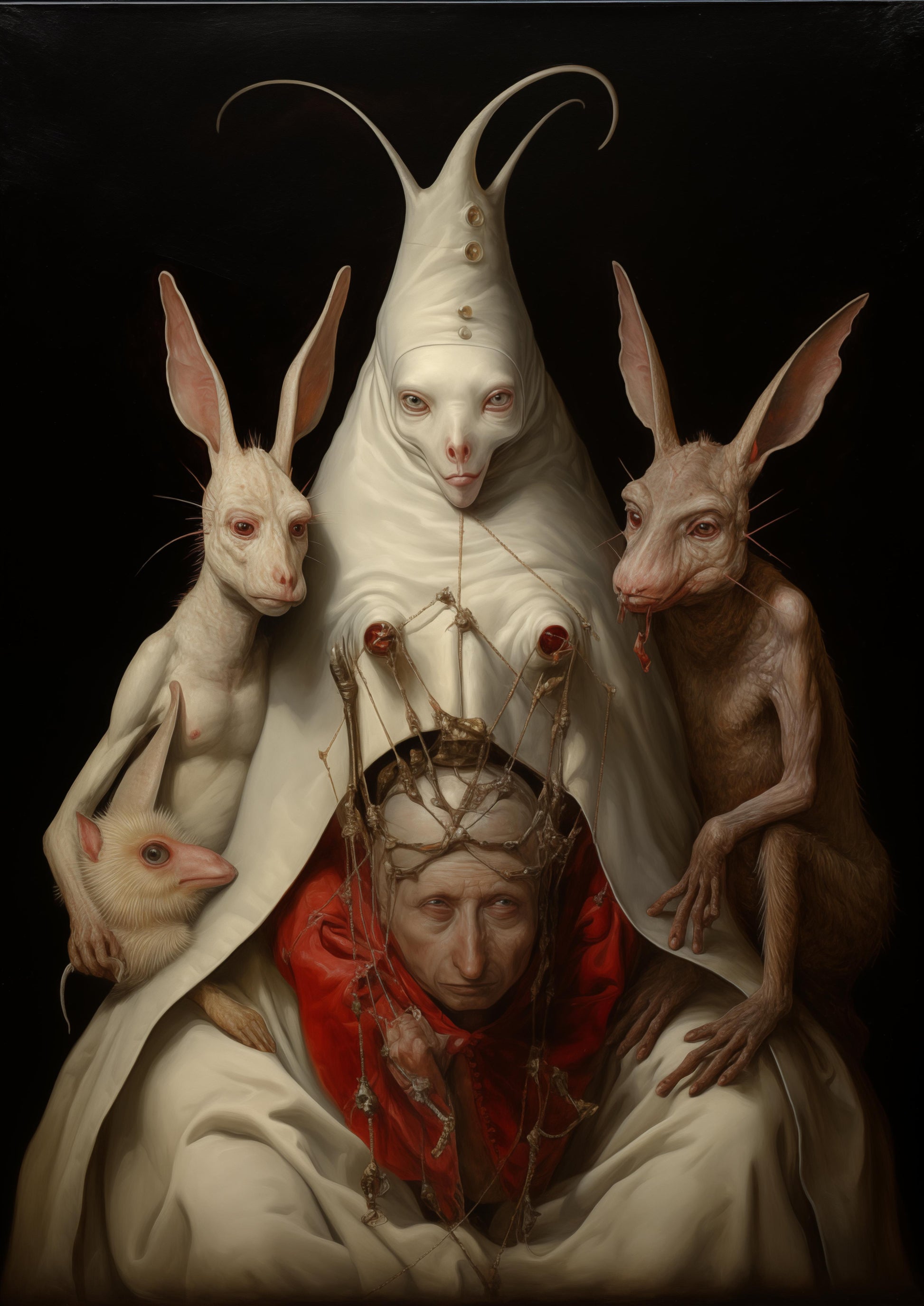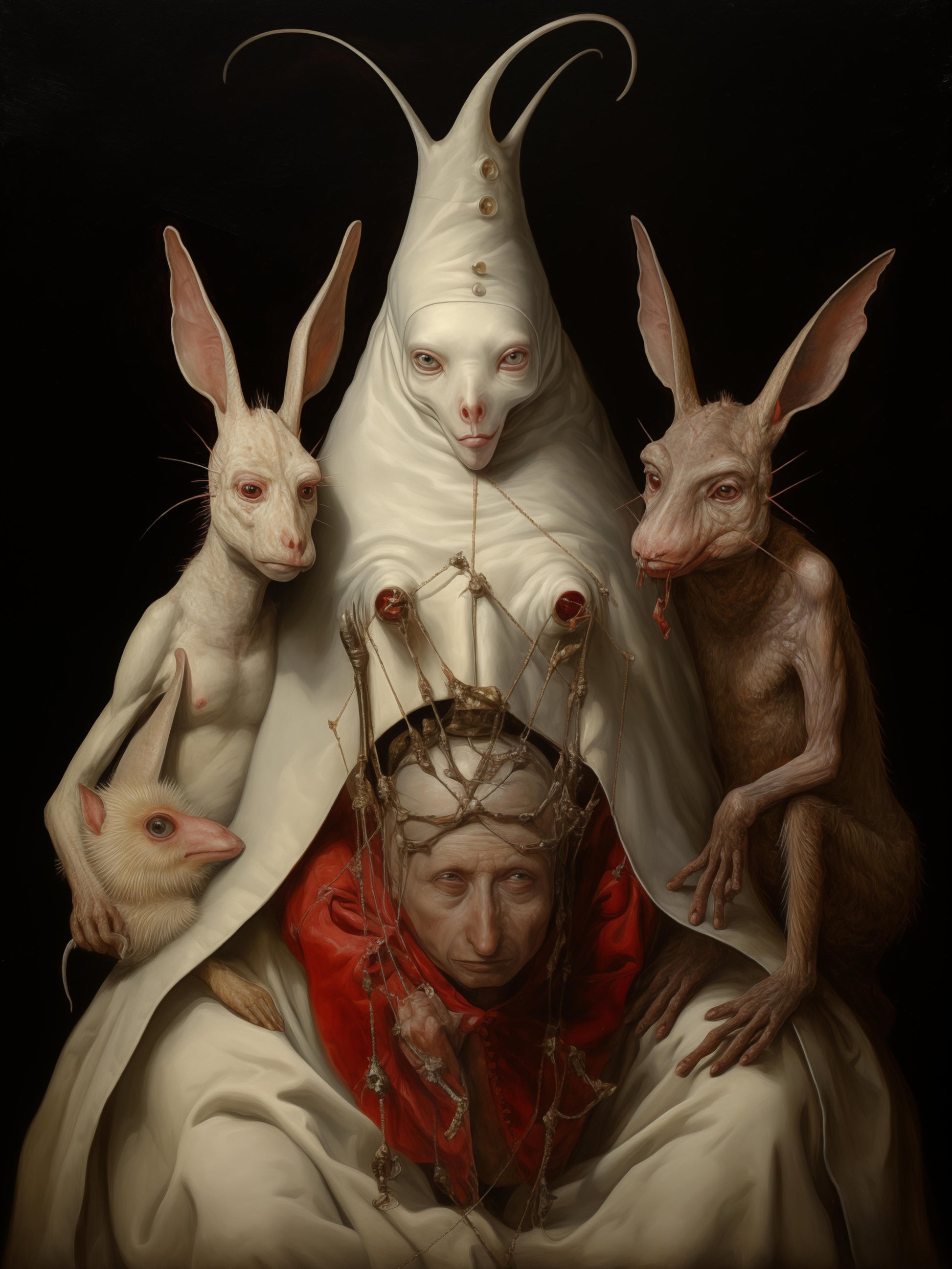 In a curious land where the unusual was usual, four unique beings came together. One wore a crown, not of gold, but of thorny branches, symbolizing power tinged with pain. Below his crown, his eyes told stories of heavy thoughts and leadership's burden. A figure in white, with eyes that could pierce the soul, stood tall amongst them, its attire simple yet its presence commanding, hinting at wisdom beyond its silent gaze. Flanking the two were creatures with ears that could hear even the softest truths and secrets, their glances a mix of innocence and knowing. Together, they formed an assembly of life's contrasts: leadership and servitude, knowledge and naiveté, strength and vulnerability, suggesting that all can coexist in one delicate, interwoven tapestry.