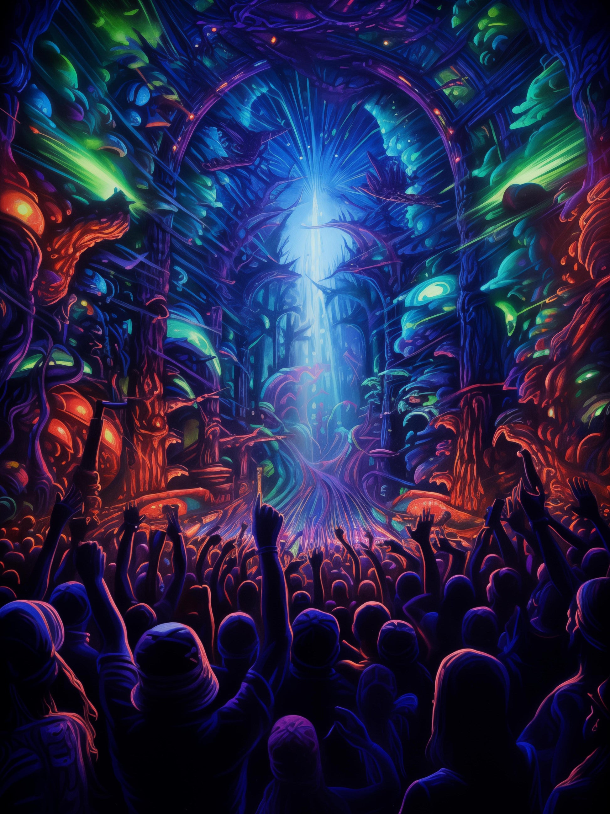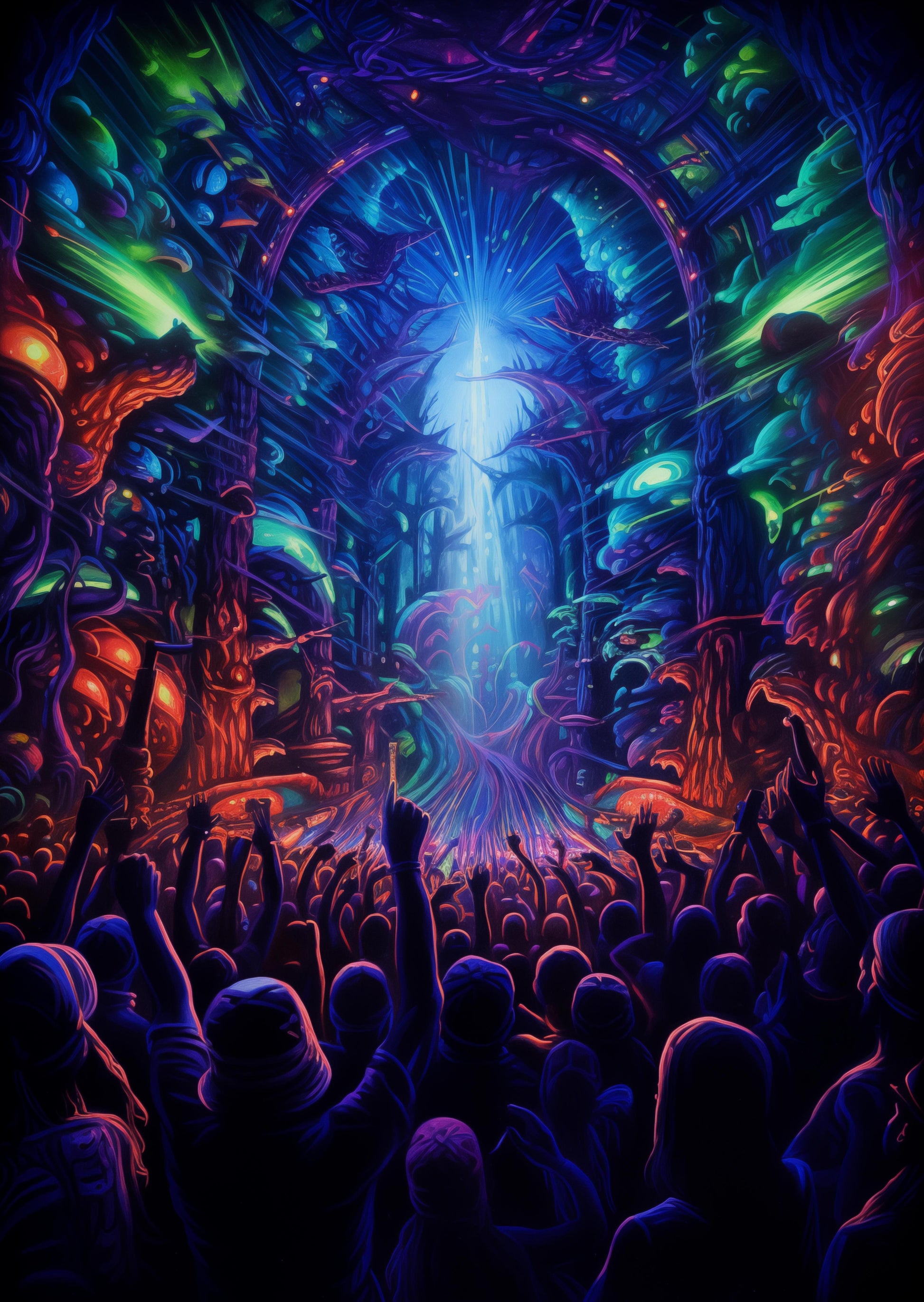 In a realm where color cascades like liquid rainbows, a gathering of silhouettes stands mesmerized by a spectacle of light and energy. Arms rise in unison, reaching toward an ethereal glow that pierces the otherworldly canopy above. A force, glowing with the intensity of a thousand suns, sends vibrant ripples through the air, painting every surface with the vibrant hues of an alien borealis. The crowd, bathed in this riot of color, shares a moment of awe, connected by the spectacle that unfolds before them. This convergence, vivid and pulsing with life, is a celebration of the unseen, a dance of light and shadow in a cathedral not bound by the mundane.