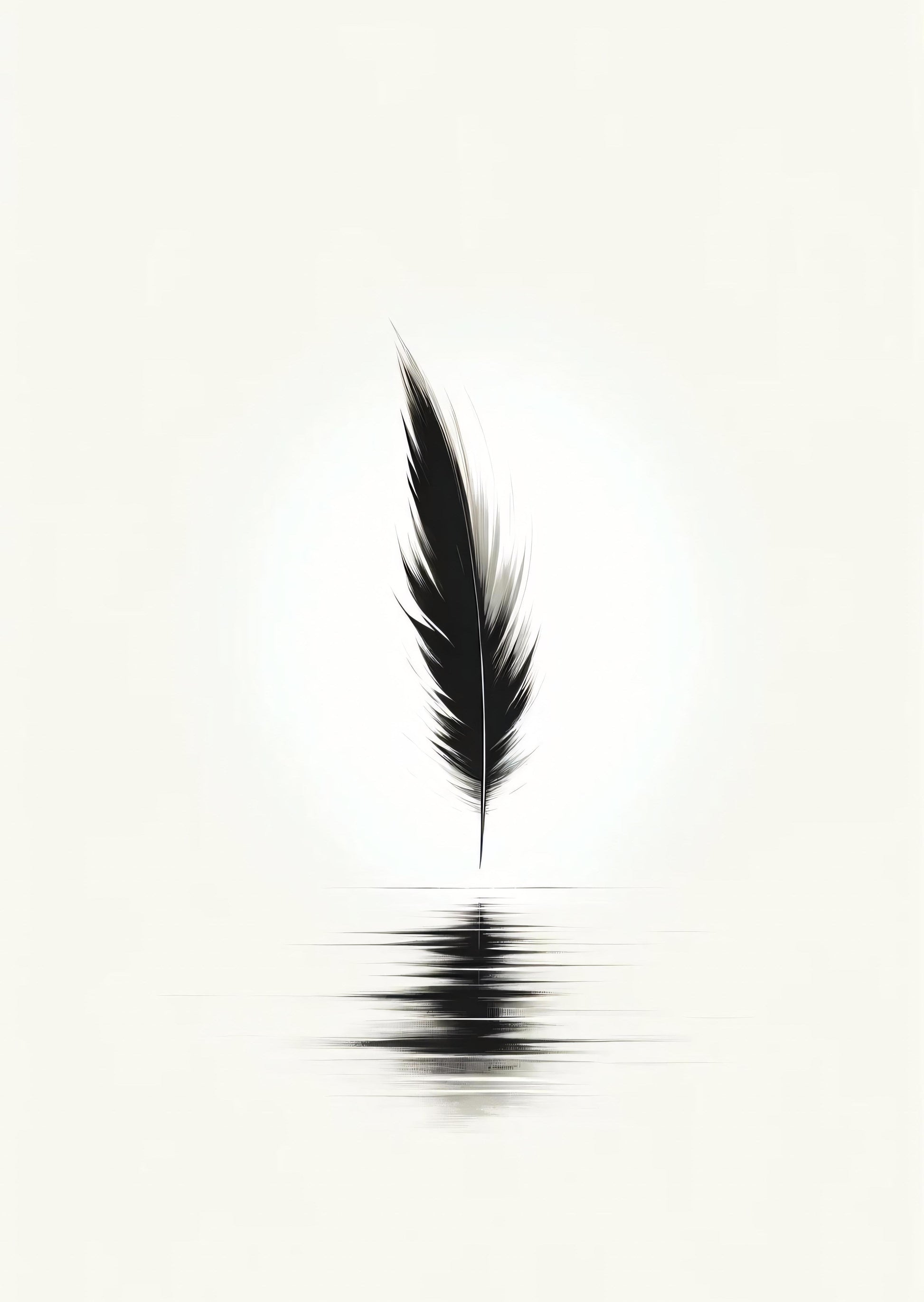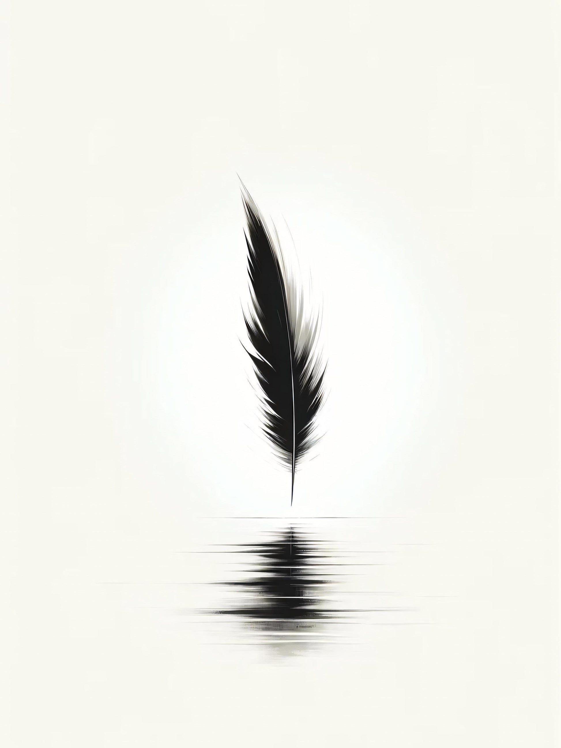 In a vast space of nothingness, a lone feather floats above its mirror image. This simple sight speaks volumes about existence. Like the feather, we are all unique, yet part of something bigger, connected to others and reflected in them. Light as the feather, life is both delicate and resilient, capable of drifting on the slightest breeze or withstanding fierce winds. Each of us leaves a mark, a ripple in the world, mirrored in the lives we touch. The feather's presence reminds us that our actions and words cast reflections far beyond our immediate view. It's a story of connection, impact, and the gentle dance between individuality and unity.