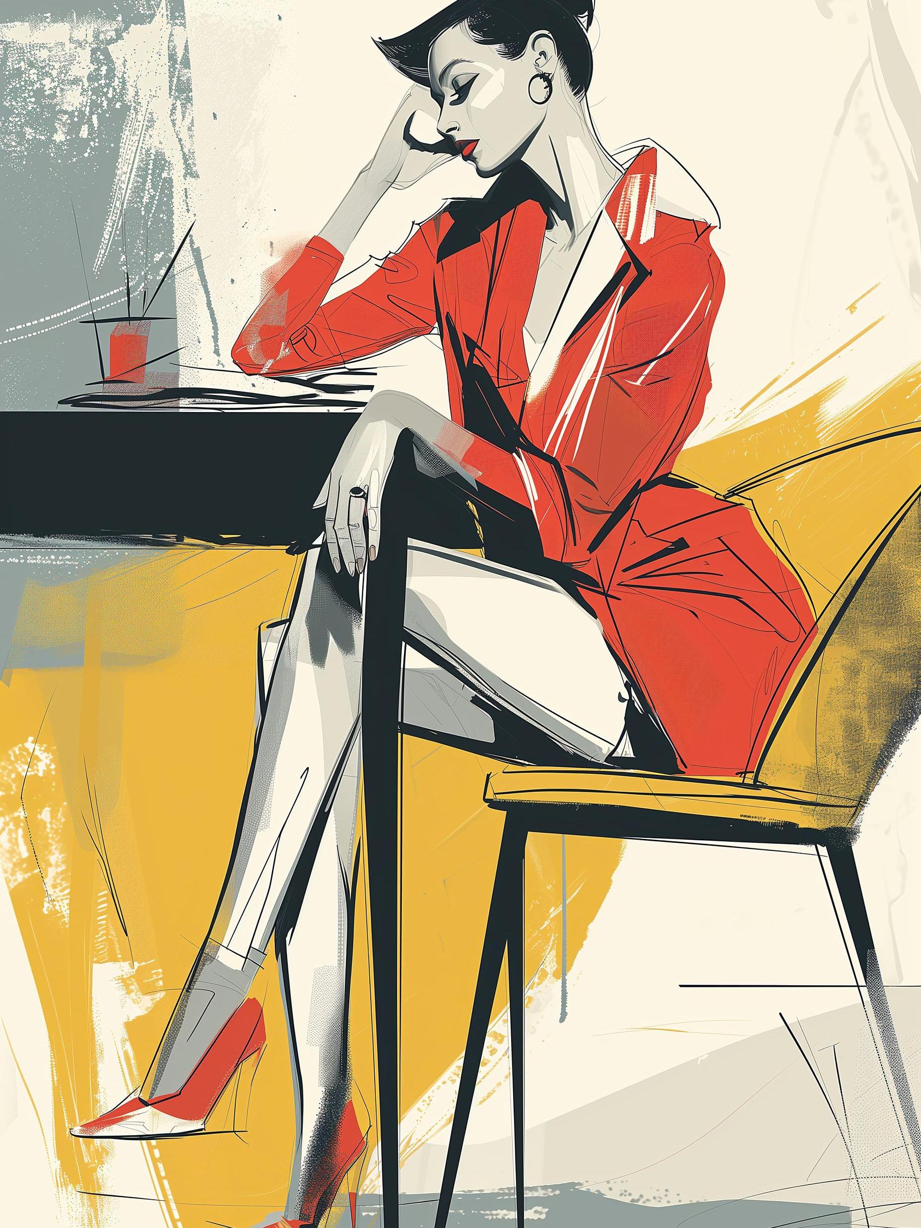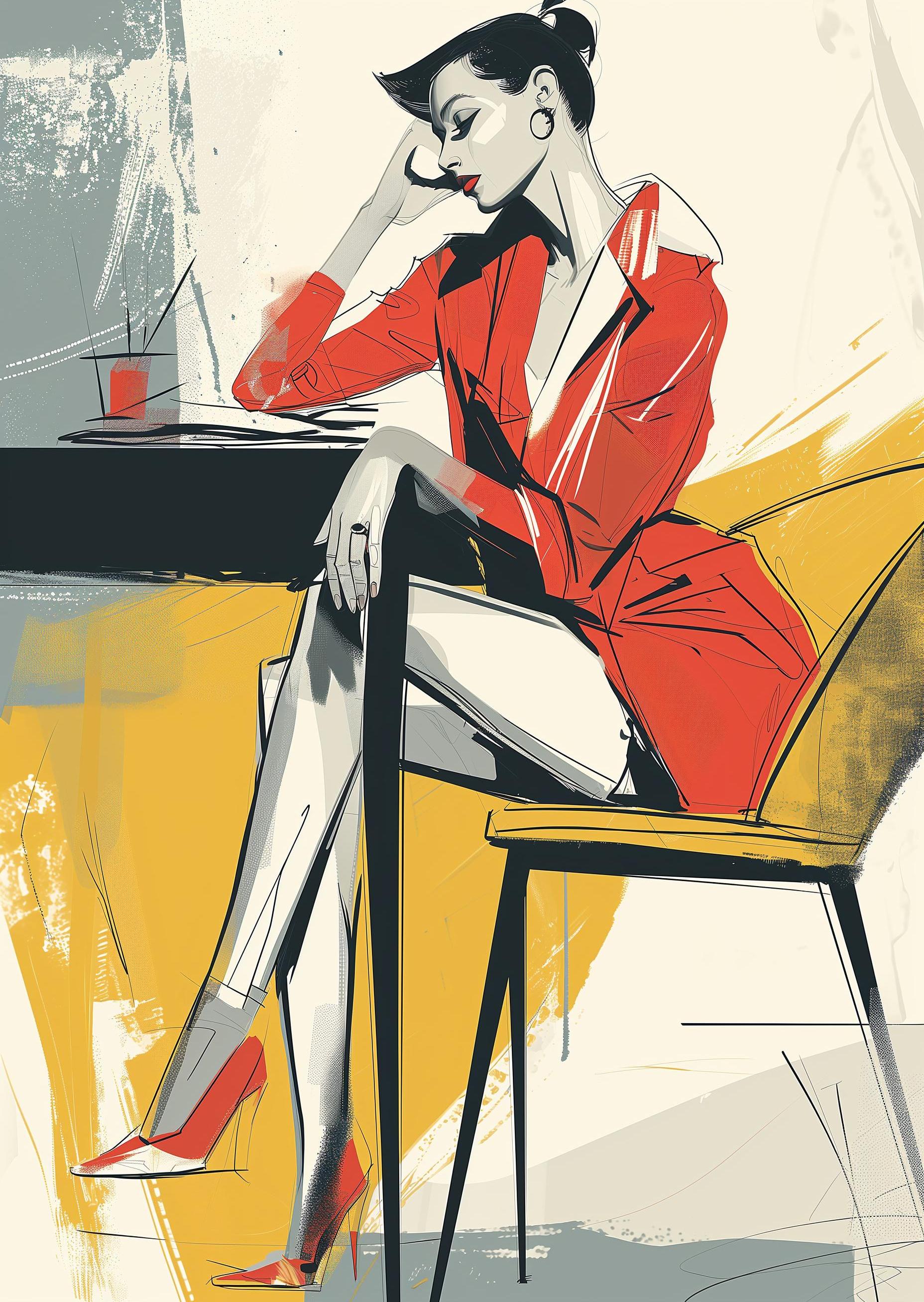 In a bustling city cafe, a lady in a striking red jacket sits lost in thought. Her elegant pose captures the mood of a long day turning into a reflective evening. A bold drink rests on the table, untouched, echoing her vivid presence. Her mind, a canvas of memories and dreams, is as rich as the vibrant yellows and soothing greys around her. In this moment, captured in strokes of confidence and color, she personifies the quiet power of pausing in a world that never stops moving.