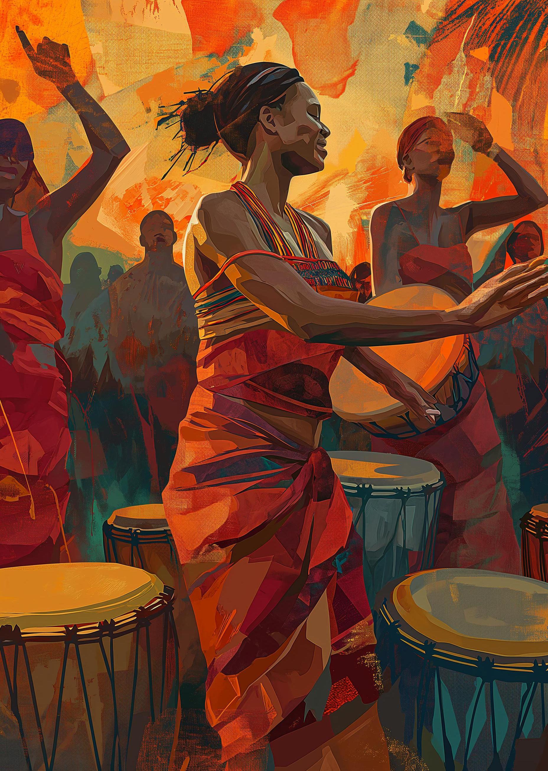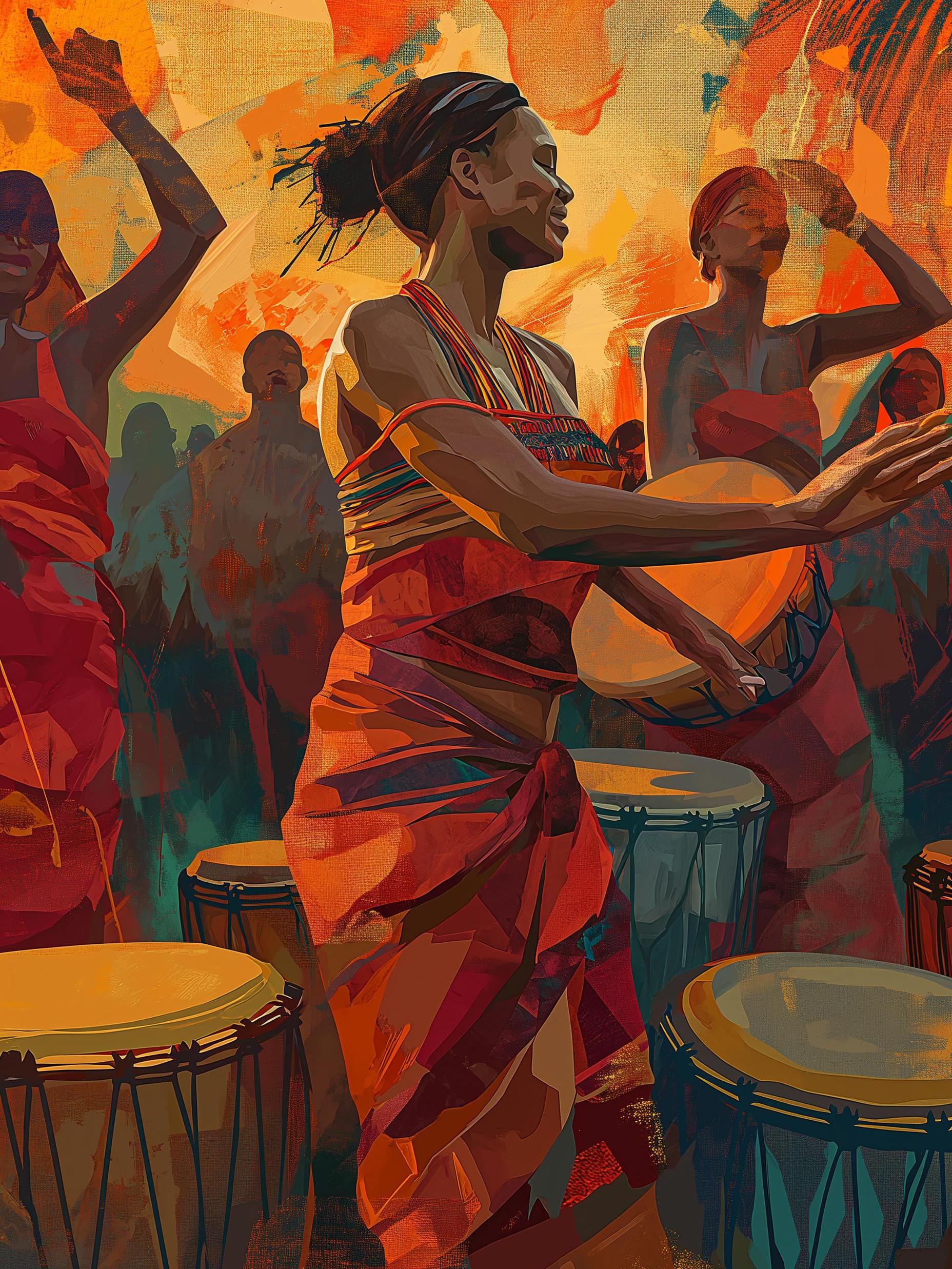 In the warm glow of the setting sun, a group of musicians gathers. The beat of drums fills the air as vibrant rhythms dance upon the breeze. With each strike, the drummer tells a story, her movements full of passion. Around her, the others follow, their hands and spirits rising and falling in unison. The pulse quickens, hearts synchronize, and for a moment, everyone is united in a lively celebration of sound and life. It's a scene of joyful expression where every beat is a word, every rhythm a sentence in the tale of their shared exuberance.