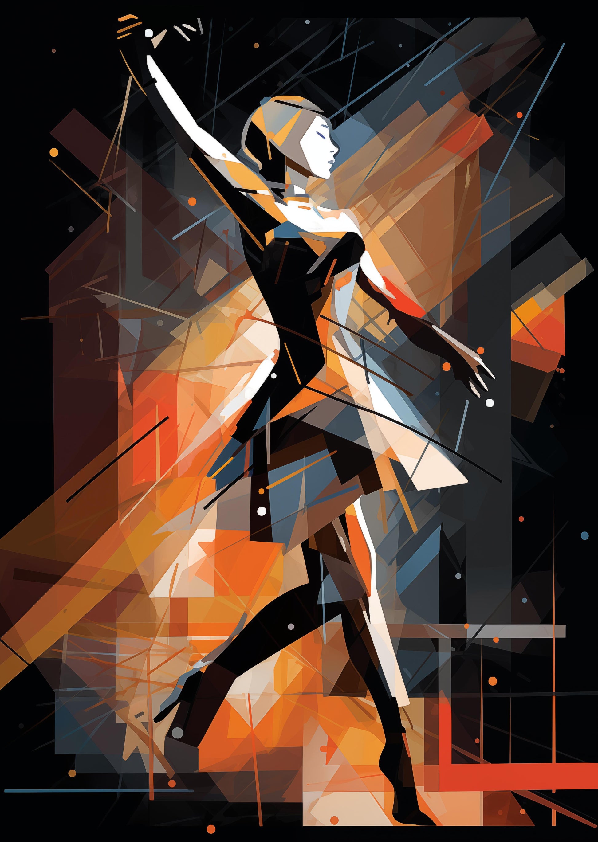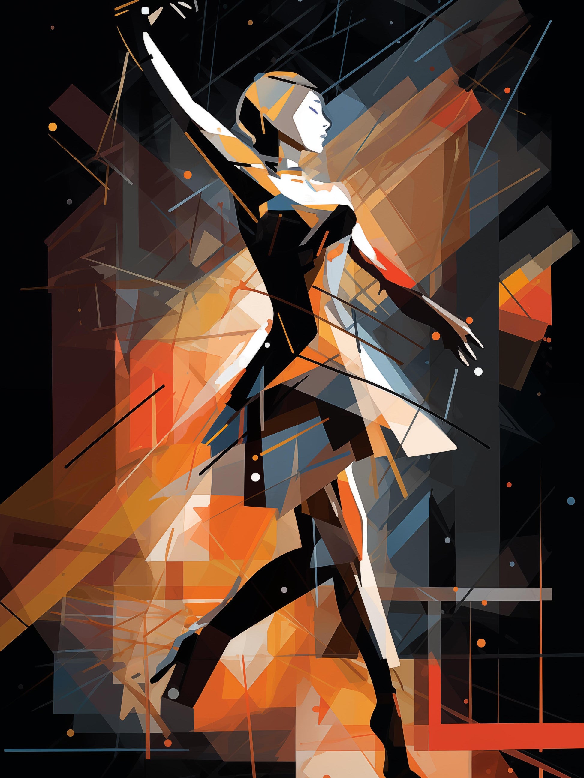 The image shows a vibrant, geometric depiction of a dancer, her limbs casting dynamic shadows as she moves to an unseen rhythm. Amidst a flurry of sharp angles and contrasting colors, she becomes the embodiment of the music that drives her. Each line and shape around her seems to pulse, echoing the beats and melody that fuel her dance. This visual symphony captures not just movement, but the energy and passion that music can ignite within the soul.