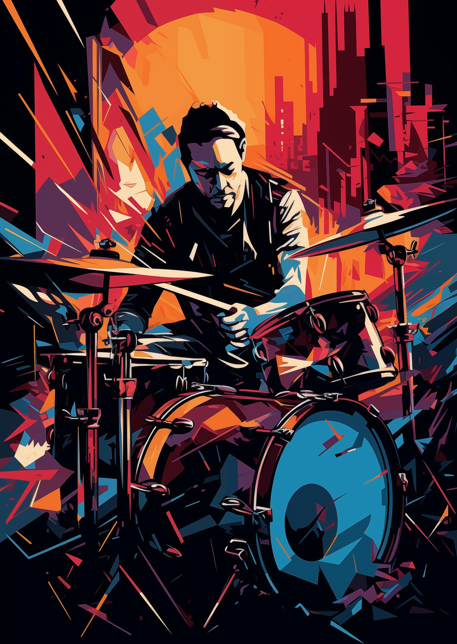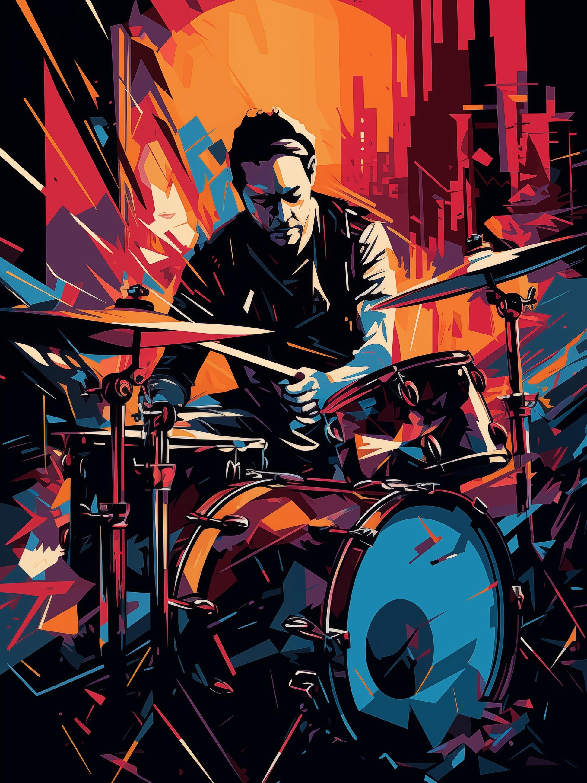 In the heart of the city, under bright lights, a drummer takes center stage. His sticks dance on the skins, a flurry of motion against the beat. Each strike is a burst of color, loud, dynamic, and full of life. The rhythm pulses like the heart of the night, drawing in the crowd, feet tapping, bodies swaying. He's not just playing music; he's casting a spell of rhythm, turning an ordinary evening into a vivid celebration of sound and movement. The drumbeat tells a story, one of passion and drive, and for a moment, the world spins to the tune of his drums.