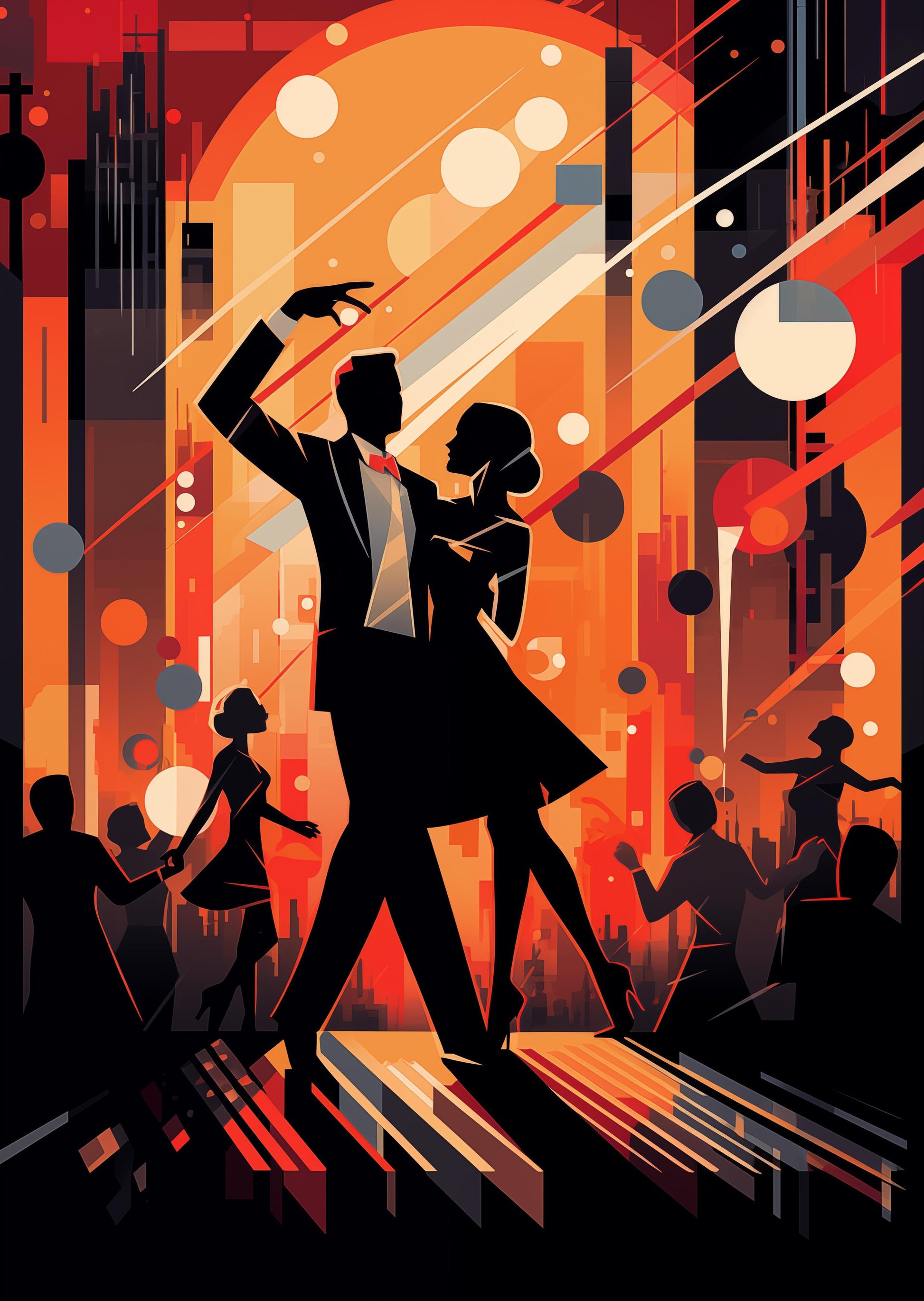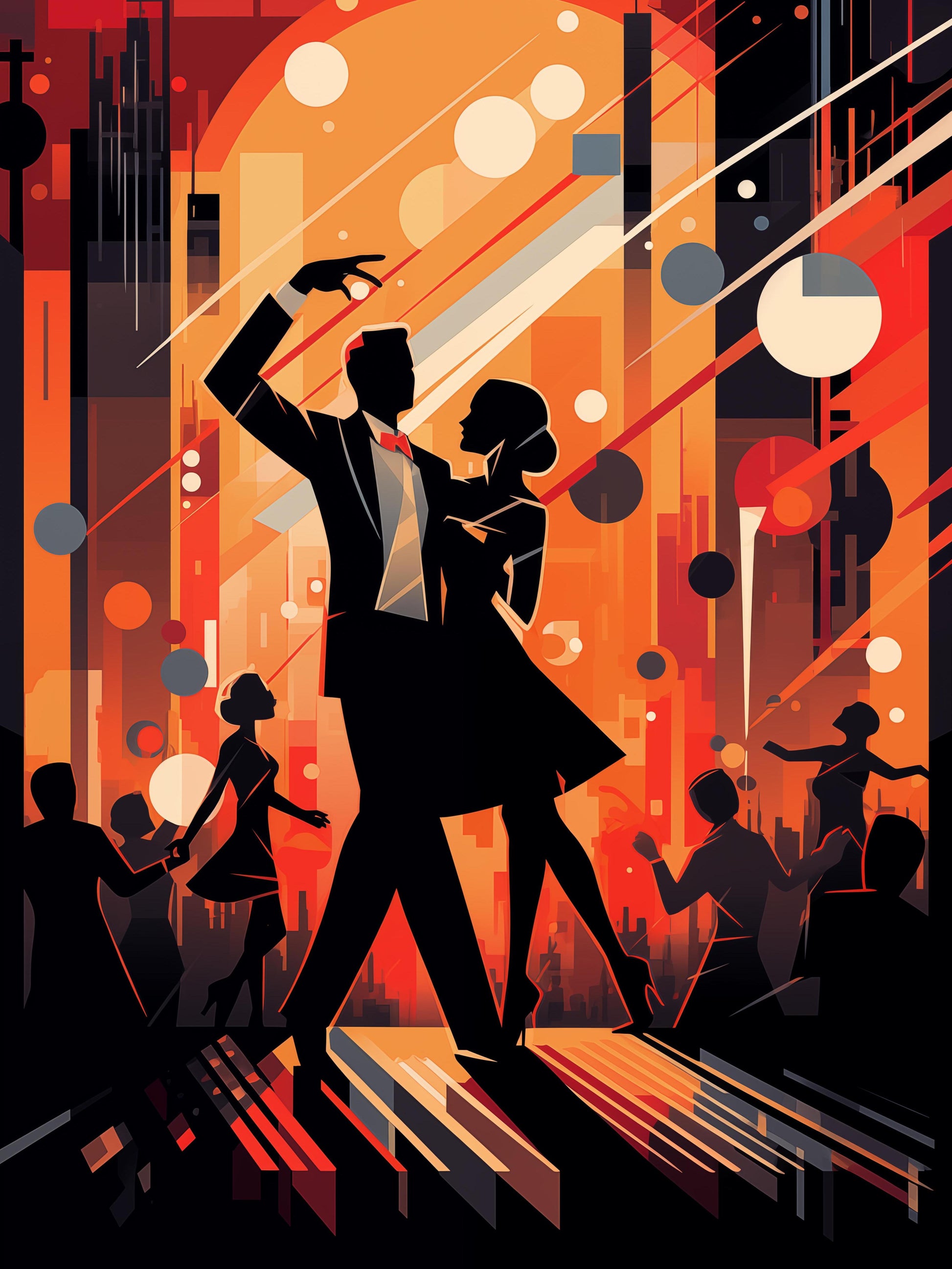 In the heart of the city, under a glowing moon, a couple dances with passion. As the band plays, they move as if they own the night, their bodies twisting and turning in a beautiful dance. Each step and spin tells a story of love, joy, and the thrill of a song. The crowd watches, captivated by their moves, feeling the beat pulse through them. It's a night where music brings everyone together, a memorable dance that echoes through time.
