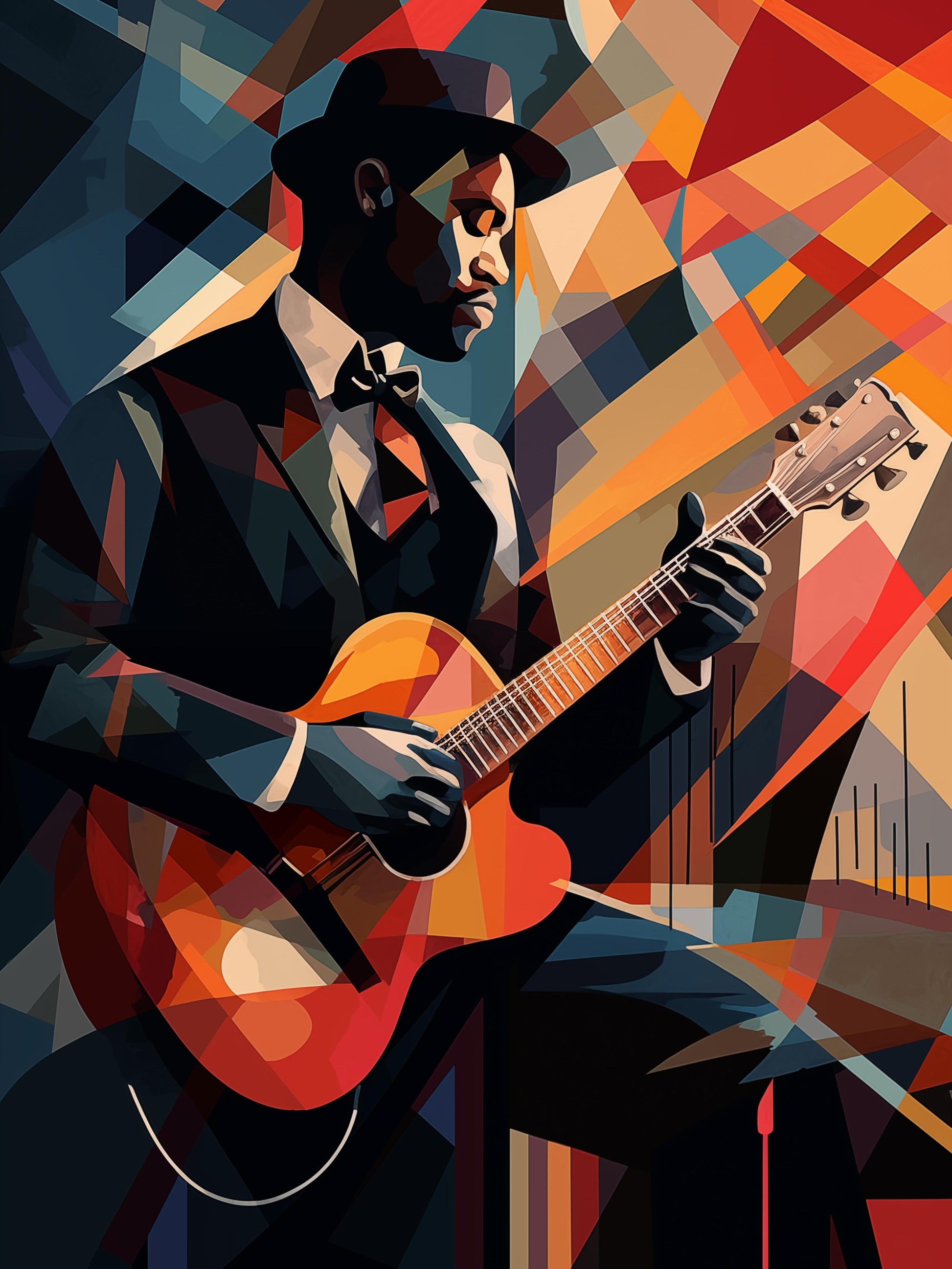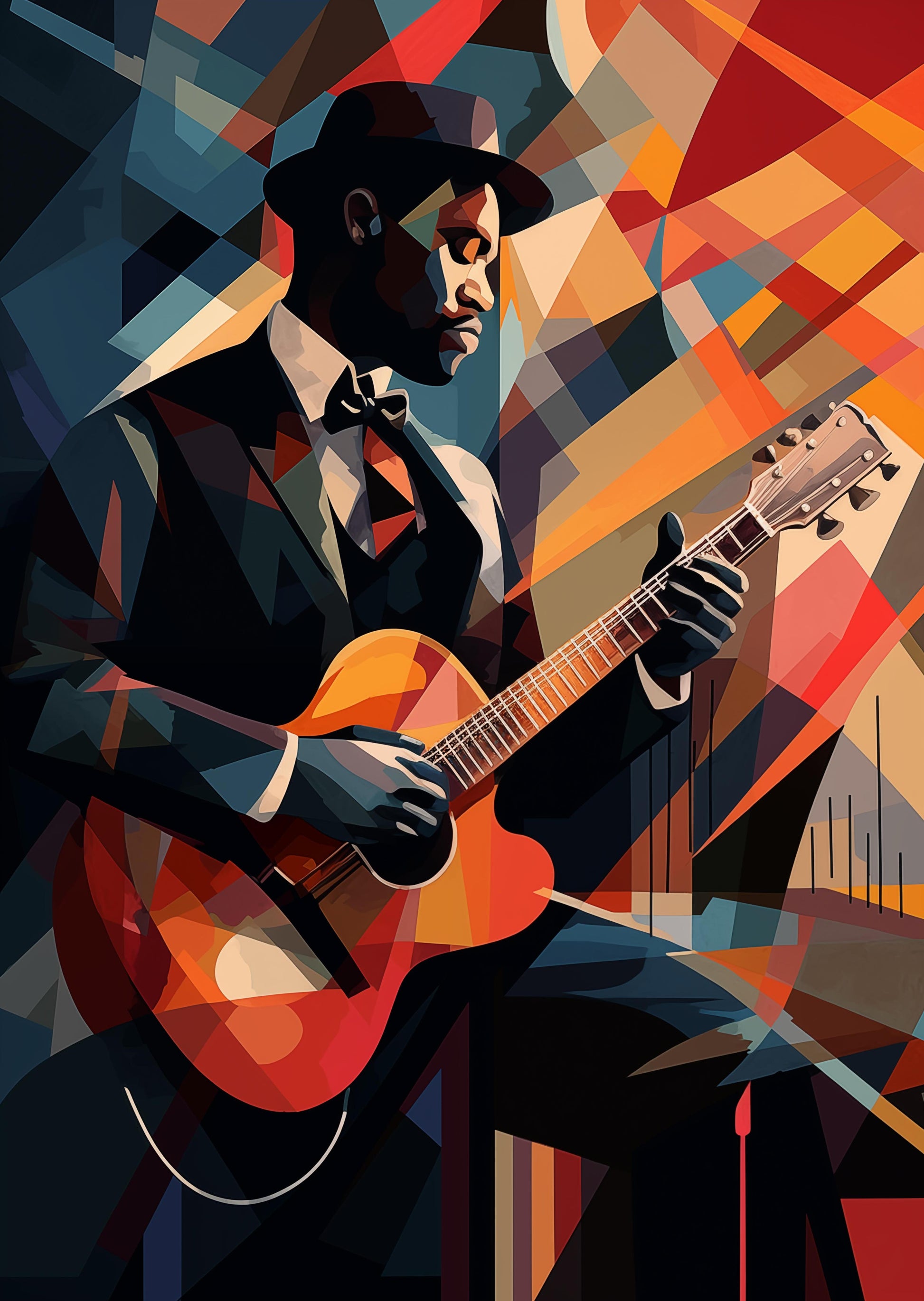 In a small town, under the soft glow of a single street lamp, a man with a guitar poured his heart into every note. Dressed in a sharp suit and hat, he played as if the strings told his life's story. The night air carried his melody, wrapping listeners in a warm embrace. His fingers danced, weaving a tale of joy, sorrow, and dreams. Each pluck of the strings was a word, every chord a sentence in his unspoken narrative, painting pictures of love lost and hope found. The music filled the street, touching souls, moving feet to tap along. The guitarist's world was his song, and for a moment, it was the world of everyone who heard it too.