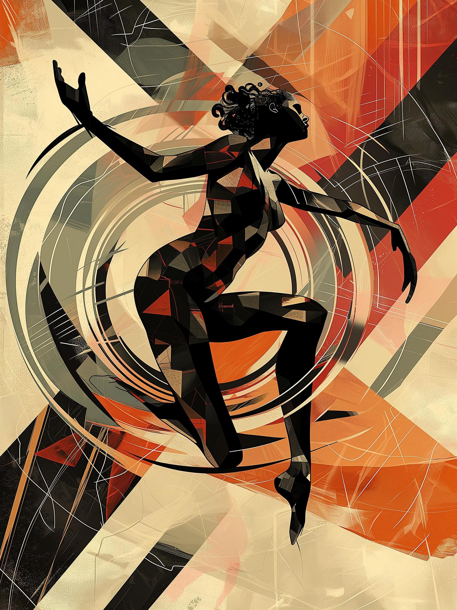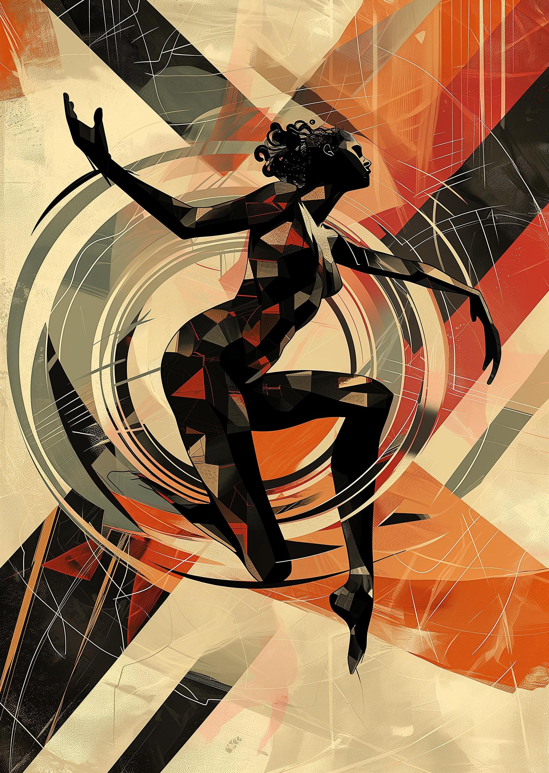 In a world where colors dance to the rhythm of music, there lived a figure made of darkness and light. She moved with grace, her body bending and twisting in sync with the vibrant swirls that surrounded her. Each step she took sent waves of red, orange, and white spiraling through the air, painting the sky with the melody she felt pulsing through her. Her dance was more than movement; it was a story told without words, a celebration of sound that could be seen as well as heard. As she raised her arms, the world spun faster, the colors blending in a lively symphony of movement, her silhouette casting a spell of joy on all who watched her perform under the canvas of imagination.