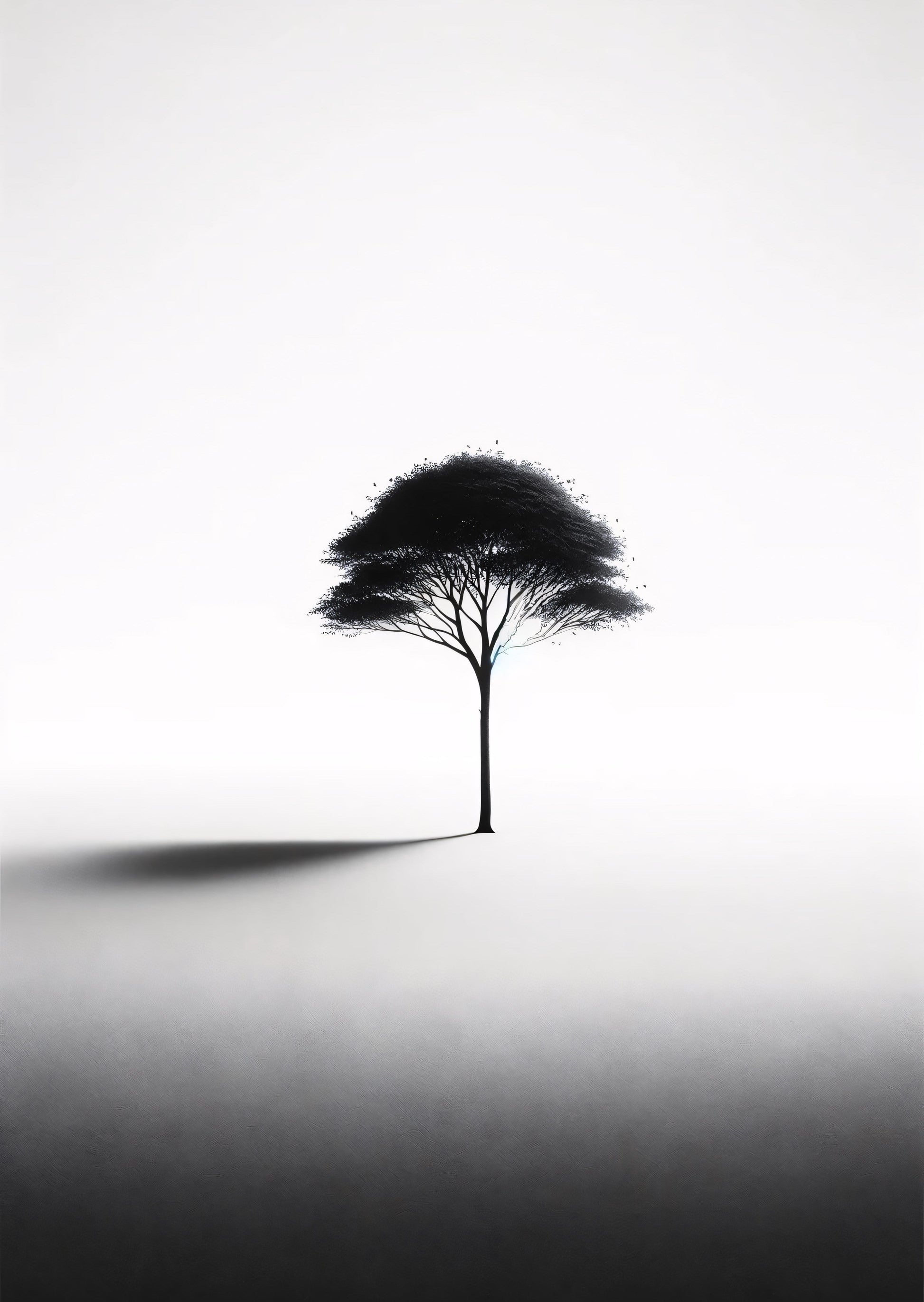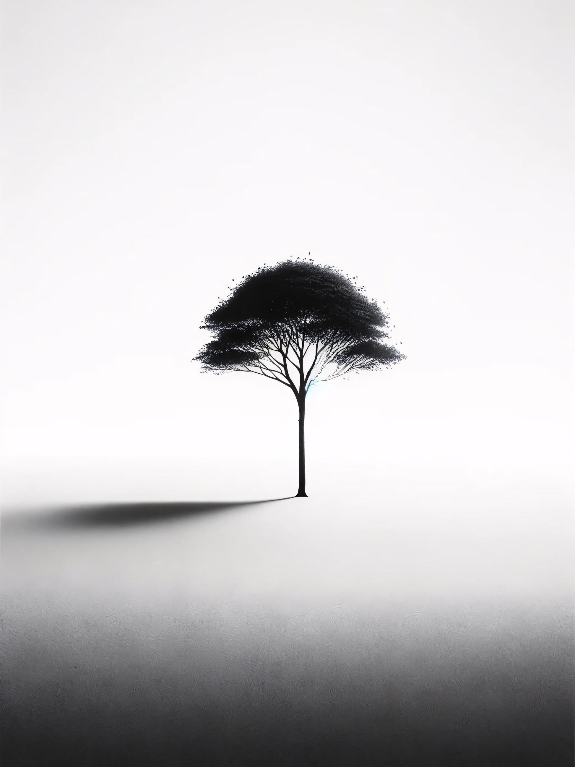 In a vast expanse of quiet, a single tree stands alone. Its branches reach out like thoughts stretching into the unknown, seeking connection. Each leaf a story, fluttering with life's fragile dance. Here, in the gentle embrace of open space, the tree reminds us of strength in stillness. The roots, unseen, delve deep, clasping the earth with a silent promise to endure. This lone sentinel symbolizes how life persists, how beauty flourishes even in simplicity, and how each of us is a unique presence in the vastness, rooted yet reaching.