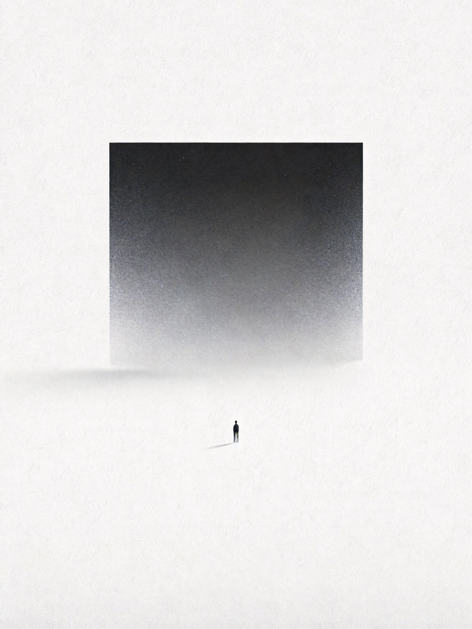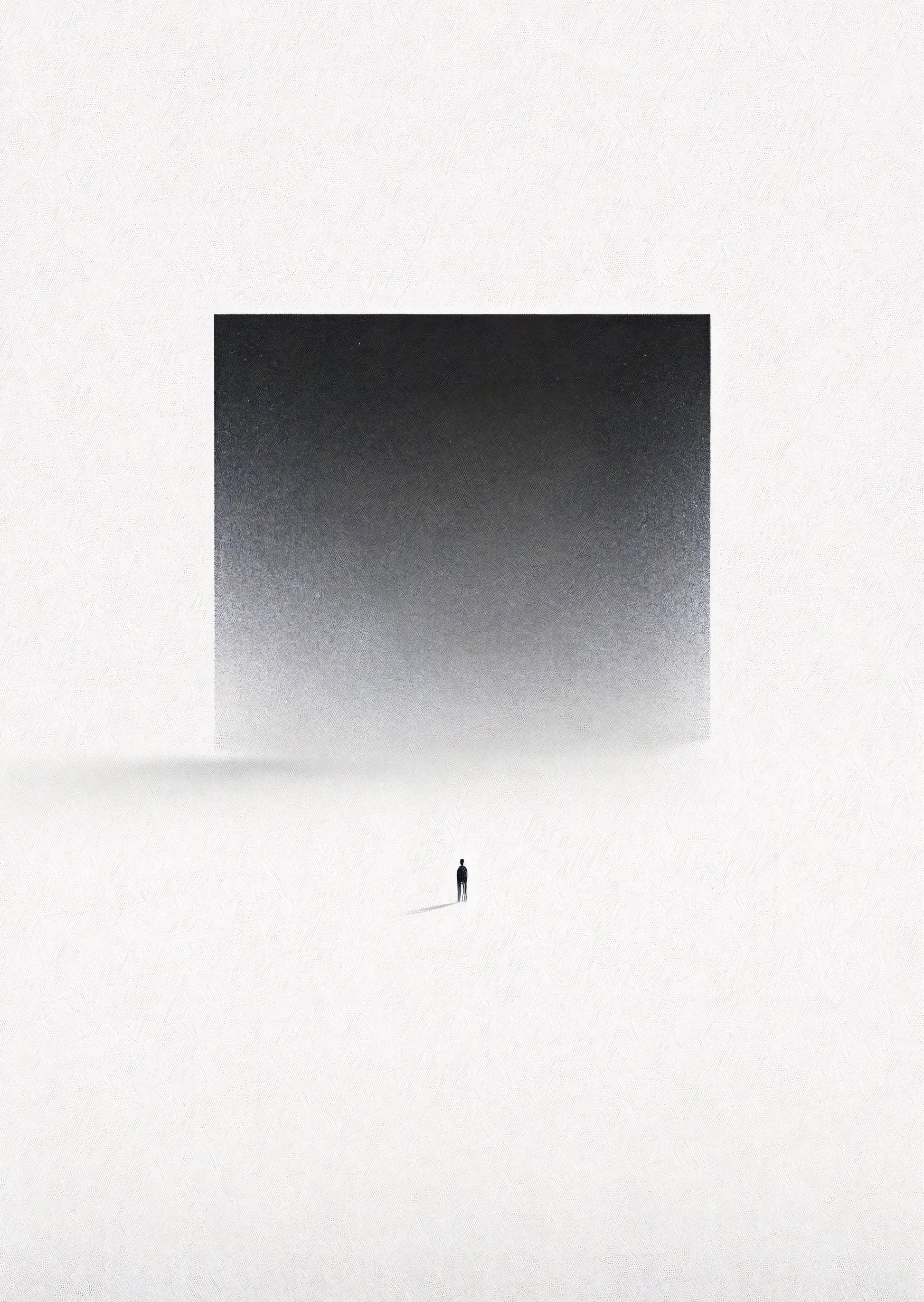 In a vast expanse of white, a lone figure stands before a great dark square. The stark contrast between the light and the dark speaks of life's dualities: knowledge and the unknown, presence and absence. This singular person, dwarfed by the immense darkness, faces the unknown, a reminder that within the vastness of our world, one's own existence can feel small, yet profoundly significant. This image inspires us to recognize our own place in the larger context of life, urging us to confront the unknown with courage and curiosity.