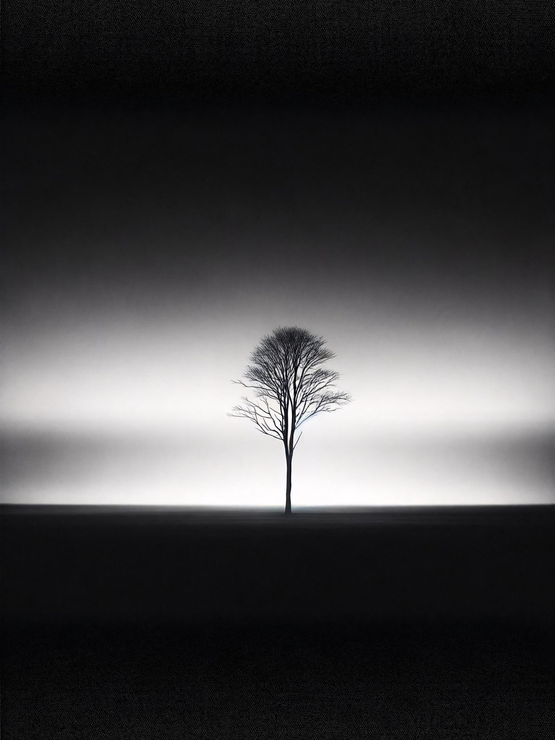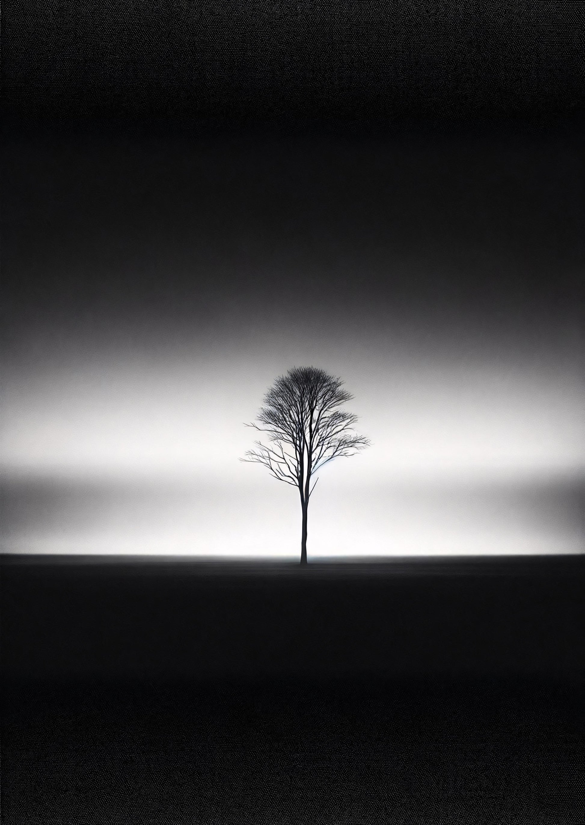 In a vast space of gentle grays, one tree stands alone. Against soft light and endless land, it tells a tale of resilience. Life, it suggests, often calls for standing by oneself, facing the vast unknown. Its branches reach out, yet hold no leafy companions. It's a sentinel of time, witnessing the passing of days and the quiet flow of seasons. As the sole character in a minimalist stage, the tree symbolizes strength and the silent dignity of existence despite solitude.