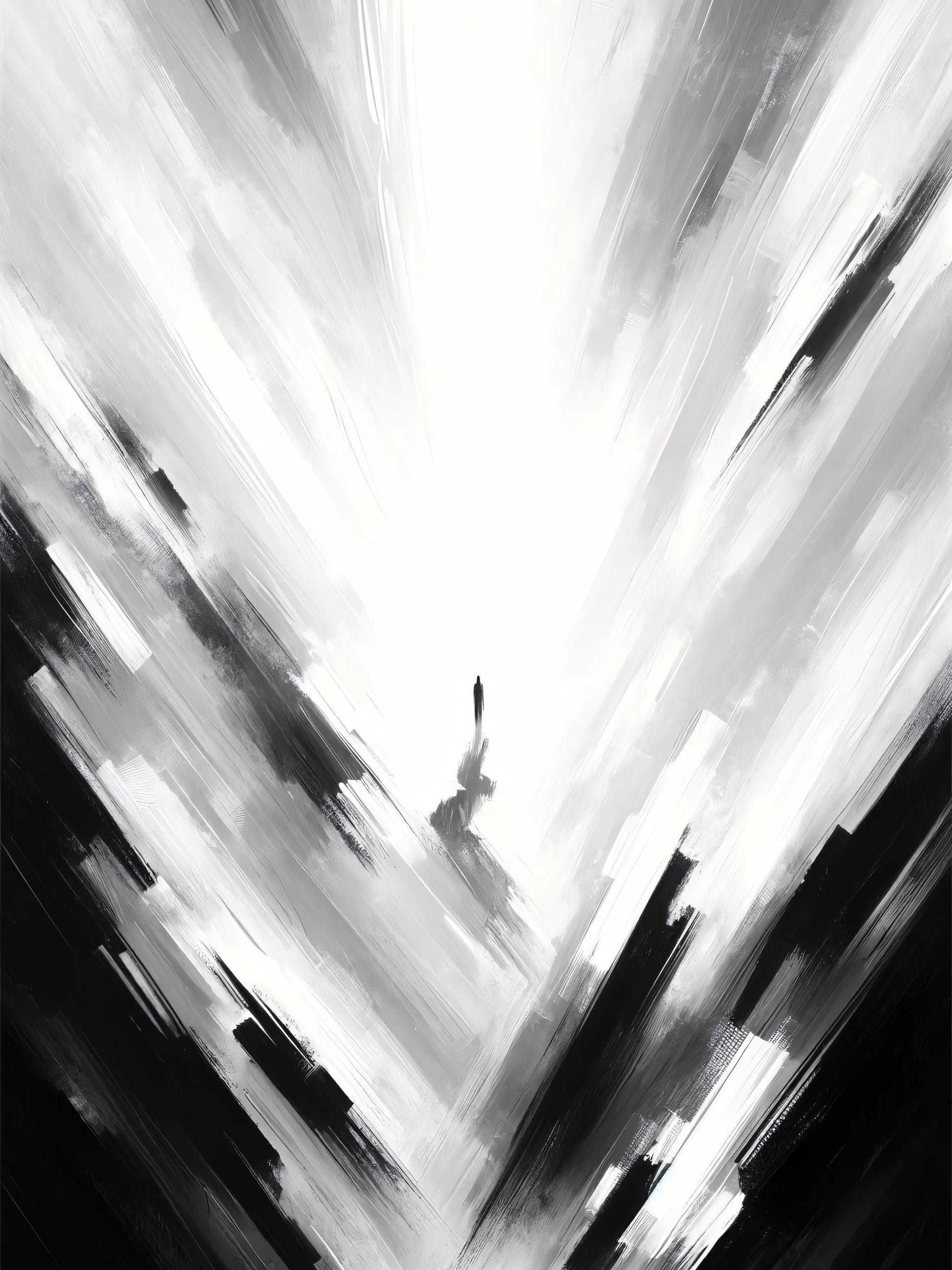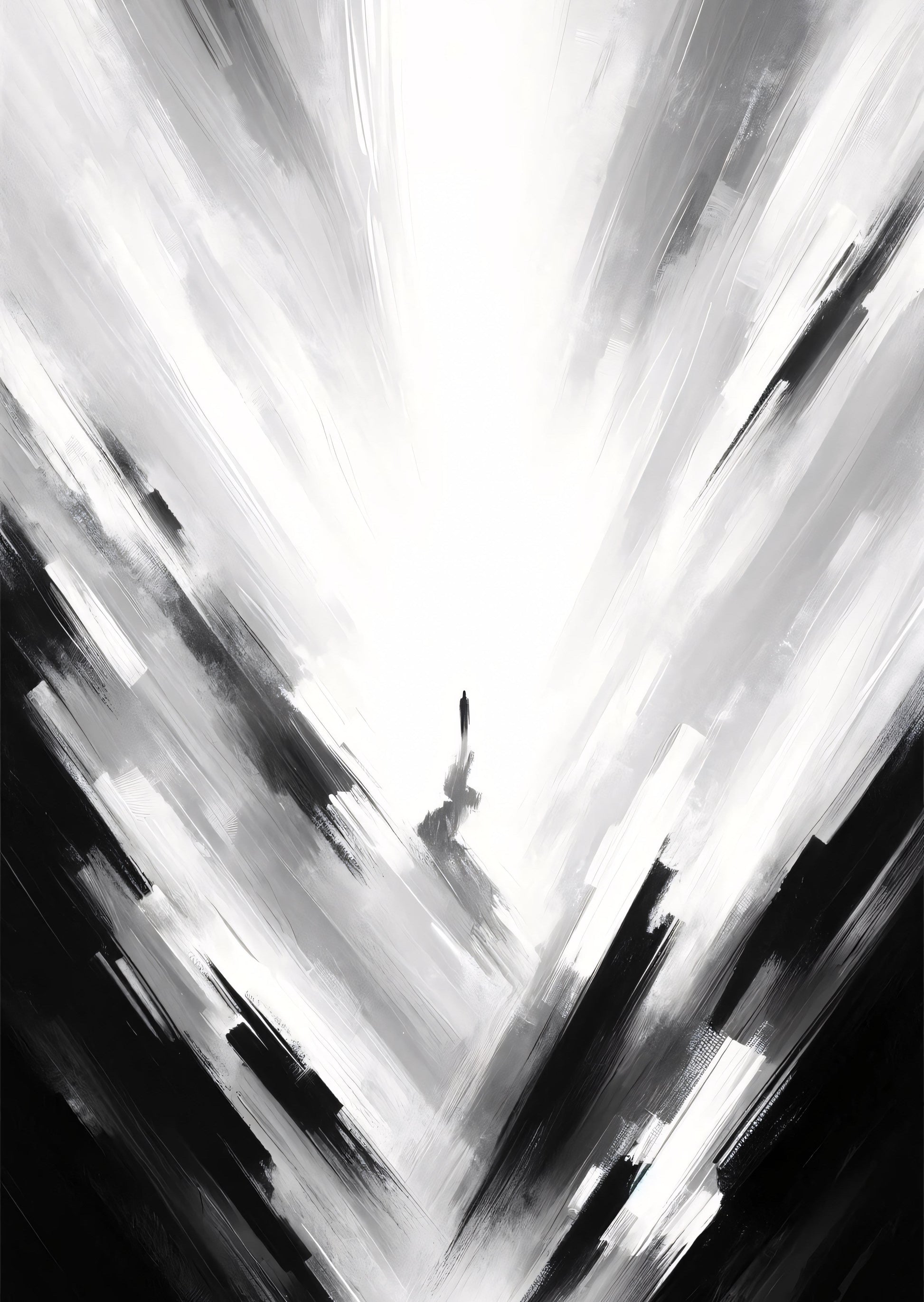In a world painted with strokes of black and white, a lone figure stands at a crossroads amidst a swirling dance of light and shadow. A journey awaits, undefined and uncharted, compelling the traveller to choose a path through the contrasting realms. Each step is a bold mark on the canvas of existence, a statement blending into the grand tapestry where every choice paints the story of life. Will the figure merge into the light, carve through the darkness, or find a unique trail that balances the two? This image captures the essence of decisions, big and small, that mold our destiny in the ever-changing masterpiece of our lives.
