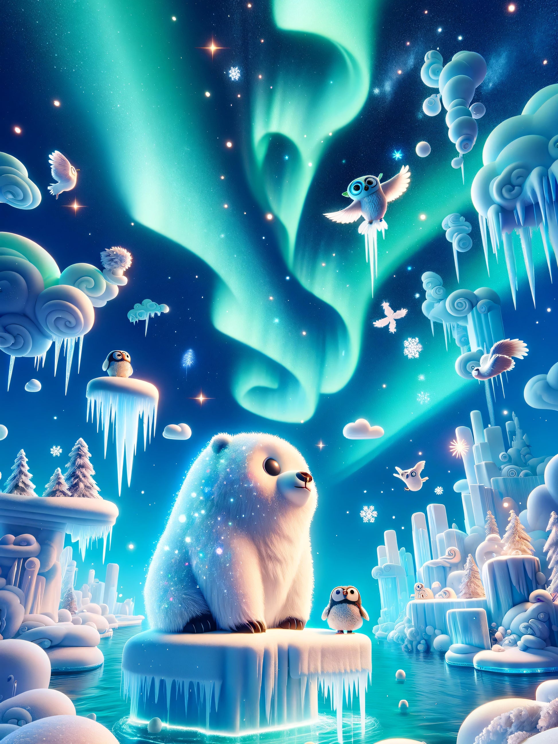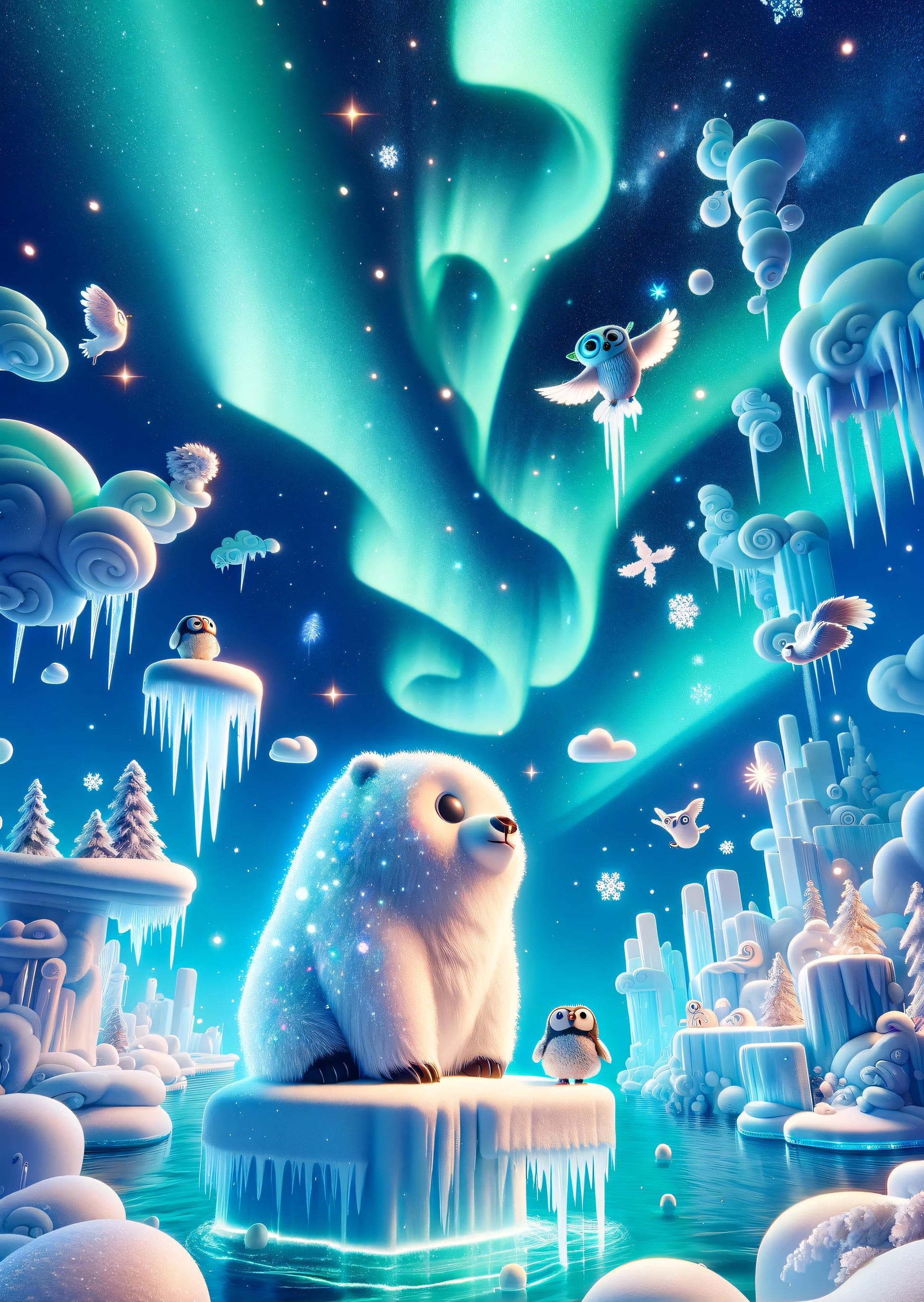 In a magical, icy world, creatures great and small gathered under a mystical sky full of stars and glowing lights. A giant bear, sparkling like the night, sat with a wise look in its eyes. Its presence spoke of a gentle power and a deep knowing. Near it, a curious little bird, full of life, shared in the wonder. The bear, the birds, and the sky reminded all that in a universe of vastness, every individual, no matter how big or small, holds their own light, their own importance. It was a place where the magic of existence was clear for all to see, a reminder to cherish each moment and creature in the vast tapestry of life.