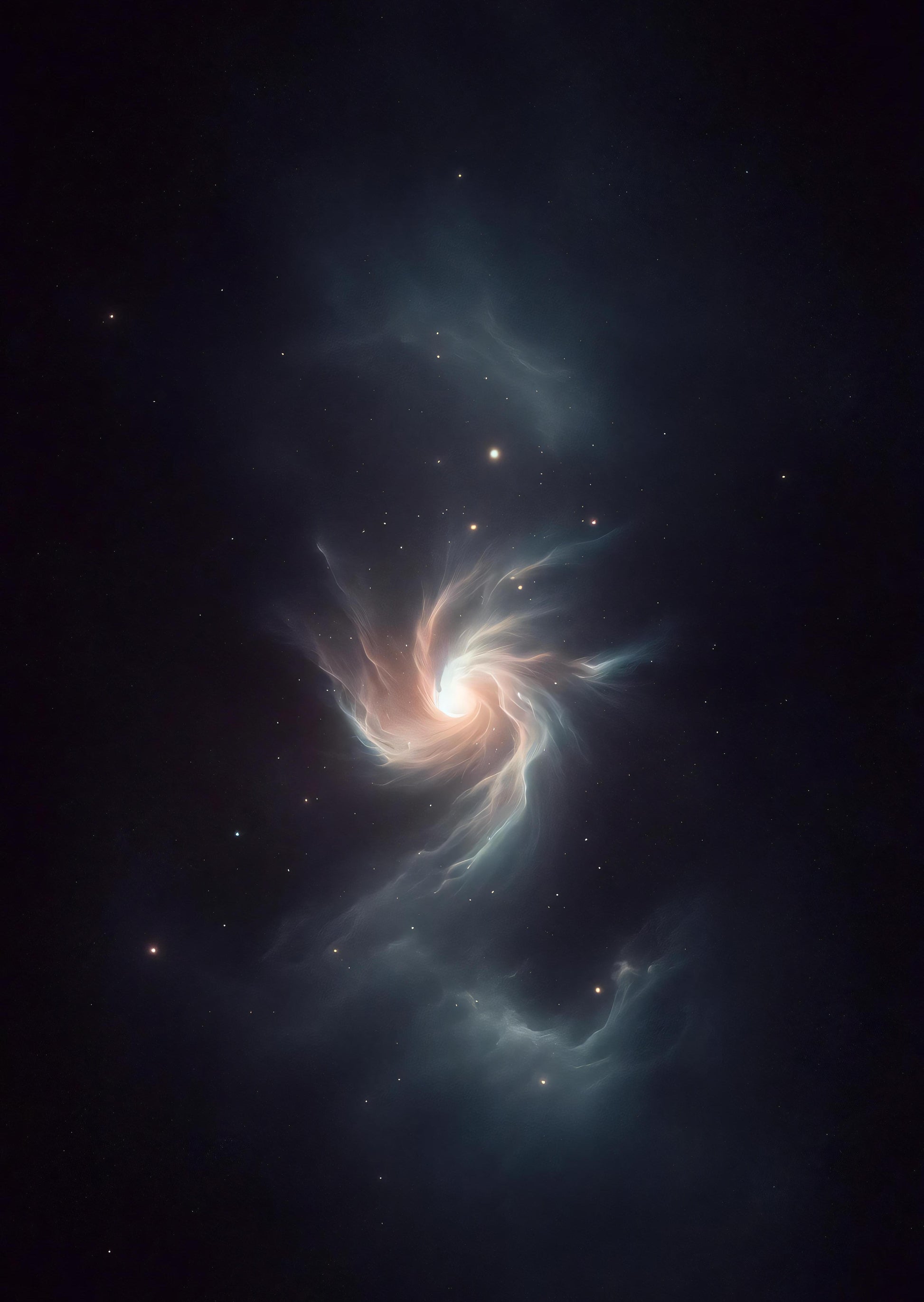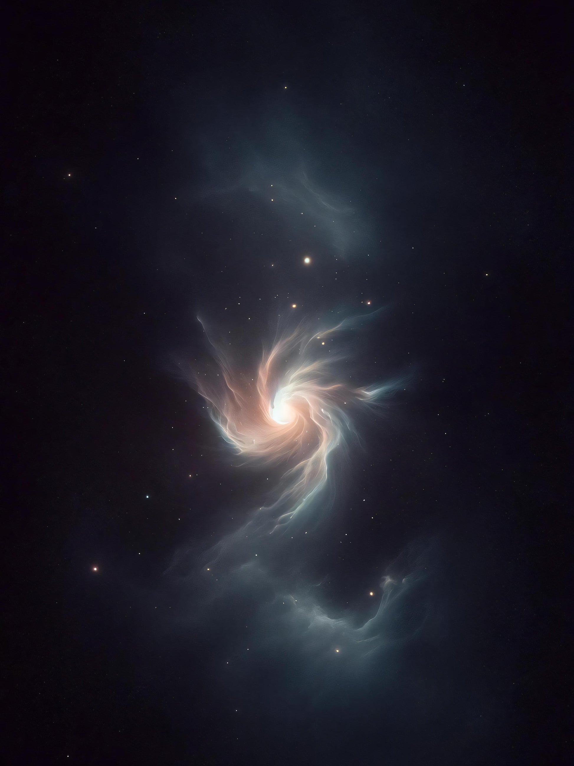 In a vast cosmic dance, a swirl of light twists amidst the quiet darkness, cradled by a canopy of twinkling stars. This celestial ballet whispers the story of life's beautiful complexity and the endless possibilities that dwell within the unknown reaches of space. The dance, both delicate and powerful, suggests that in the grand expanse, every sparkle is part of a greater whole, and each moment is a step in an infinite journey filled with wonder.