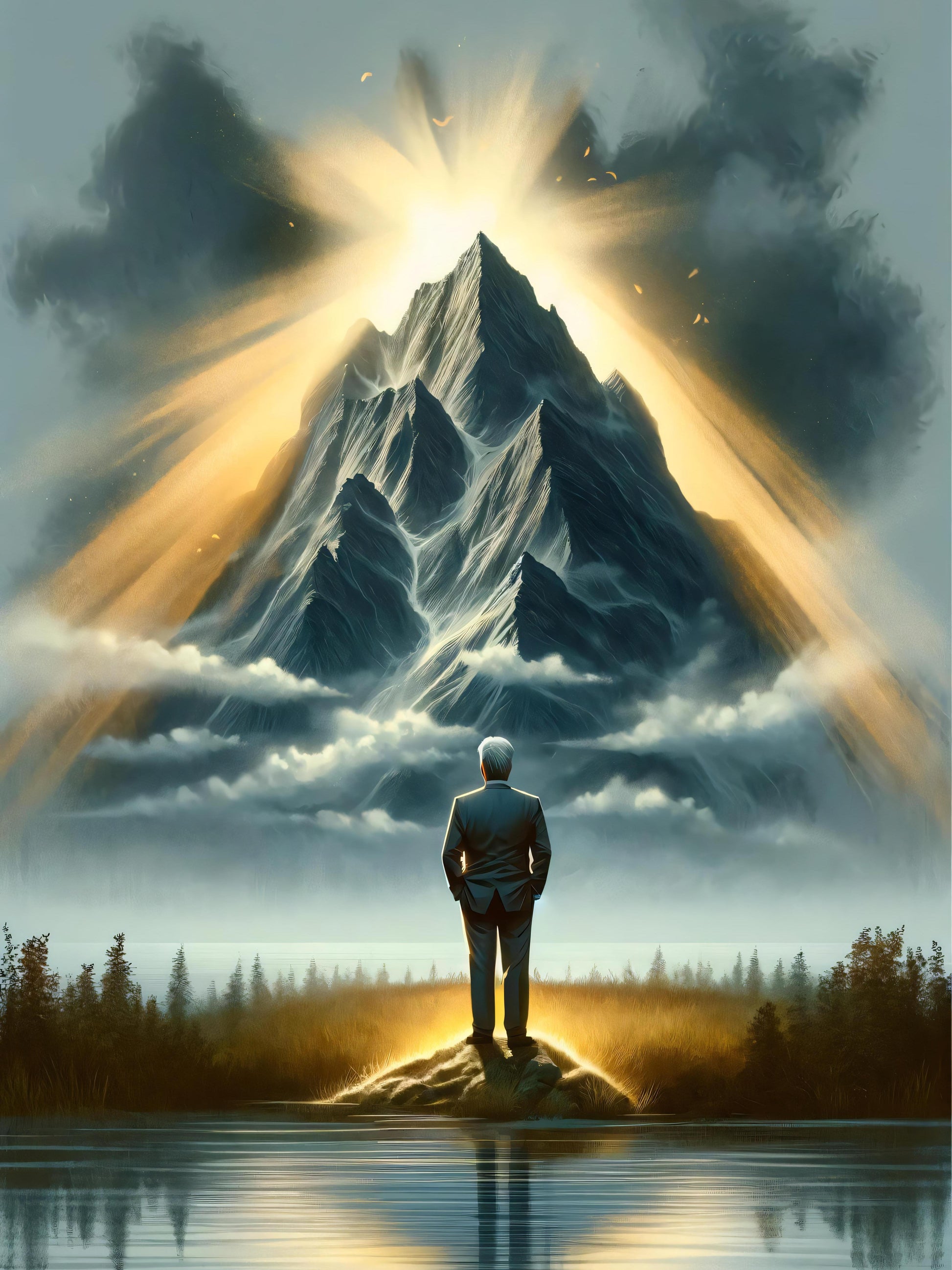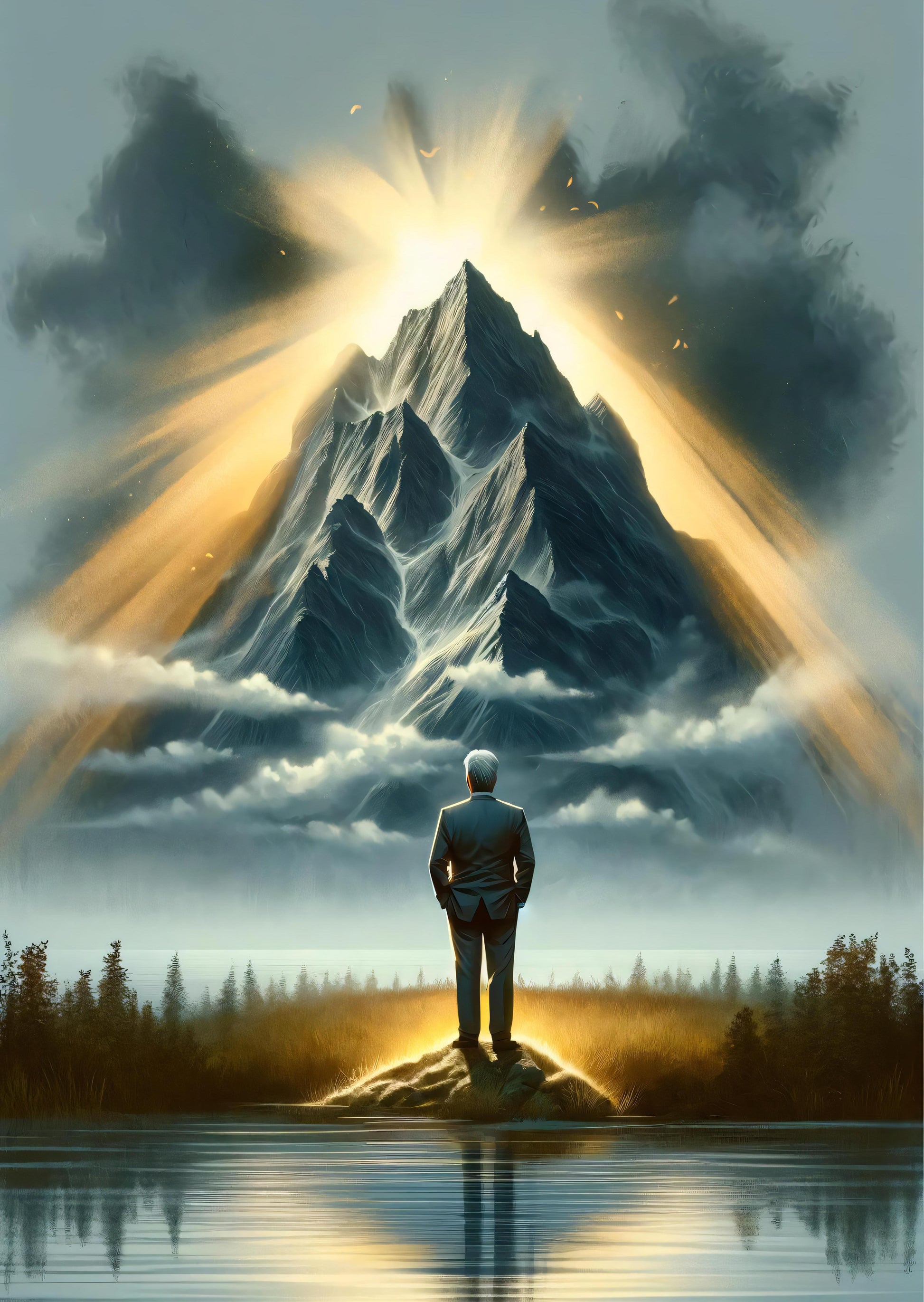 Subject: A person standing before a majestic mountain Background: The mountainous landscape radiates light from its peak, symbolizing a peak experience or personal epiphany in psychological terms, which represents moments of intense joy, personal achievement, and the realignment of reality with one's self-identity. The figure looks upon the scene, indicative of self-reflection and the quest for personal insight. This scene embodies the psychological concepts of self-actualization and the pursuit of personal goals. It also touches on the sublime nature of awe-inspiring experiences that elevate an individual's state of mind and promote mental growth.