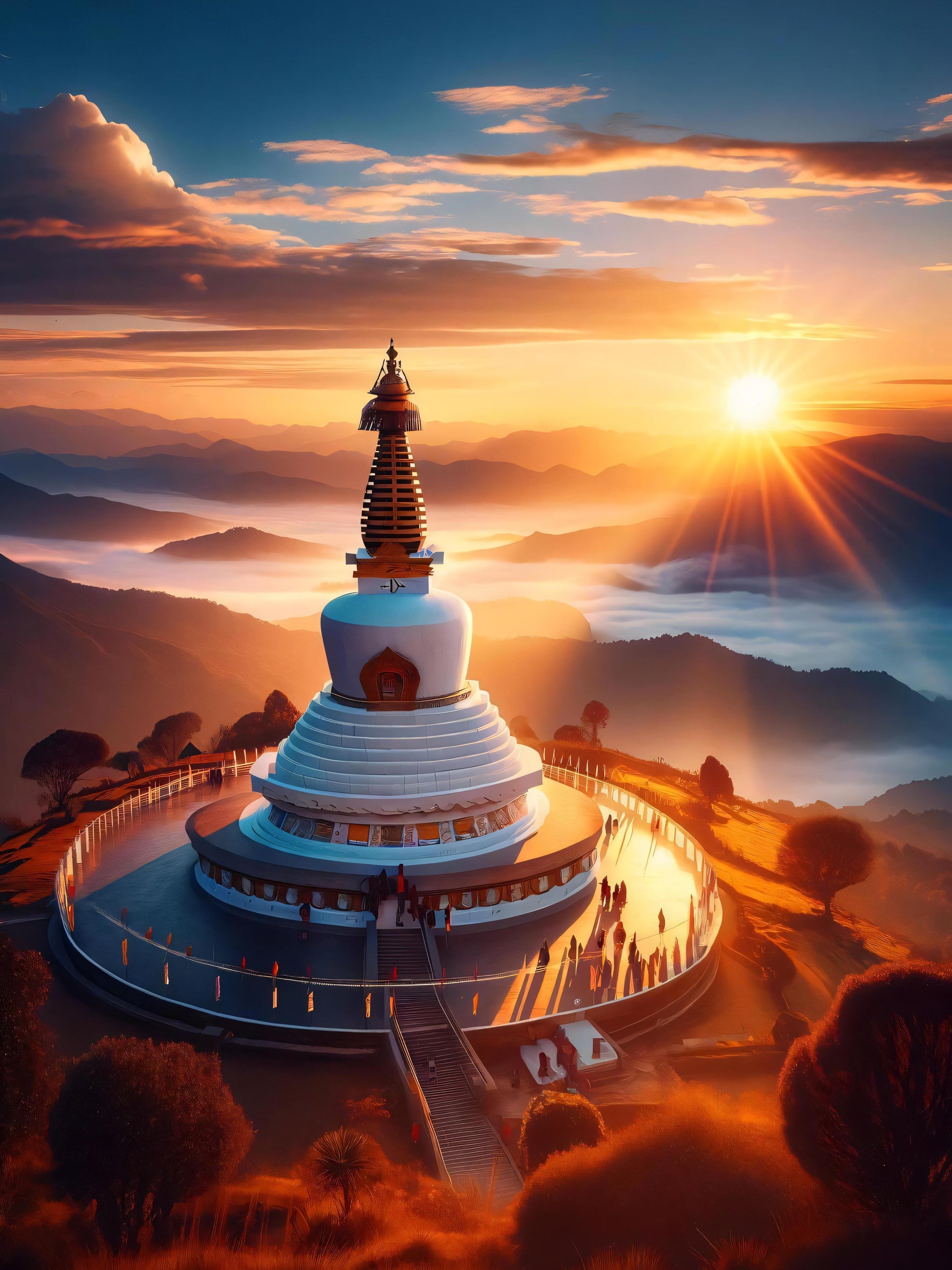 In a land where the sun kisses the hills, a white stupa stands tall, a beacon for those seeking light beyond light. As the day unfolds, people climb the winding path, each step a reminder of life's journey. They move together, their shared purpose creating a tapestry of shadows that dance with the day's glow. In this place, atop the gentle swirls of mist, the search for meaning is as clear as the dawn. They come to find peace, not in silence, but in the collective stride towards understanding. Like the sun that rises without fail, hope is reborn here, with every new light.