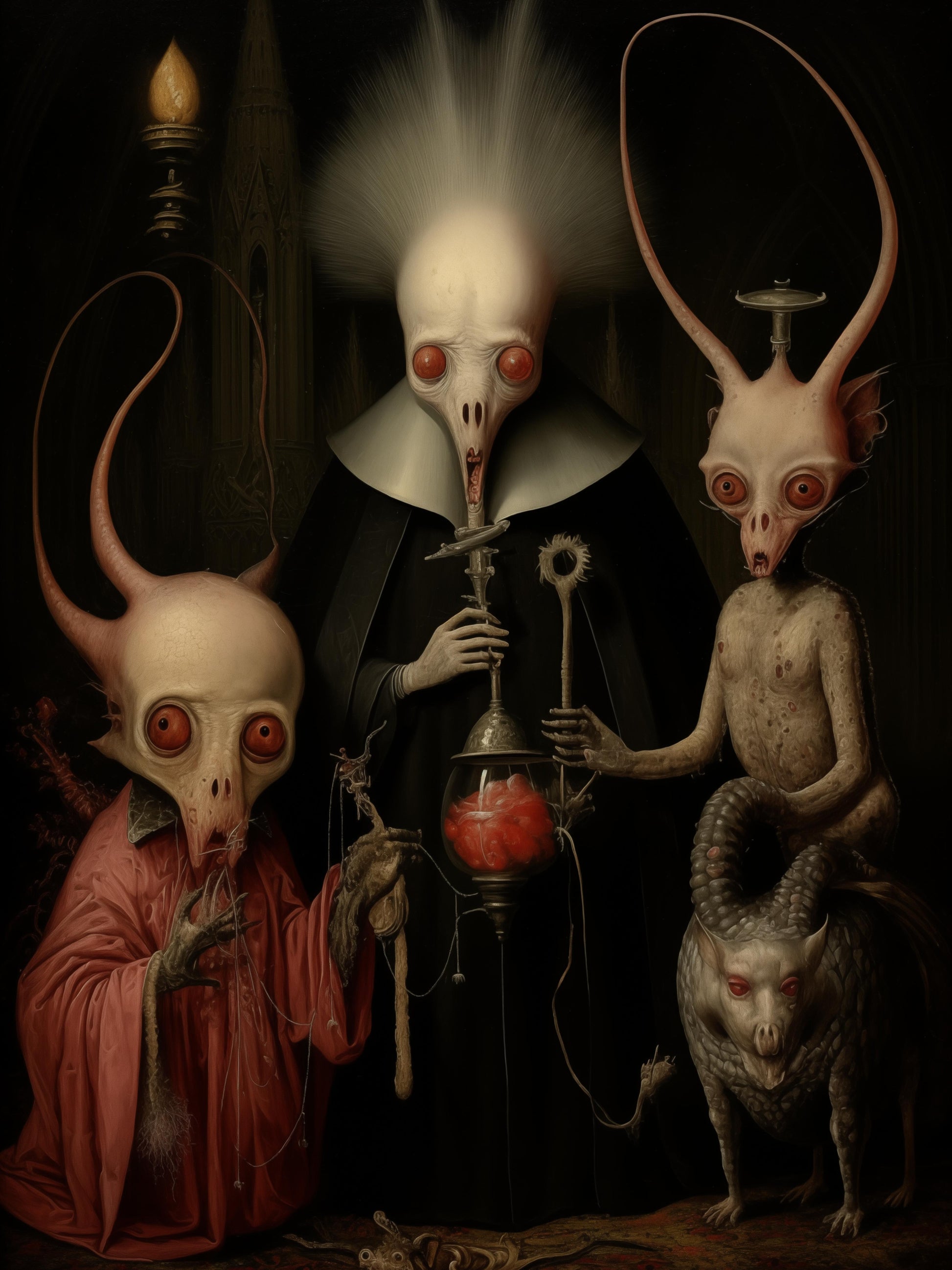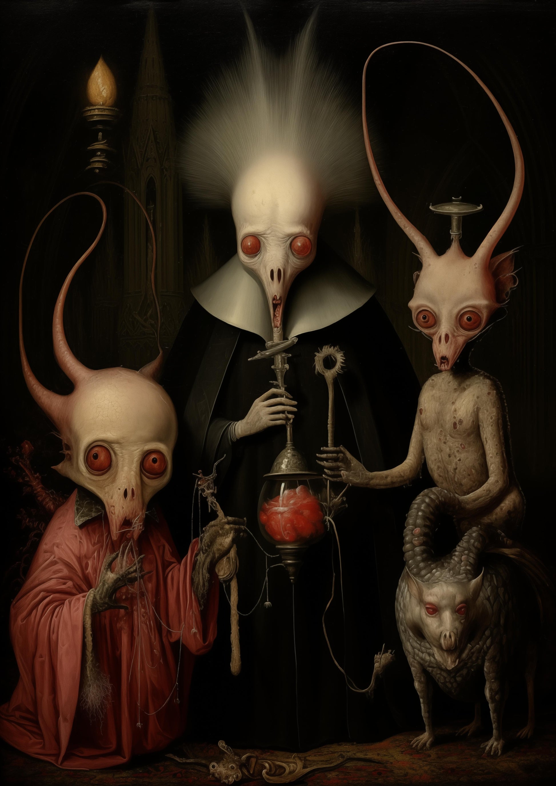 In a realm of shadows, three unusual beings gather, each one a guardian of deep truths. The central figure, robed in darkness, holds a light aloft, illuminating paths of insight. Its stark gaze reminds us that knowledge often comes dressed in mystery. To the left, another cradles the sands of time, revealing that our moments are fleeting, urging us to grasp them before they slip away. On the right, the final figure balances life's liquid essence carefully, showing that dexterity and care are required to nurture the spirit. Beneath, the horned creature embodies our primal nature, and amidst it all, a single candle burns—a symbol of hope in the enveloping dark. Together, they stand not in a Bosch painting, but as a mirror to our inner world, where light, time, and nature coalesce.