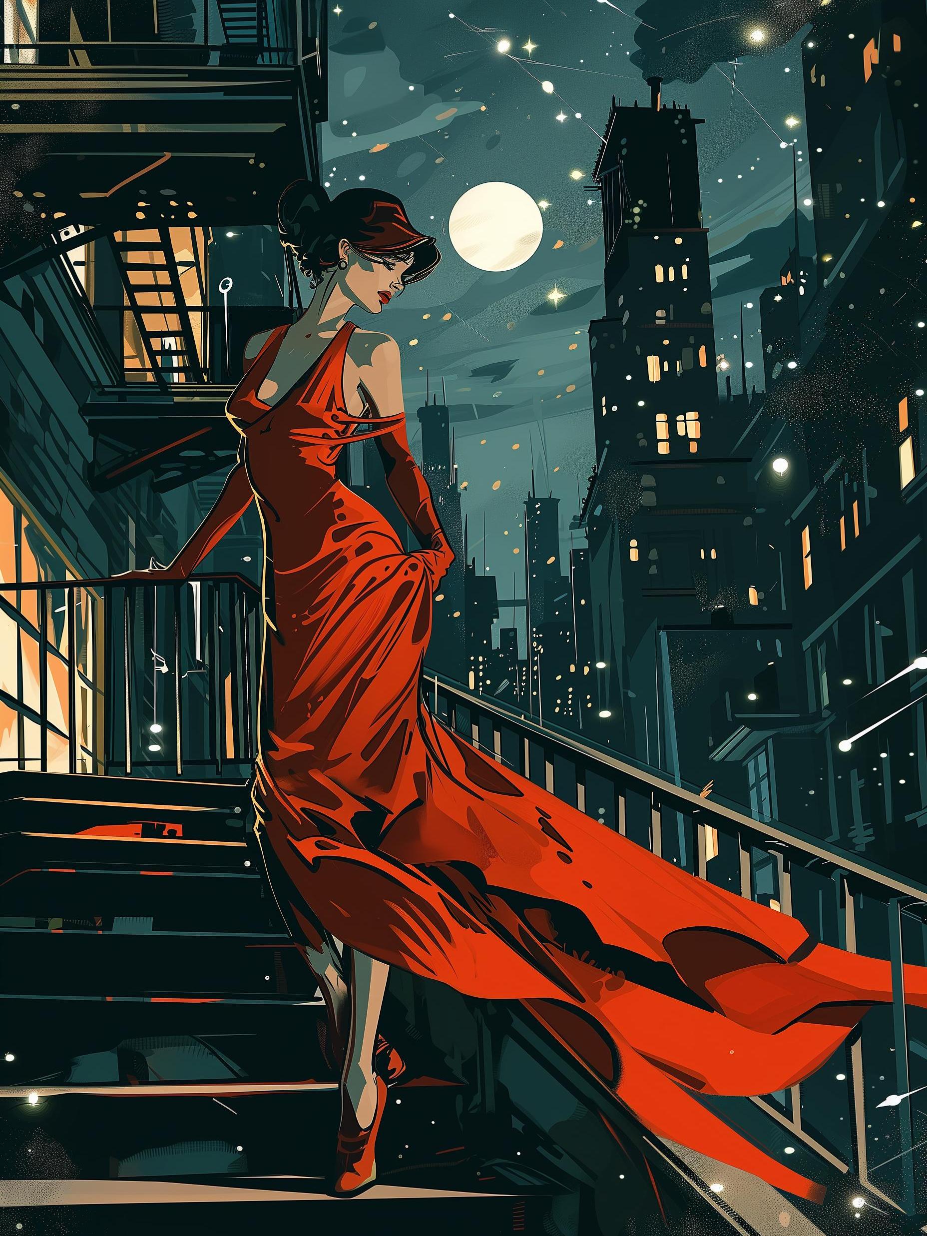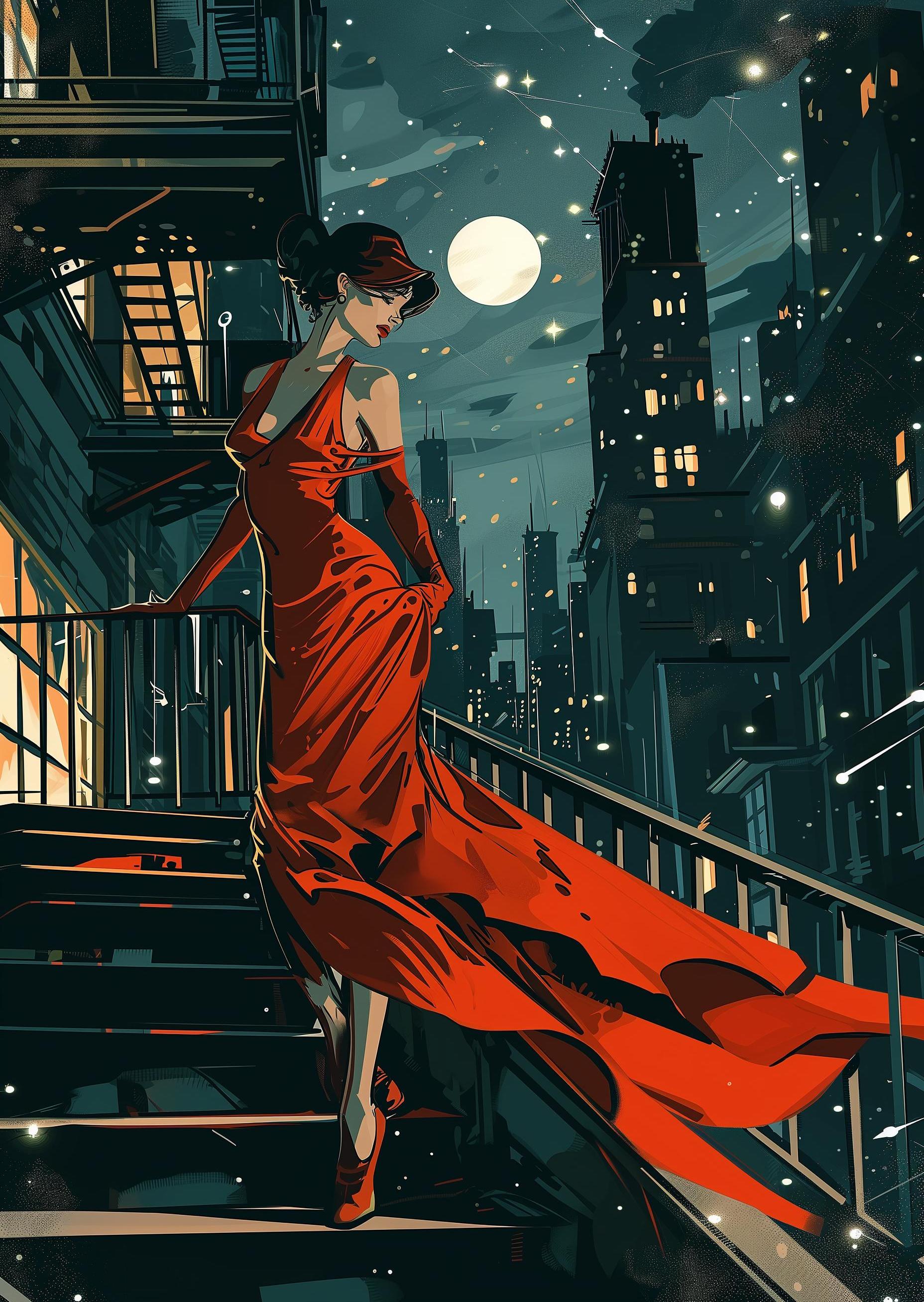 In a bustling city at night, a lady in a striking red dress stands out. She pauses on the stairs, letting her gown flow like a river of silk. The glowing moon casts a soft light, making the stars jealous of her glow. The city lights twinkle, mirroring the excitement in her eyes. She's more than a pretty face; she's a dancer in life's canvas, her steps telling a silent story of delight and confidence. Her hat, tipped just so, hides her thoughts, but her posture speaks of adventure waiting just around the corner. The night is alive, and she's its heartbeat.