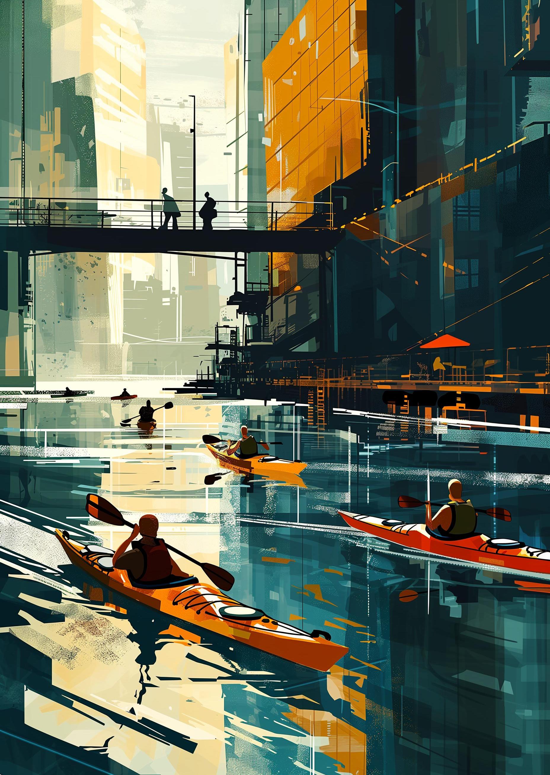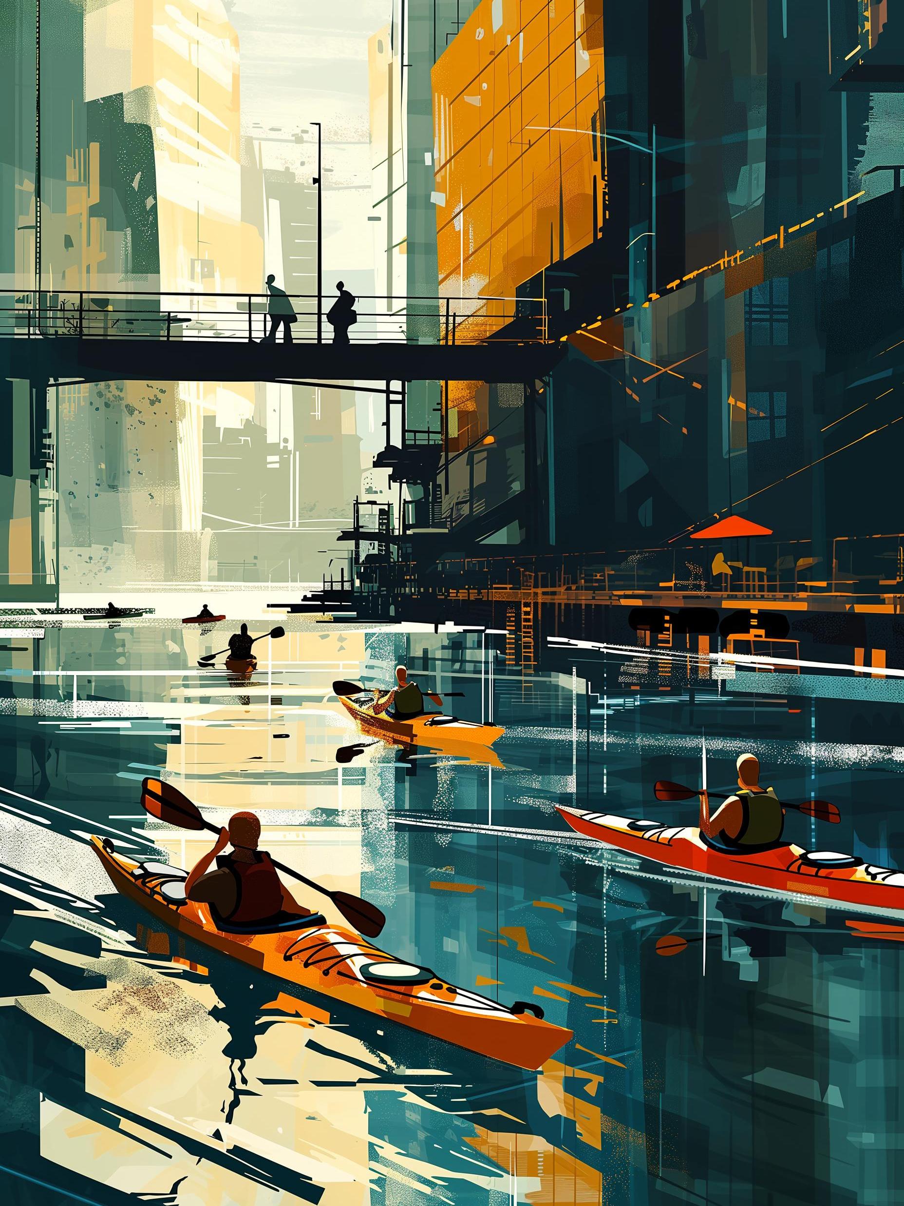 Amid the towering cityscape, a vibrant clash of colors and reflections, a group of kayakers glide through the sunlit waters. Their muscles tense with each stroke, pitting their strength against the current below. They move in unison, yet every paddle is a silent challenge: who will be the smoothest, the swiftest, the one to slice through water like a blade through air? Spectators lean over the bridge, drawn by the sight of these athletes locked in a dance of agility and speed. The city rhythms slow for a moment, captivated by the race below, basking in the shared excitement of a competition that's both fierce and graceful.