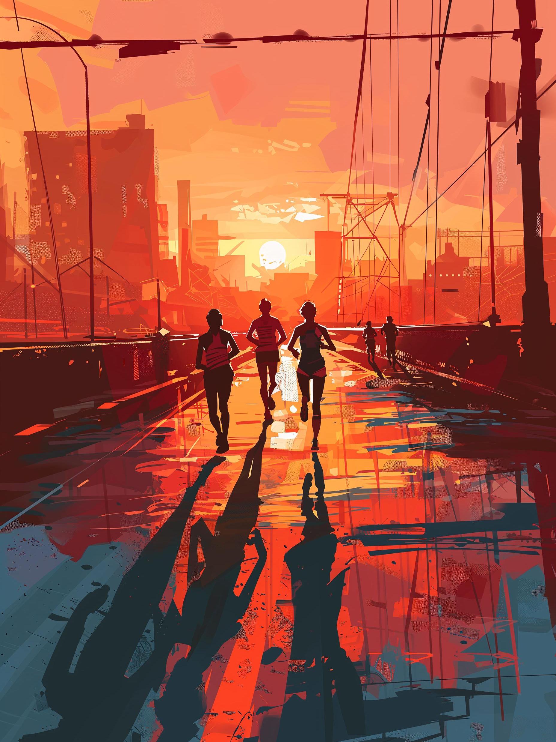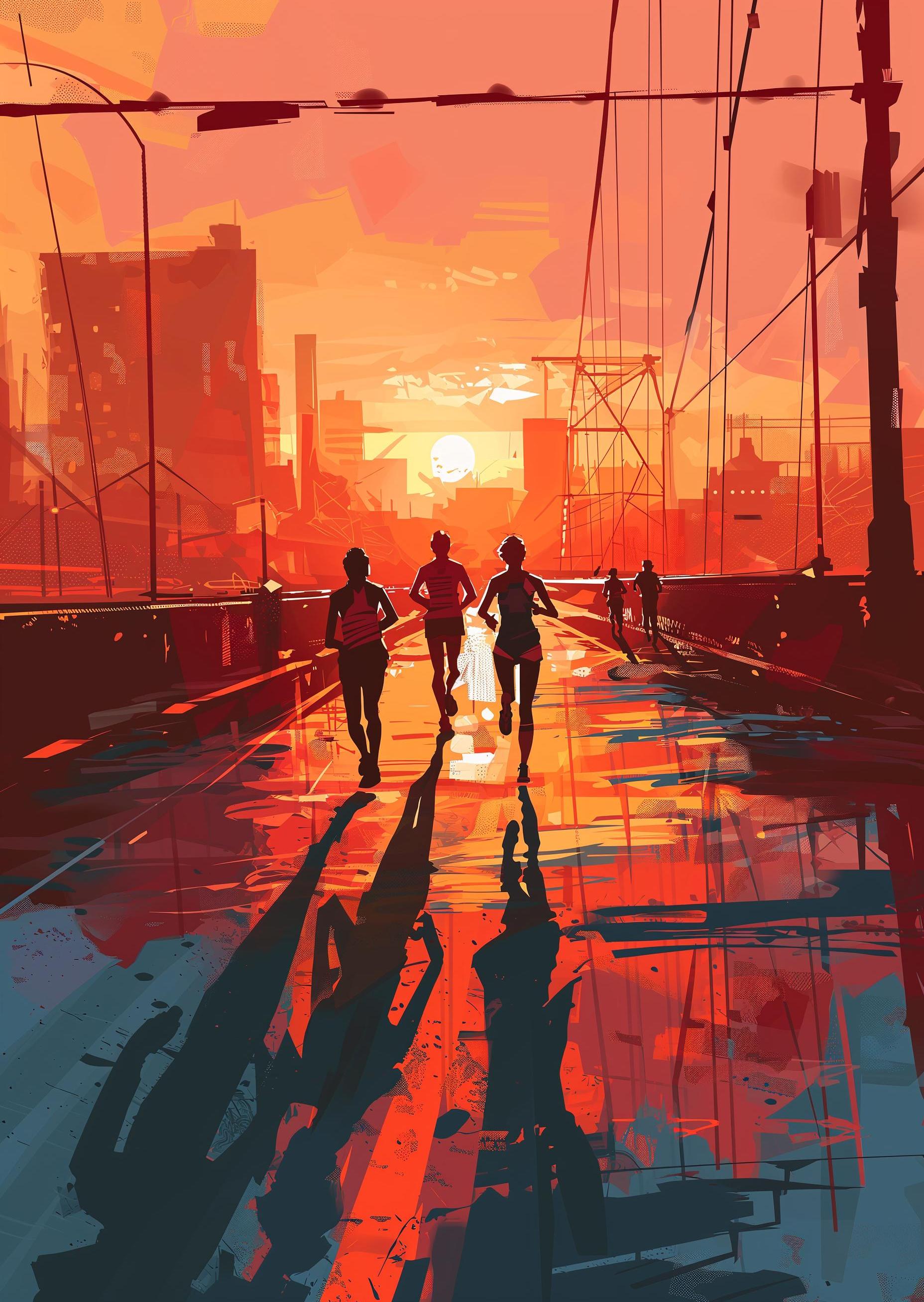 In a city painted with sunset hues, a group of runners hits the pavement, their silhouettes sharp against the colorful backdrop. With every breath, their muscles tense, competing not just with each other but with the failing light. The goal isn't just to win but to outrun the day's end. Each stride carries hope and grit, pushing limits in a dance of speed and endurance. As they race over bridges and streets, their story unfolds—a tale of ambition and challenge, where every second counts and every heartbeat is a drumroll to a finish line that promises both victory and defeat, side by side.
