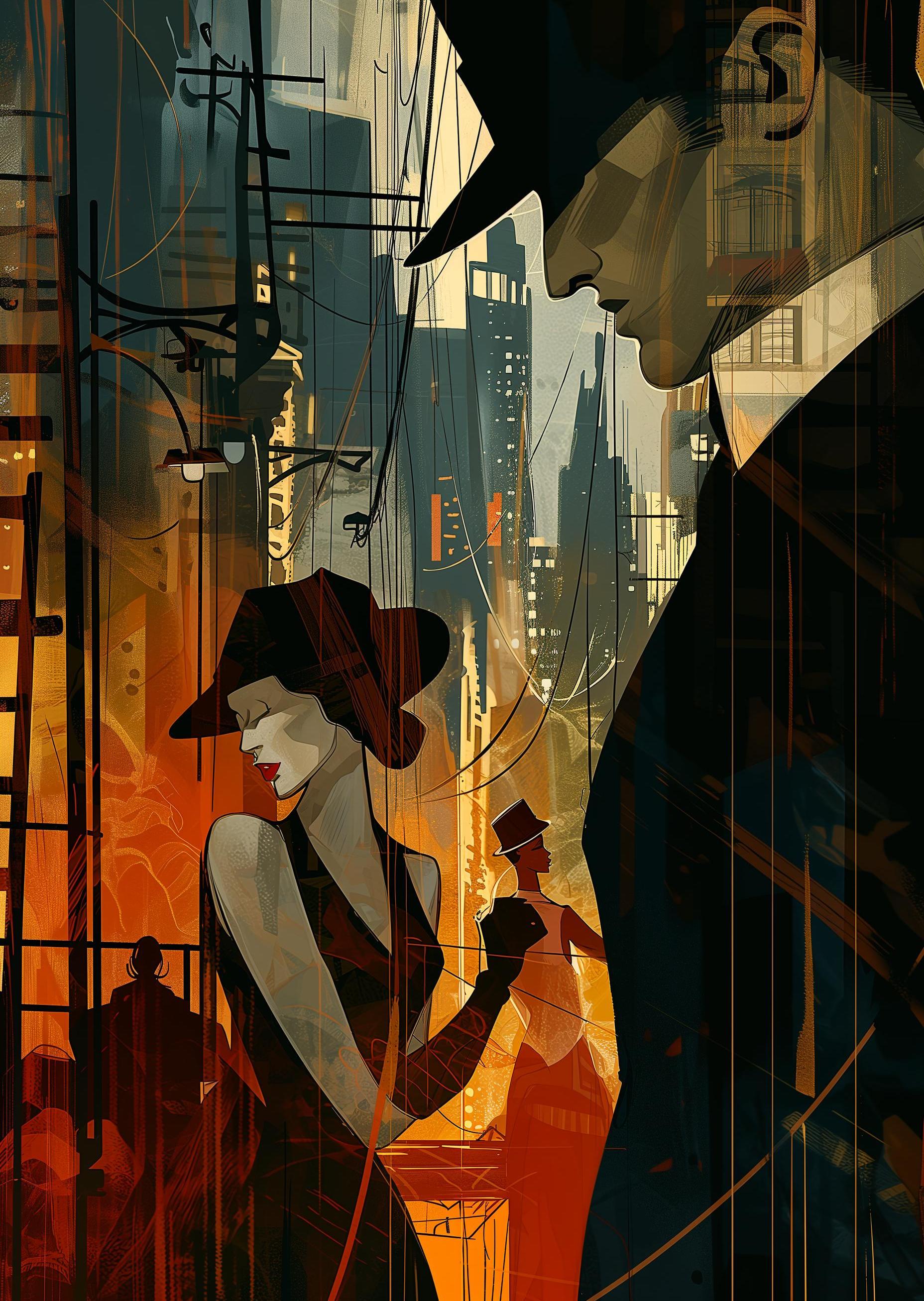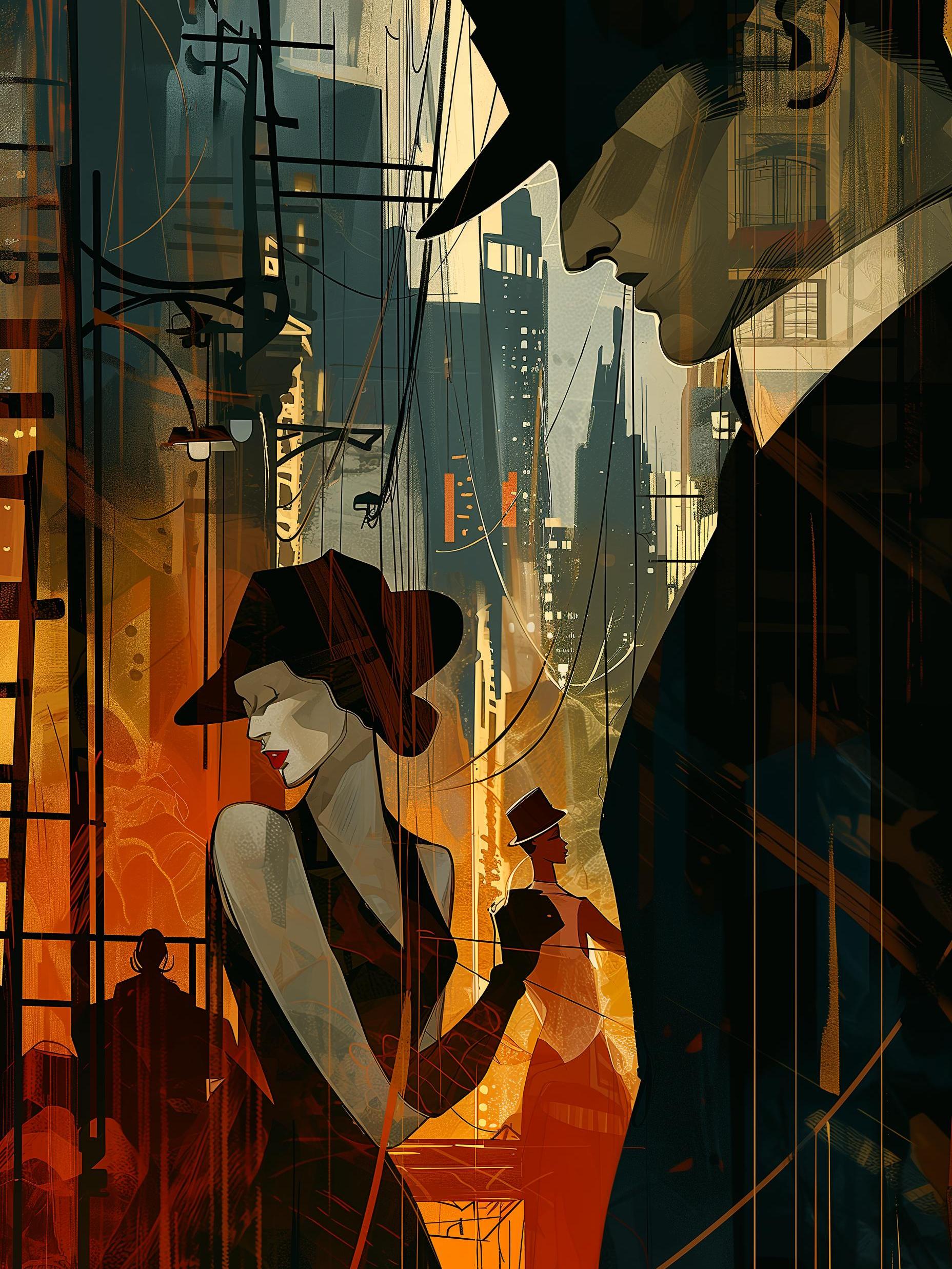 In the heart of the bustling city, under a sky painted with hues of sunset, a tale of two souls unfolds. The picture blends the past with the present, capturing a woman in a classic hat, her gaze lost in thoughts, with the silhouette of a man cast beside her. Their world is a canvas where city lights dance with shadows, and the lines between them blur. Each a mystery to the other, they move through their urban jungle, lives entwined in a dance as old as time, yet as fresh as the city's ever-changing face. The art speaks of moments missed and connections just out of reach, in a city alive with dreams and whispers of might-have-beens.