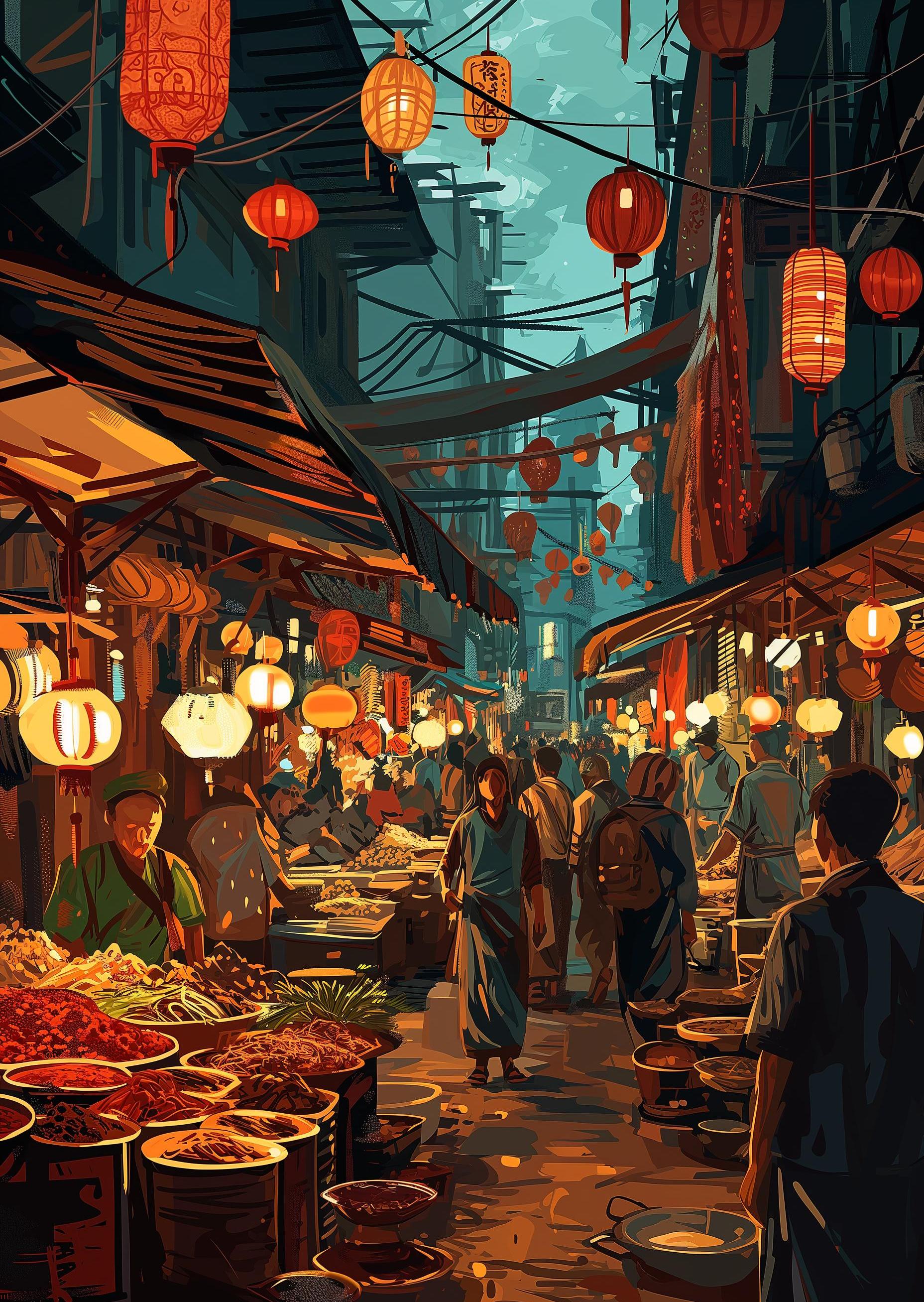 In a bustling market, the air buzzes with life. Rows of stalls glow with red and gold lanterns, casting a warm light on the people below. Aromas of spices and fresh food fill the space, inviting passersby to taste and explore. The chatter of vendors and customers creates a lively tapestry of sound. It's a place where every corner offers a new delight, from heaps of colorful fruits to exotic treats. This vivid scene captures the heart of daily commerce, a dance of culture and community painted in bright hues and lively shades.