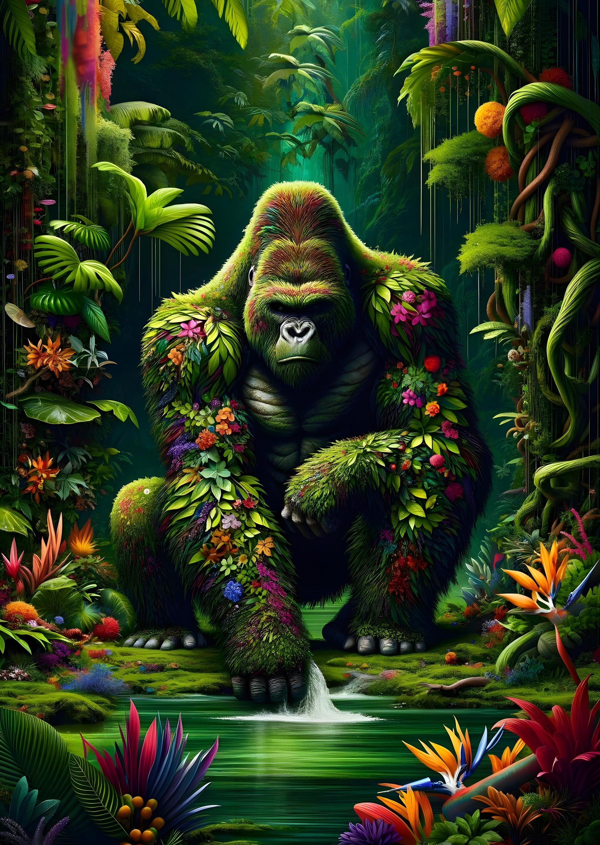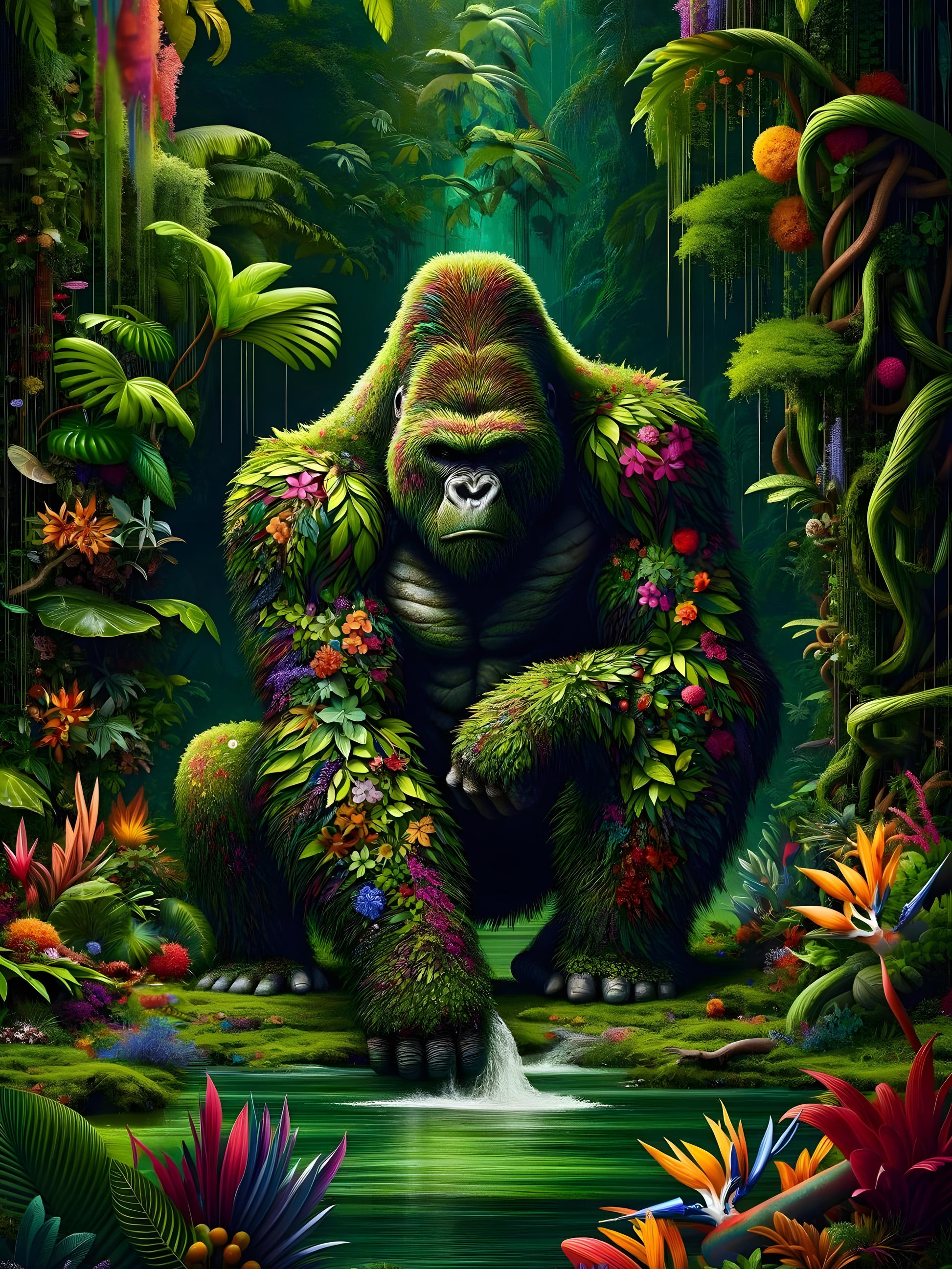 In a vibrant jungle, a great gorilla adorned with a tapestry of blooms stands guardian over a hidden stream. His fur, a living garden, symbolizes the unity of all life, showing our deep ties to nature. As water gently flows from his grasp, it tells a tale of life's flow, reminding us that we're all part of something larger, connected by the cycles of growth and renewal. This gentle giant, powerful yet at peace, teaches us the beauty of coexistence and the richness of a world where every living being contributes to the splendor around us.