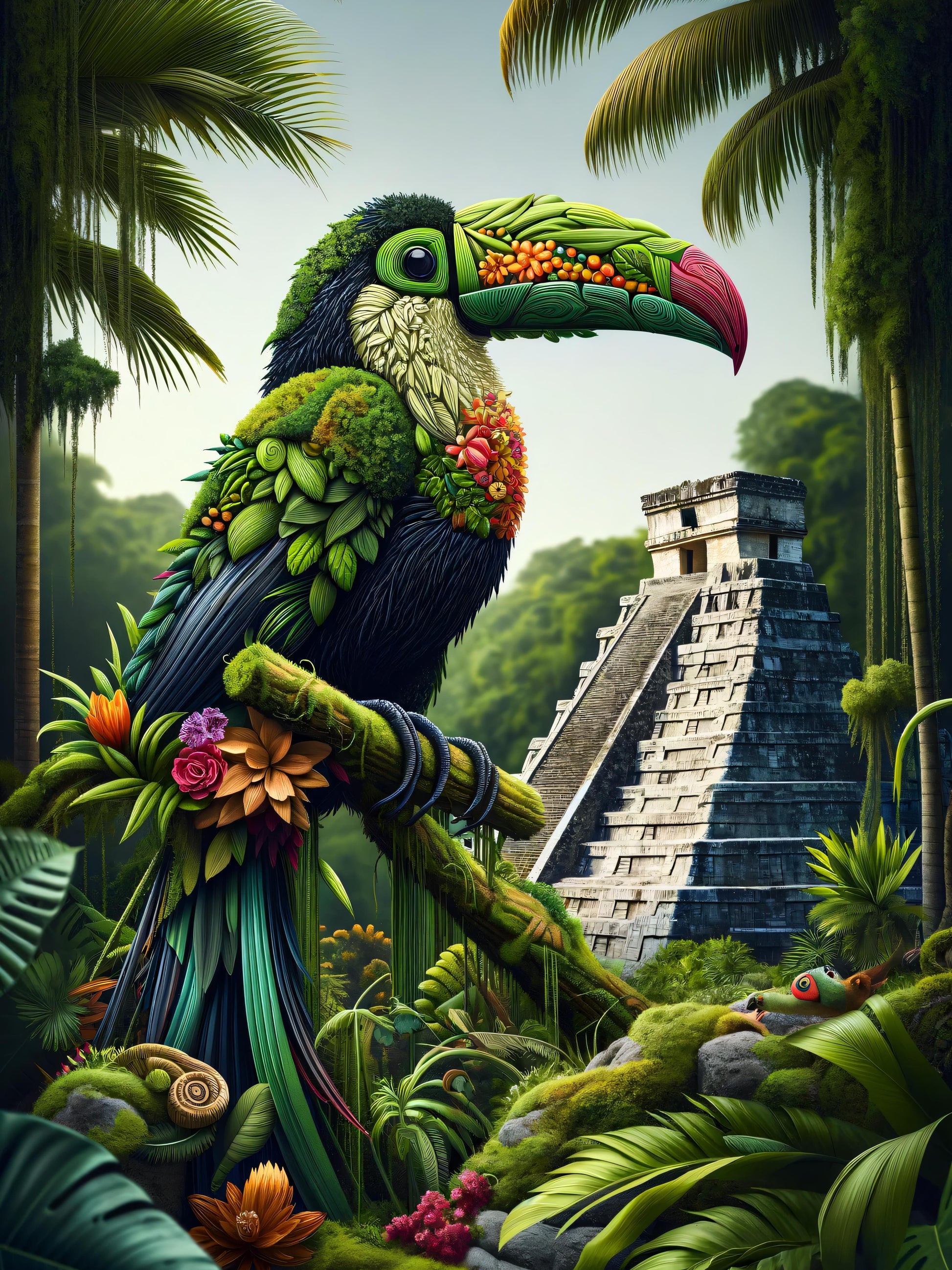 In a lush jungle, a bird not just of feathers, but of vibrant life itself, perches proudly. Its body is a mosaic of the forest's bounty, blending life's diverse beauty into one. Behind, an ancient pyramid stands, a symbol of time's untold stories and the wisdom of past ages. The bird, alive with the present, meets the old structure, reminding us that all times—past, present, and future—are deeply connected. Every leaf, petal, and stone carries the breath of time, urging us to embrace the vivid tapestry of existence. This image is a fable of nature's dance with history, a colorful musing on how life stitches its narratives across the fabric of time.