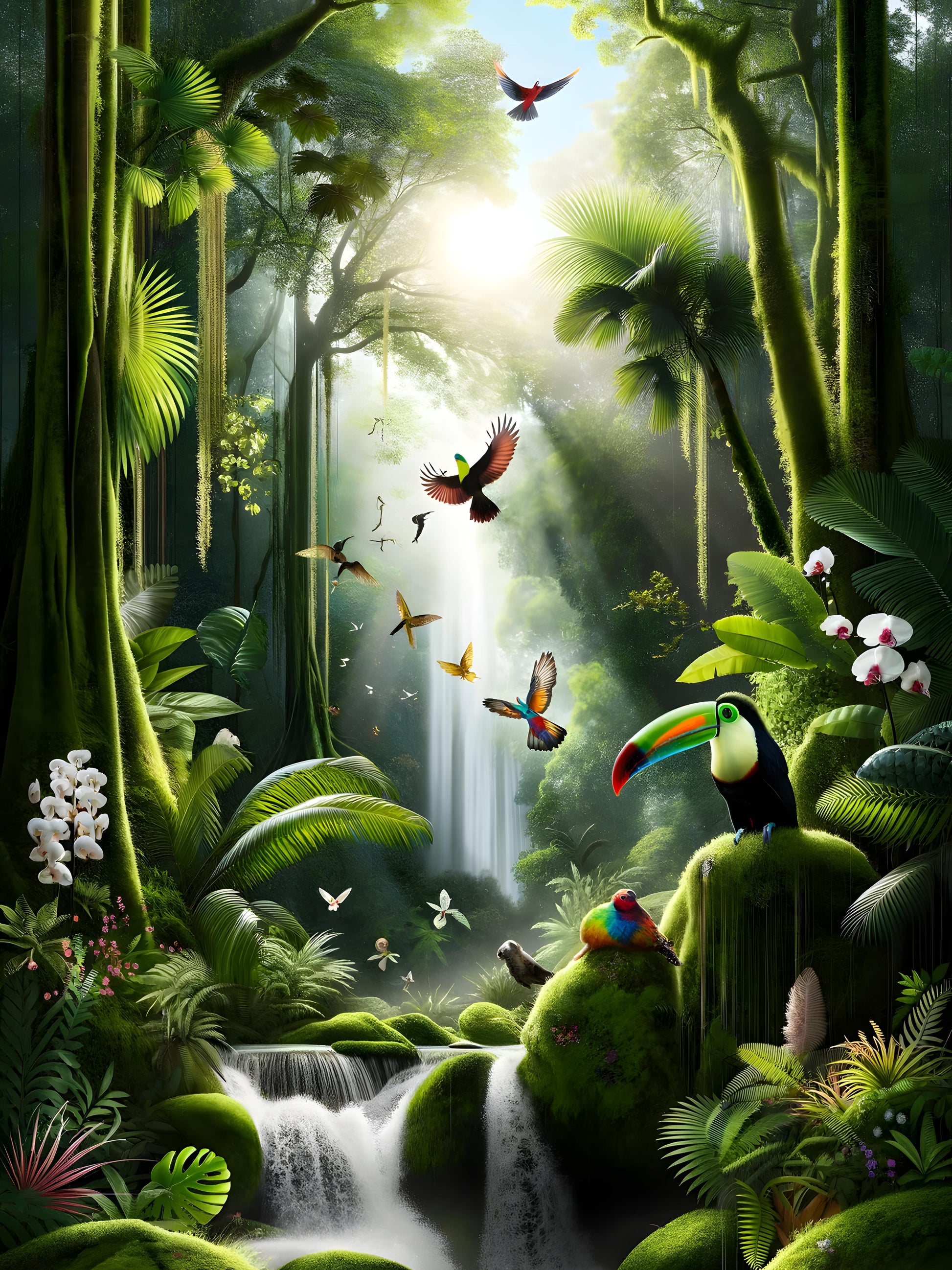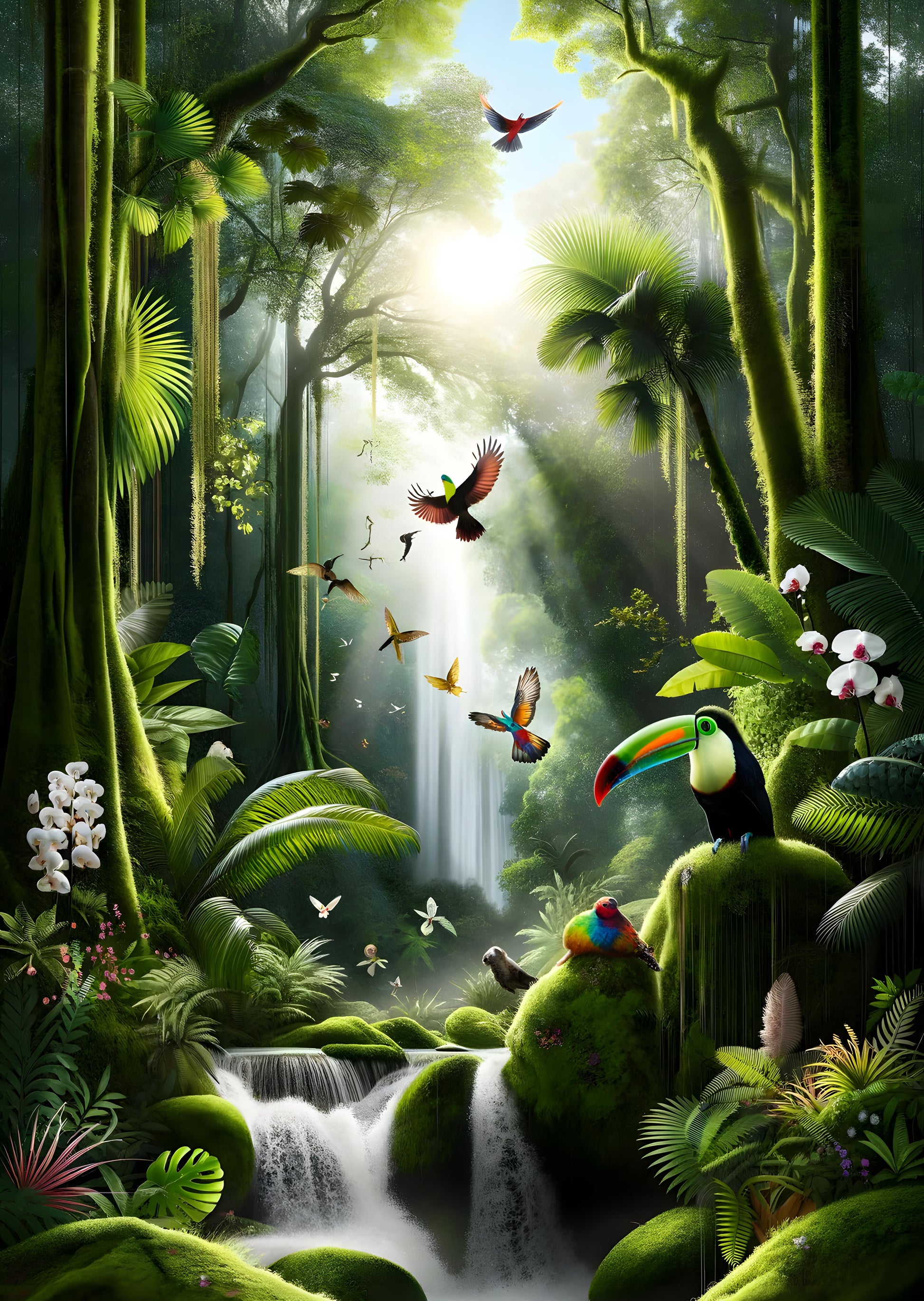 In a lush rainforest, the sun pierces through dense foliage, casting beams of light that dance on mist from a cascading waterfall. Vibrant birds take flight, their feathers a mosaic of colors flitting through the air, while a toucan perches majestically, overseeing the spectacle. Exotic flowers bloom with pure white orchids standing out against the verdant greenery. The energy of life pulses through the scenery, a testament to the untamed beauty where flora and fauna coexist in a dance as old as time.