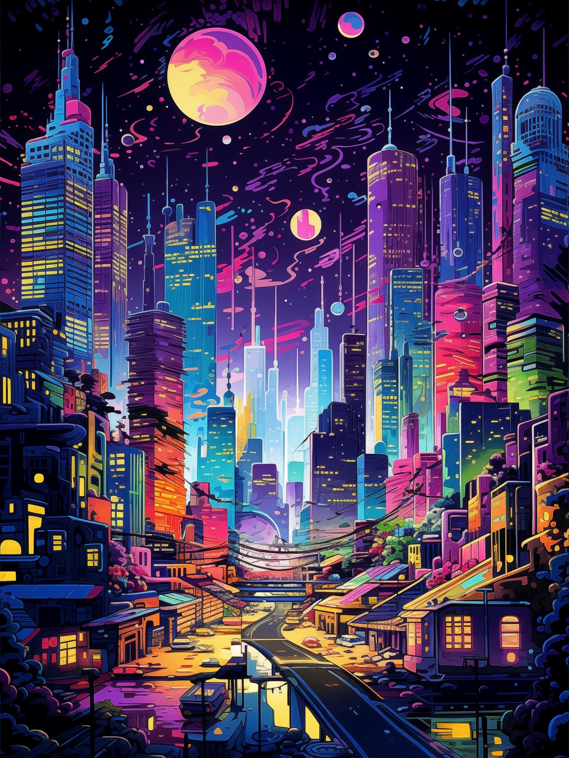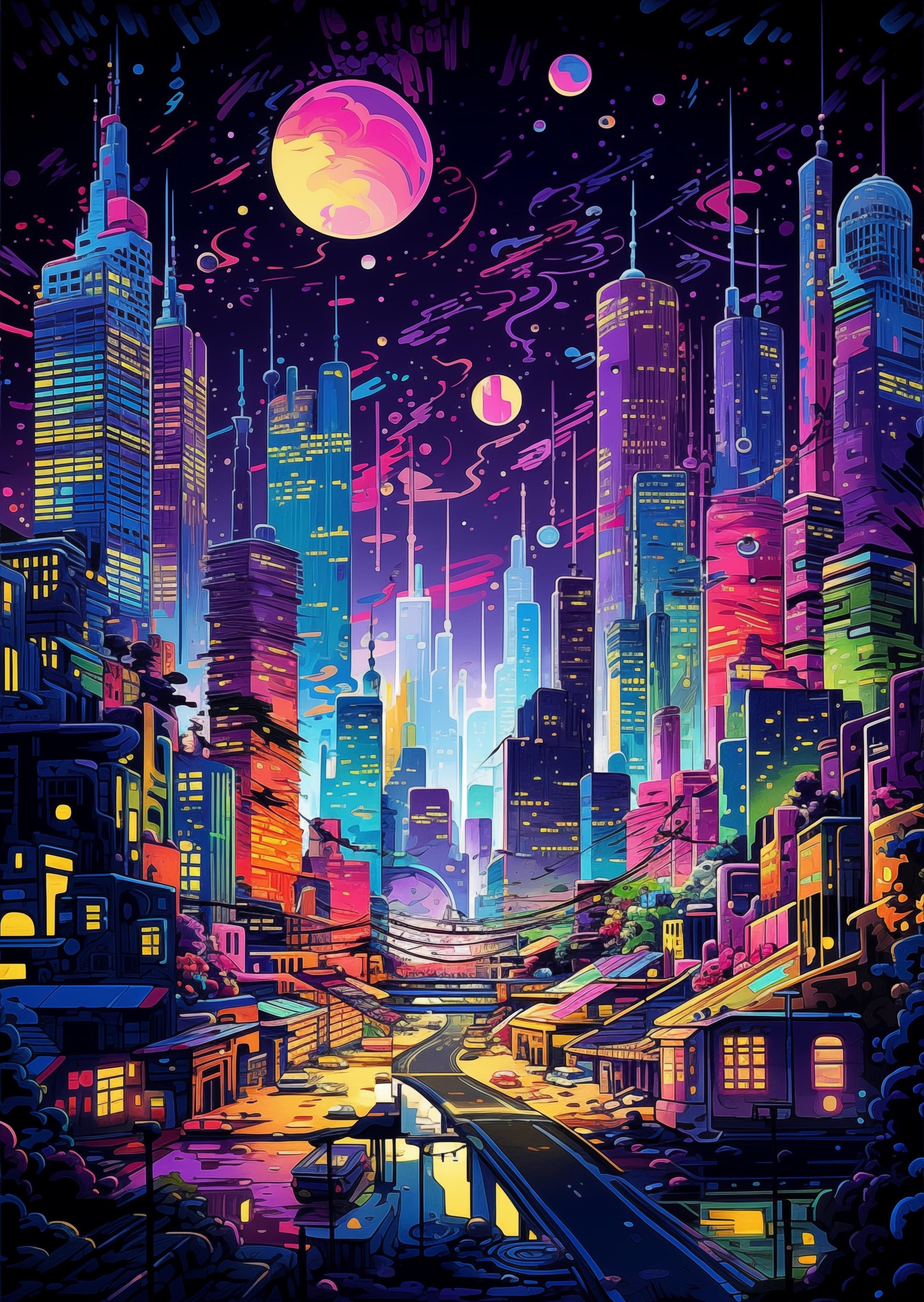 In a vibrant metropolis ablaze with neon lights, futuristic skyscrapers reach for the stars under a sky painted with celestial bodies. A colossal moon glows amidst drifting orbs and cosmic swirls, casting a warm, otherworldly light on the urban splendor below. The architecture melds tradition with science fiction, suggesting a society that honors its past while boldly stepping into the future. At ground level, quaint houses line the streets, connected by flowing waterways and bridges, hinting at a world where nature and technology exist in a dynamic, visual symphony. This city, alive with color and energy, seems to be a nexus of different times and spaces, an urban utopia in an uncharted universe.