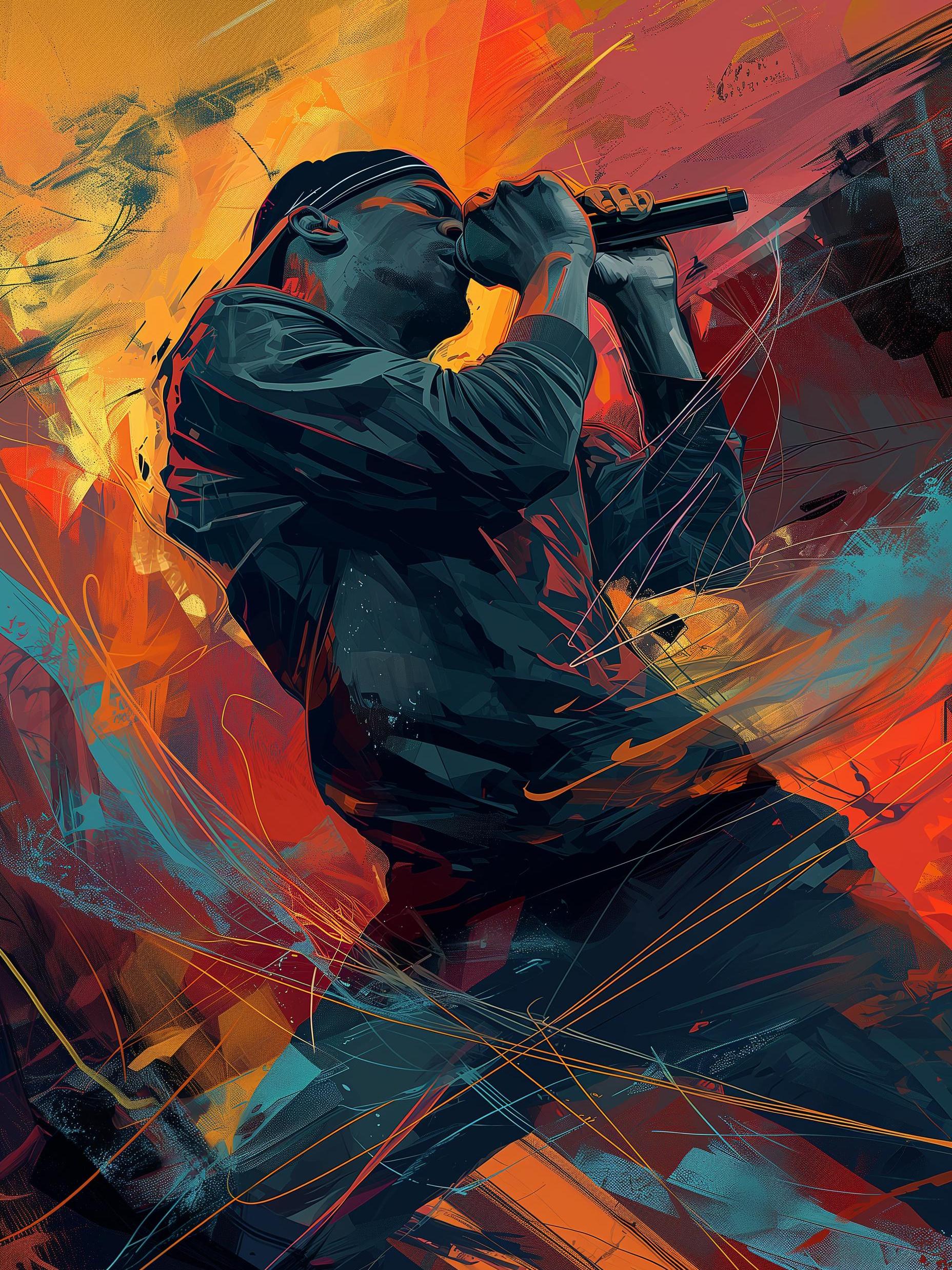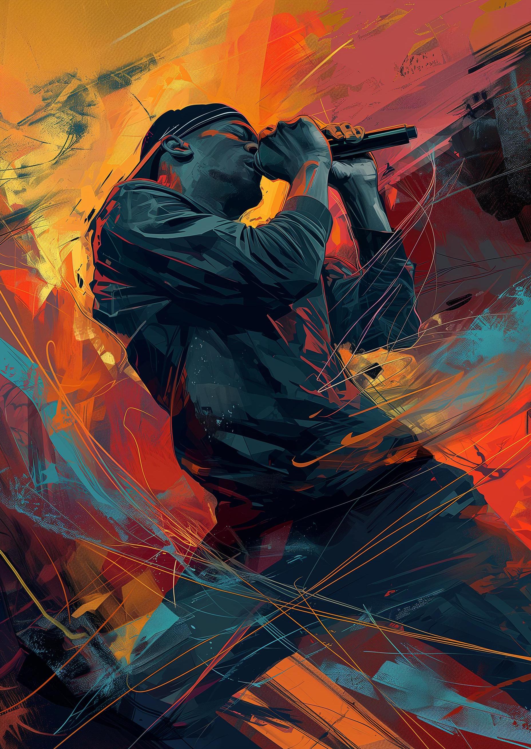 In a burst of colors, a musician pours his soul into the wind. His fingers grip the mic, a silent roar escaping through bold strokes and vivid splashes. Around him, the air dances with his passion, painting the moment. Each color tells a secret tale of struggle, joy, and dreams unchained. This is his story, a melody crafted not just in sound but in visual fire, a fierce declaration of life and art melding in a single frame. With eyes closed, he's more than a performer; he's a painter, his voice the brush, his emotion the palette.